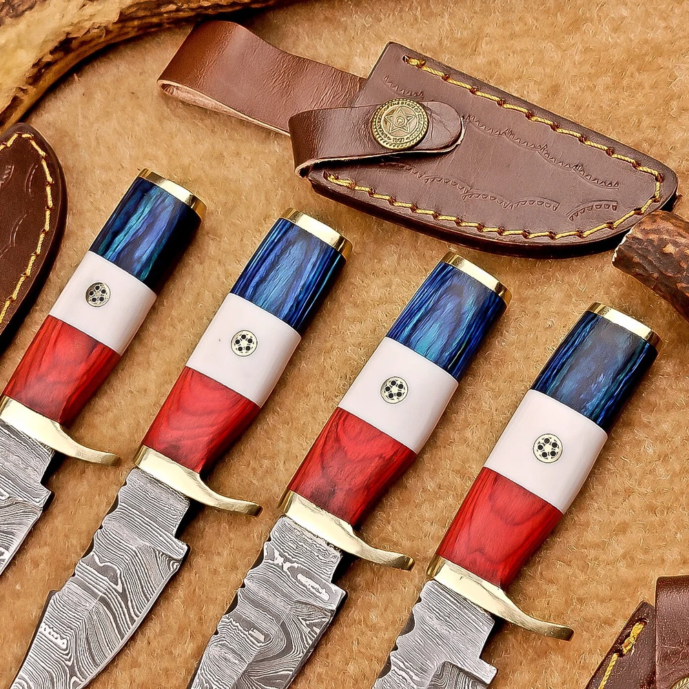 LOT OF 4 PCS! Handmade Damascus Hunting Knives – Multicolor Wood Handles Specifications: Overall Length: 6.00" Blade Thickness: ~4 mm Blade Material: Damascus Steel Handle Material: Multicolor wood and camel bone with mosaic pin with hand casted brass bolster. Includes: Leather sheaths. Blade Craftsmanship: Blades are made from 1095 & 15N20 High Carbon Tool Steel with over 256 layers and a hardness of 58-60 HRC for durability and sharpness. Spine of the blade tang has excellent fire work Care Instructions: Sharpen with a Diamond Wet Stone at a 20-degree angle. Clean with soap and water, dry thoroughly, and apply gun oil. Store away from the sheath to prevent rust. Important Notes for Buyers: Verify your country’s import regulations before purchase. Customs duties, if any, are the buyer’s responsibility. Shipping & Returns: Free shipping included. 14-day return policy applies. Contact Us: Message us anytime. We respond within 24 hours.
