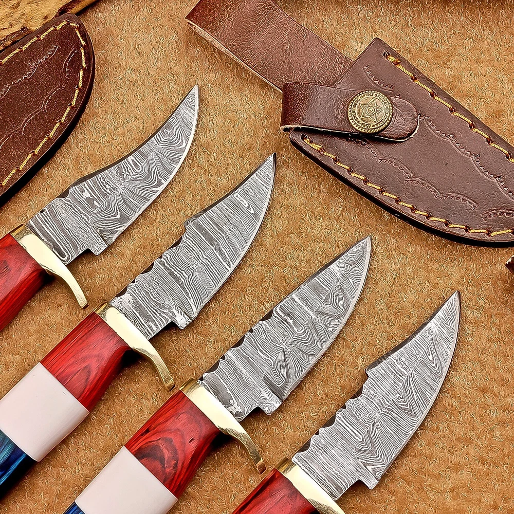 LOT OF 4 PCS! Handmade Damascus Hunting Knives – Multicolor Wood Handles Specifications: Overall Length: 6.00" Blade Thickness: ~4 mm Blade Material: Damascus Steel Handle Material: Multicolor wood and camel bone with mosaic pin with hand casted brass bolster. Includes: Leather sheaths. Blade Craftsmanship: Blades are made from 1095 & 15N20 High Carbon Tool Steel with over 256 layers and a hardness of 58-60 HRC for durability and sharpness. Spine of the blade tang has excellent fire work Care Instructions: Sharpen with a Diamond Wet Stone at a 20-degree angle. Clean with soap and water, dry thoroughly, and apply gun oil. Store away from the sheath to prevent rust. Important Notes for Buyers: Verify your country’s import regulations before purchase. Customs duties, if any, are the buyer’s responsibility. Shipping & Returns: Free shipping included. 14-day return policy applies. Contact Us: Message us anytime. We respond within 24 hours.