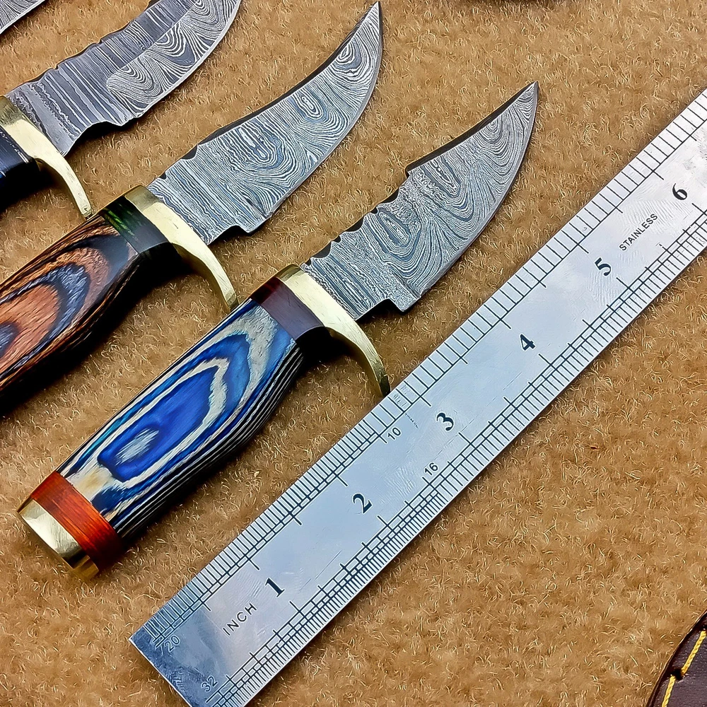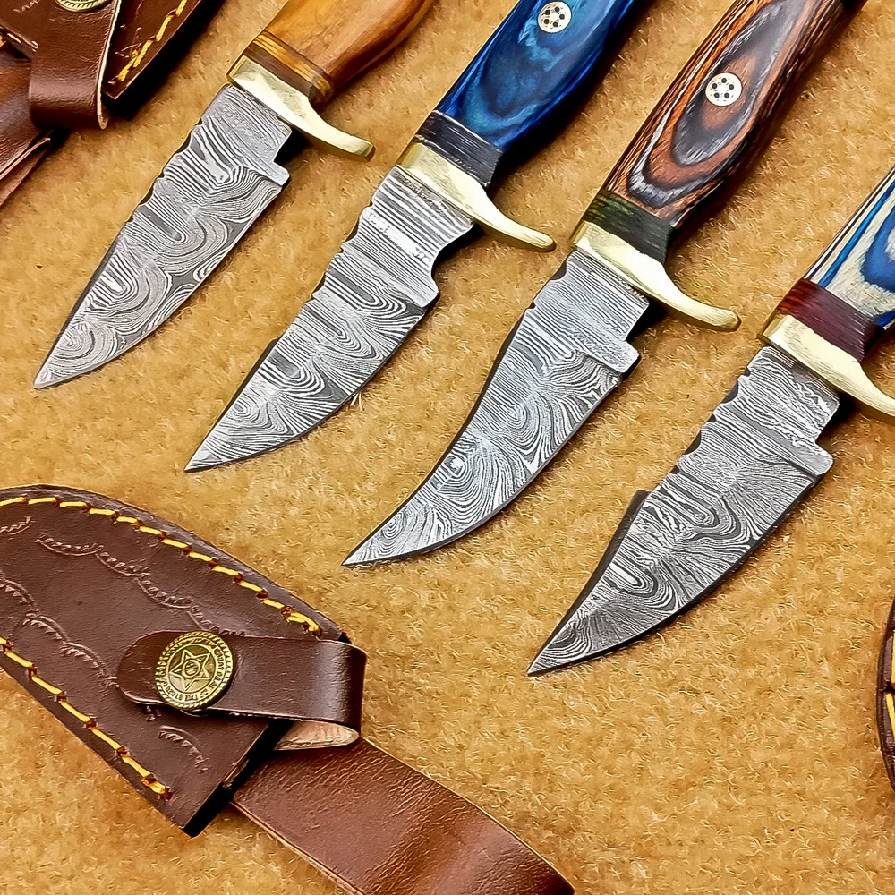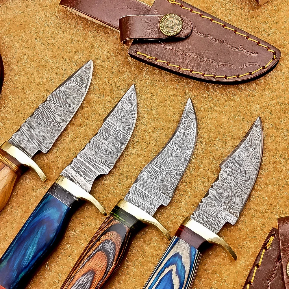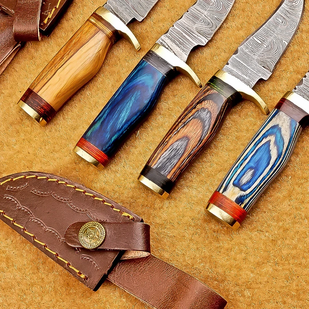 LOT OF 4 PCS! Handmade Damascus Hunting Knives – Multicolor Wood Handles Specifications: Overall Length: 6.00" Blade Thickness: ~4 mm Blade Material: Damascus Steel Handle Material: Multicolor wood with mosaic pins & hand casted brass bolster. Includes: Leather sheaths Blade Craftsmanship: Blades are made from 1095 & 15N20 High Carbon Tool Steel with over 256 layers and a hardness of 58-60 HRC for durability and sharpness. Spine of the blade tang has Excellent fire work Care Instructions: Sharpen with a Diamond Wet Stone at a 20-degree angle. Clean with soap and water, dry thoroughly, and apply gun oil. Store away from the sheath to prevent rust. Important Notes for Buyers: Verify your country’s import regulations before purchase. Customs duties, if any, are the buyer’s responsibility. Shipping & Returns: Free shipping included. 14-day return policy applies. Contact Us: Message us anytime. We respond within 24 hours.