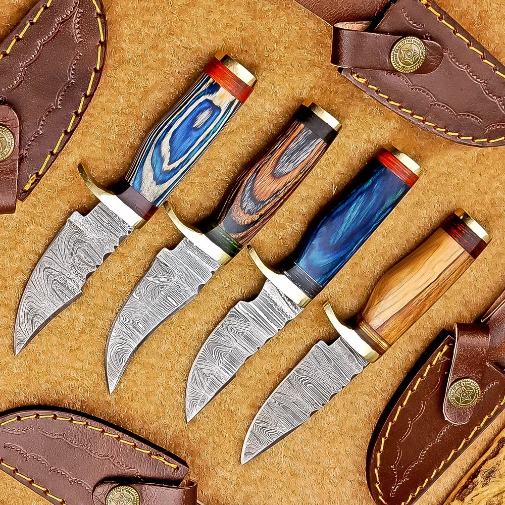 4 Pcs Damascus Blade Skinner Knives Set | 6" | Hardwood , Leather Sheath IT-837