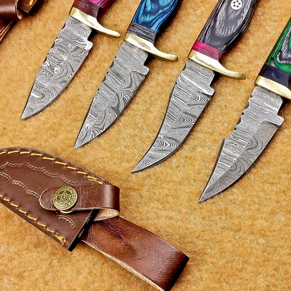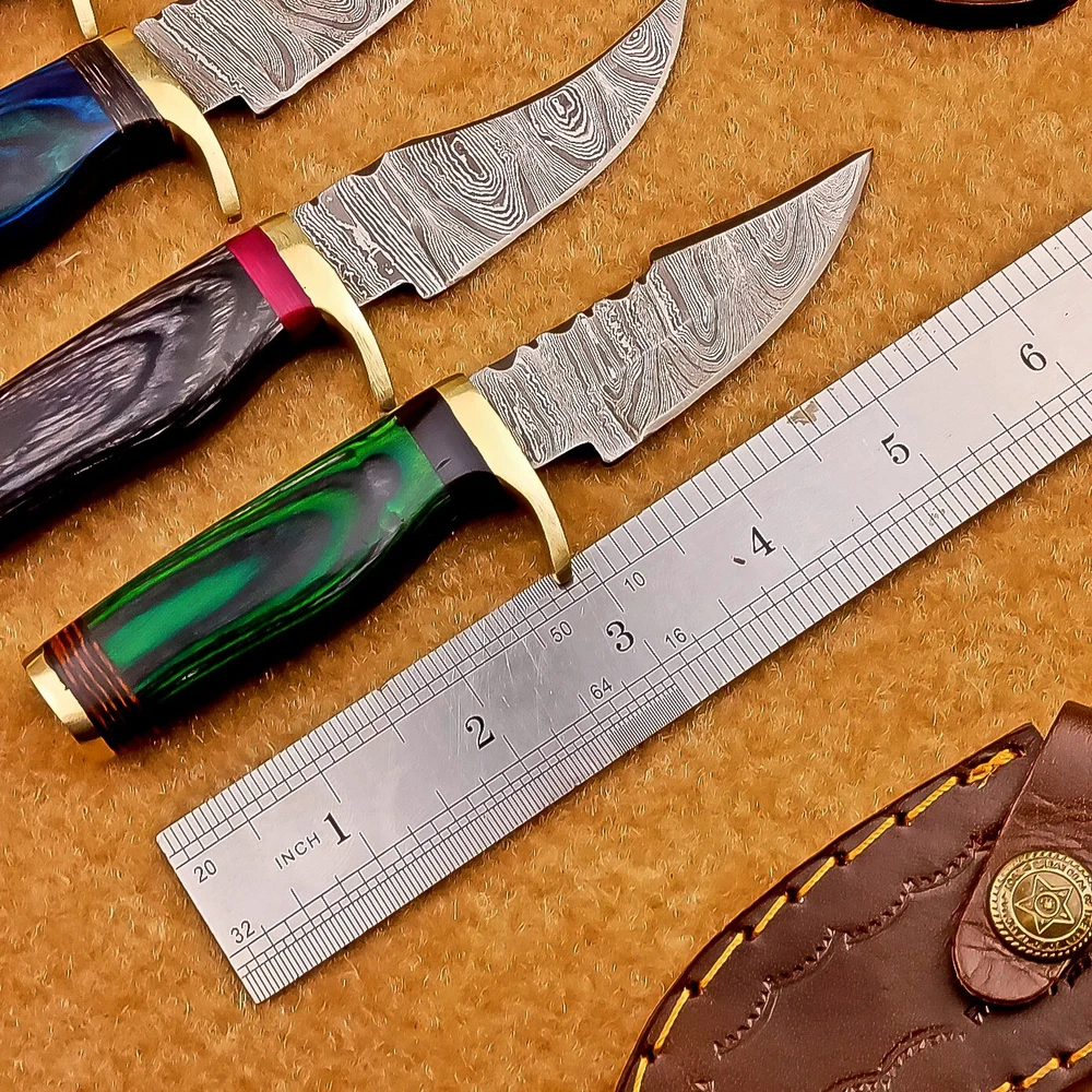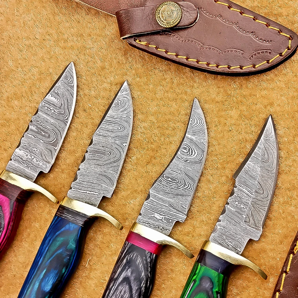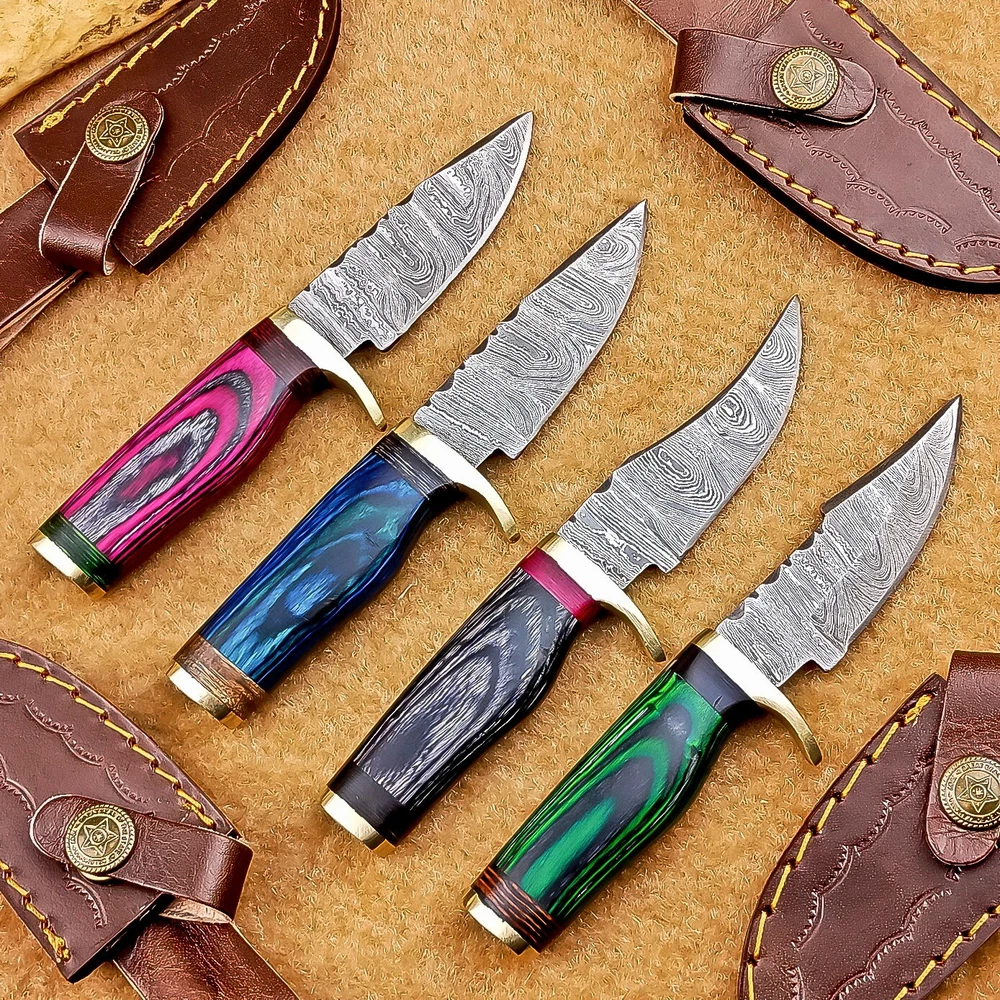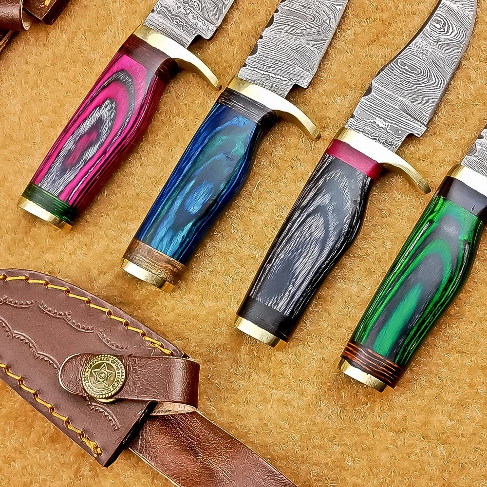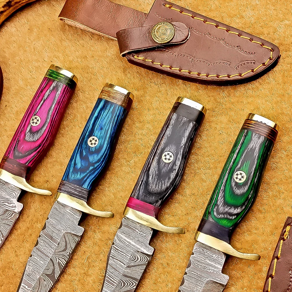 LOT OF 4 PCS! Handmade Damascus Hunting Knives – Multicolor Wood Handles Specifications: Overall Length: 6.00" Blade Thickness: ~4 mm Blade Material: Damascus Steel Handle Material: Multicolor wood with mosaic pins & hand casted brass bolster. Includes: Leather sheaths Blade Craftsmanship: Blades are made from 1095 & 15N20 High Carbon Tool Steel with over 256 layers and a hardness of 58-60 HRC for durability and sharpness. Spine of the blade tang has Excellent fire work Care Instructions: Sharpen with a Diamond Wet Stone at a 20-degree angle. Clean with soap and water, dry thoroughly, and apply gun oil. Store away from the sheath to prevent rust. Important Notes for Buyers: Verify your country’s import regulations before purchase. Customs duties, if any, are the buyer’s responsibility. Shipping & Returns: Free shipping included. 14-day return policy applies. Contact Us: Message us anytime. We respond within 24 hours.