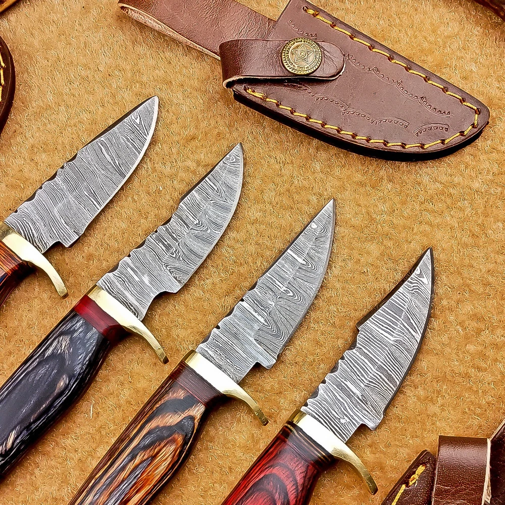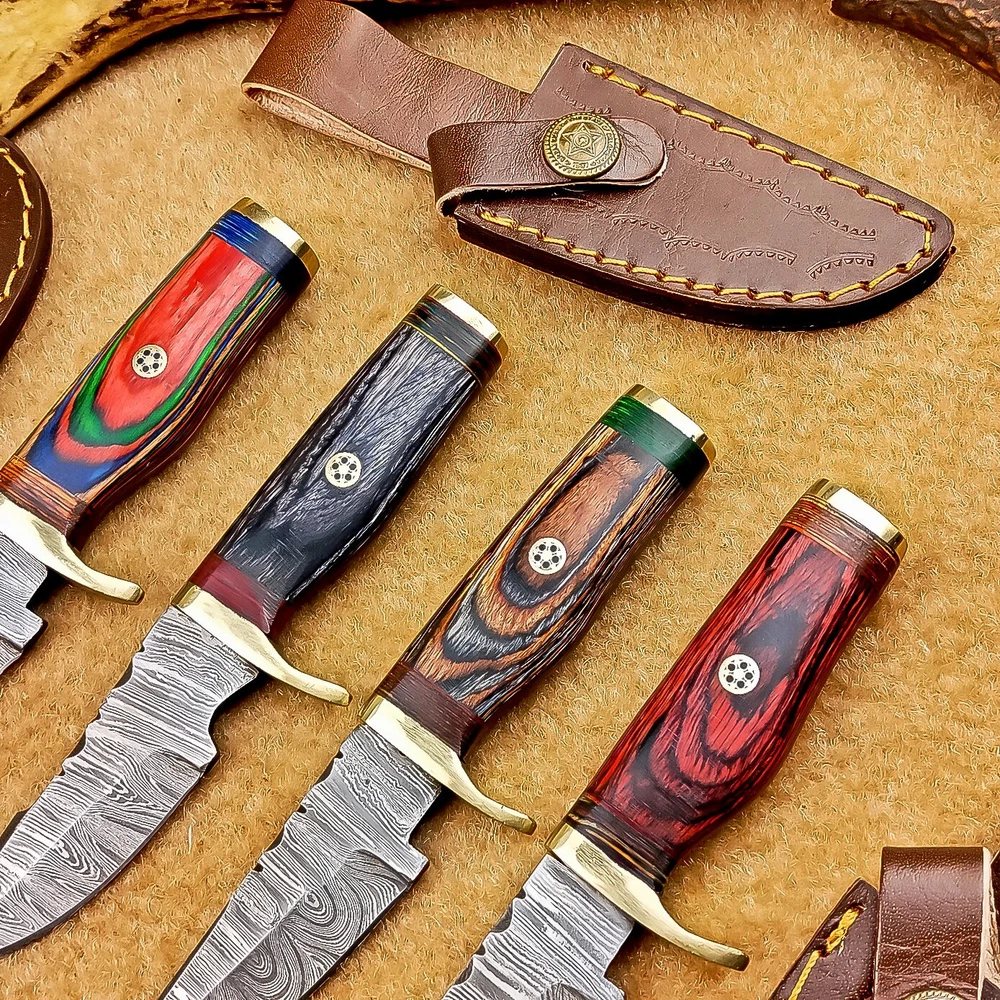 LOT OF 4 PCS! Handmade Damascus Hunting Knives – Multicolor Wood Handles Specifications: Overall Length: 6.00" Blade Thickness: ~4 mm Blade Material: Damascus Steel Handle Material: Multicolor wood with mosaic pins & hand casted brass bolster. Includes: Leather sheaths Blade Craftsmanship: Blades are made from 1095 & 15N20 High Carbon Tool Steel with over 256 layers and a hardness of 58-60 HRC for durability and sharpness. Spine of the blade tang has Excellent fire work Care Instructions: Sharpen with a Diamond Wet Stone at a 20-degree angle. Clean with soap and water, dry thoroughly, and apply gun oil. Store away from the sheath to prevent rust. Important Notes for Buyers: Verify your country’s import regulations before purchase. Customs duties, if any, are the buyer’s responsibility. Shipping & Returns: Free shipping included. 14-day return policy applies. Contact Us: Message us anytime. We respond within 24 hours.