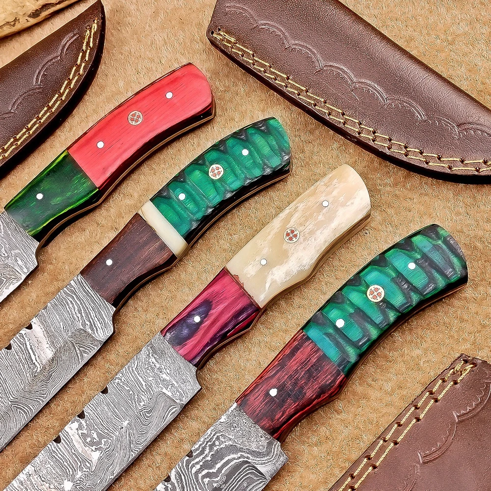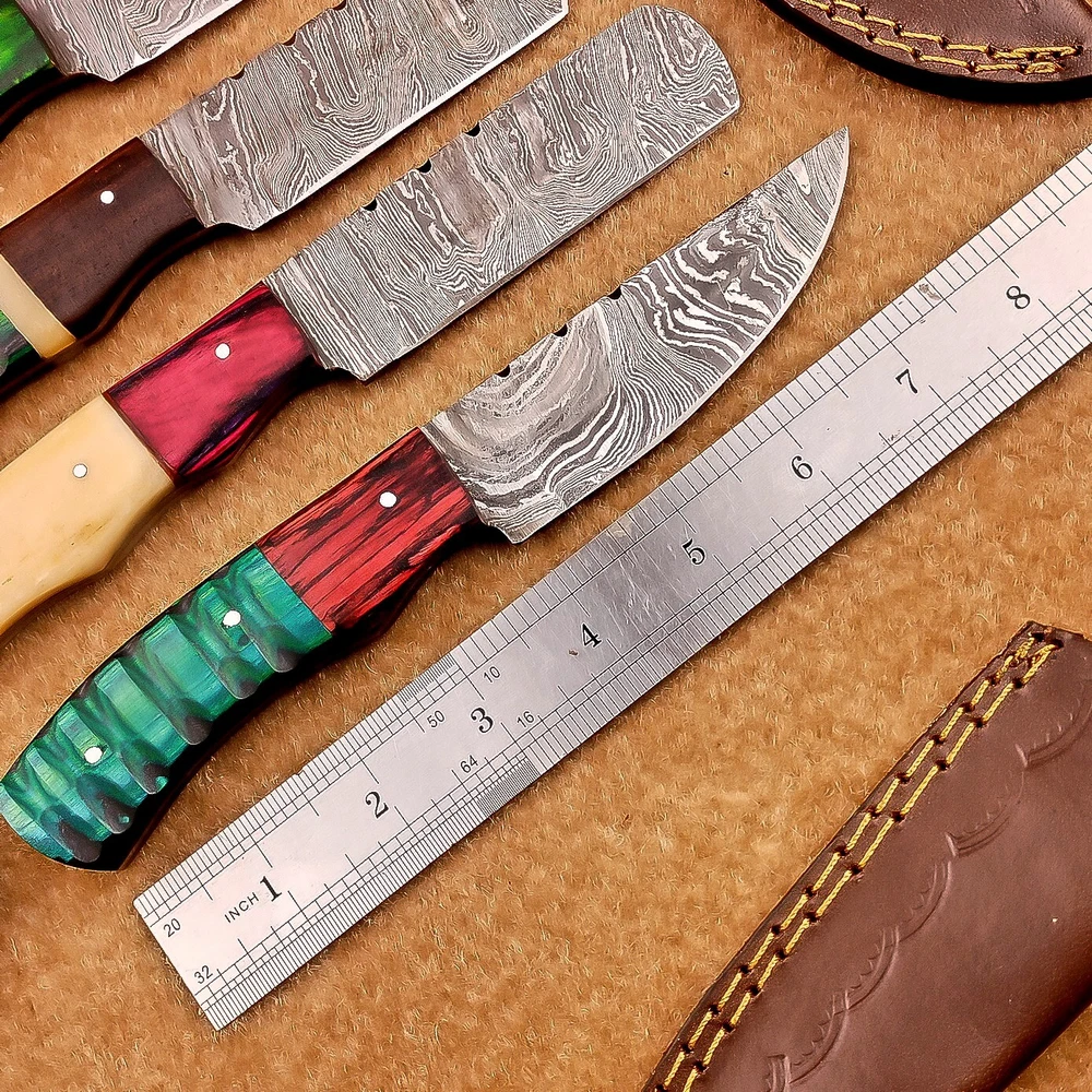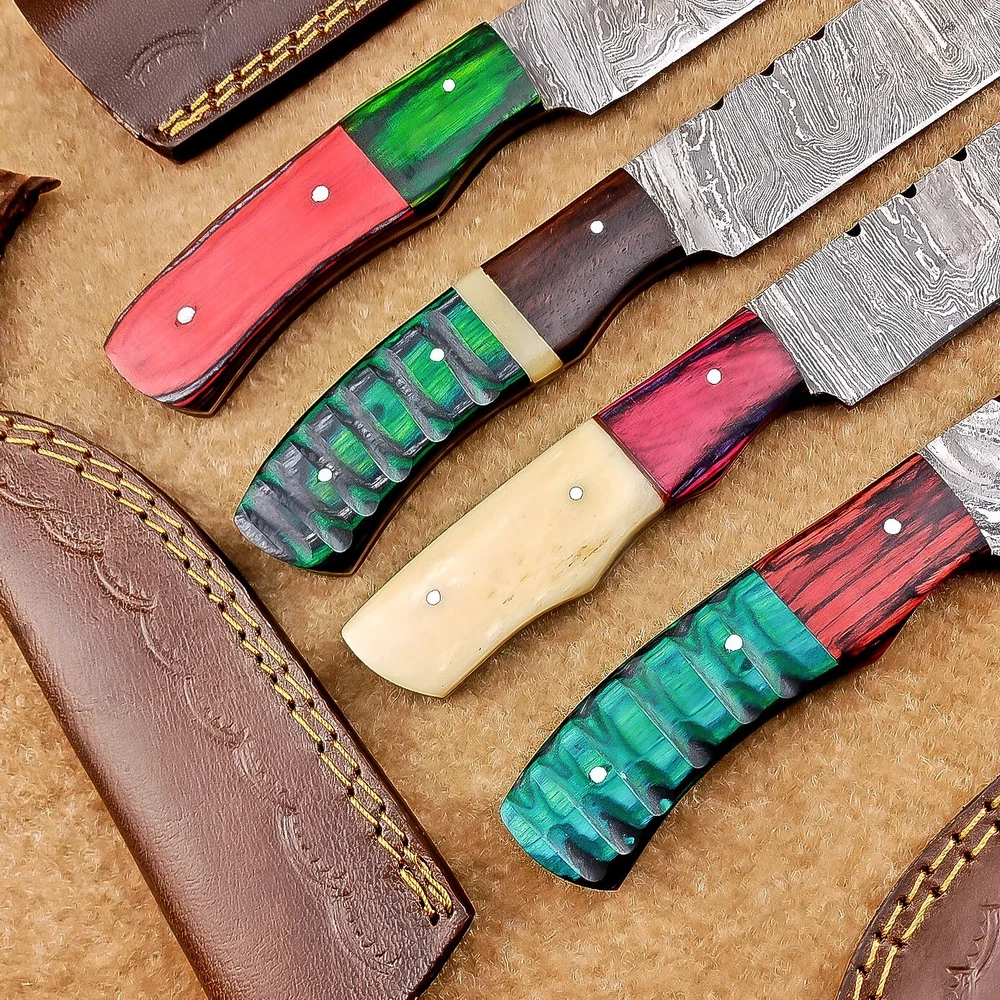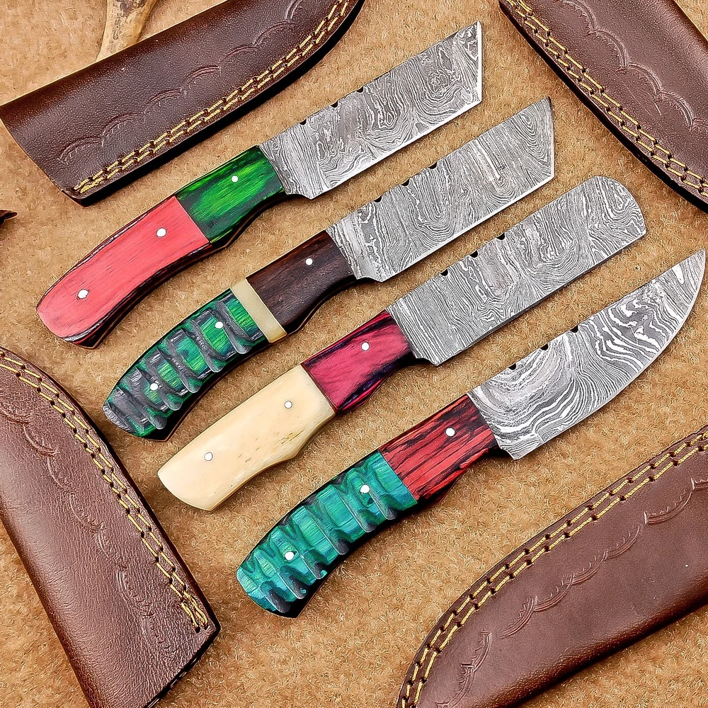 LOT OF 4 PCS! Handmade Damascus Hunting Knives , Skinner Knives Specifications: Overall Length: 8.50" Blade Thickness: ~4 mm Blade Material: Damascus Steel Handle Material: Hard wood and Resin / camel bone with brass pins mosaic pin Includes: Leather sheaths Blade Craftsmanship: Blades are made from 1095 & 15N20 High Carbon Tool Steel with over 256 layers and a hardness of 58-60 HRC for durability and sharpness. Spine of the blade tang has excellent fire work. Care Instructions: Sharpen with a Diamond Wet Stone at a 20-degree angle. Clean with soap and water, dry thoroughly, and apply gun oil. Store away from the sheath to prevent rust. Important Notes for Buyers: Verify your country’s import regulations before purchase. Customs duties, if any, are the buyer’s responsibility. Shipping & Returns: Free shipping included. 14-day return policy applies. Contact Us: Message us anytime. We respond within 24 hours.