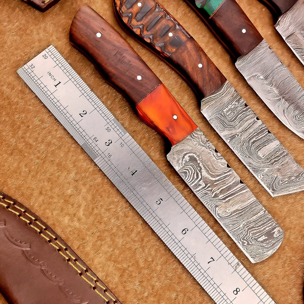 LOT OF 4 PCS! Handmade Damascus Hunting Knives , Skinner Knives Specifications: Overall Length: 8.0" Blade Thickness: ~4 mm Blade Material: Damascus Steel Handle Material: Hard wood with brass pins mosaic pin Includes: Leather sheaths Blade Craftsmanship: Blades are made from 1095 & 15N20 High Carbon Tool Steel with over 256 layers and a hardness of 58-60 HRC for durability and sharpness. Spine of the blade tang has excellent fire work. Care Instructions: Sharpen with a Diamond Wet Stone at a 20-degree angle. Clean with soap and water, dry thoroughly, and apply gun oil. Store away from the sheath to prevent rust. Important Notes for Buyers: Verify your country’s import regulations before purchase. Customs duties, if any, are the buyer’s responsibility. Shipping & Returns: Free shipping included. 14-day return policy applies. Contact Us: Message us anytime. We respond within 24 hours.