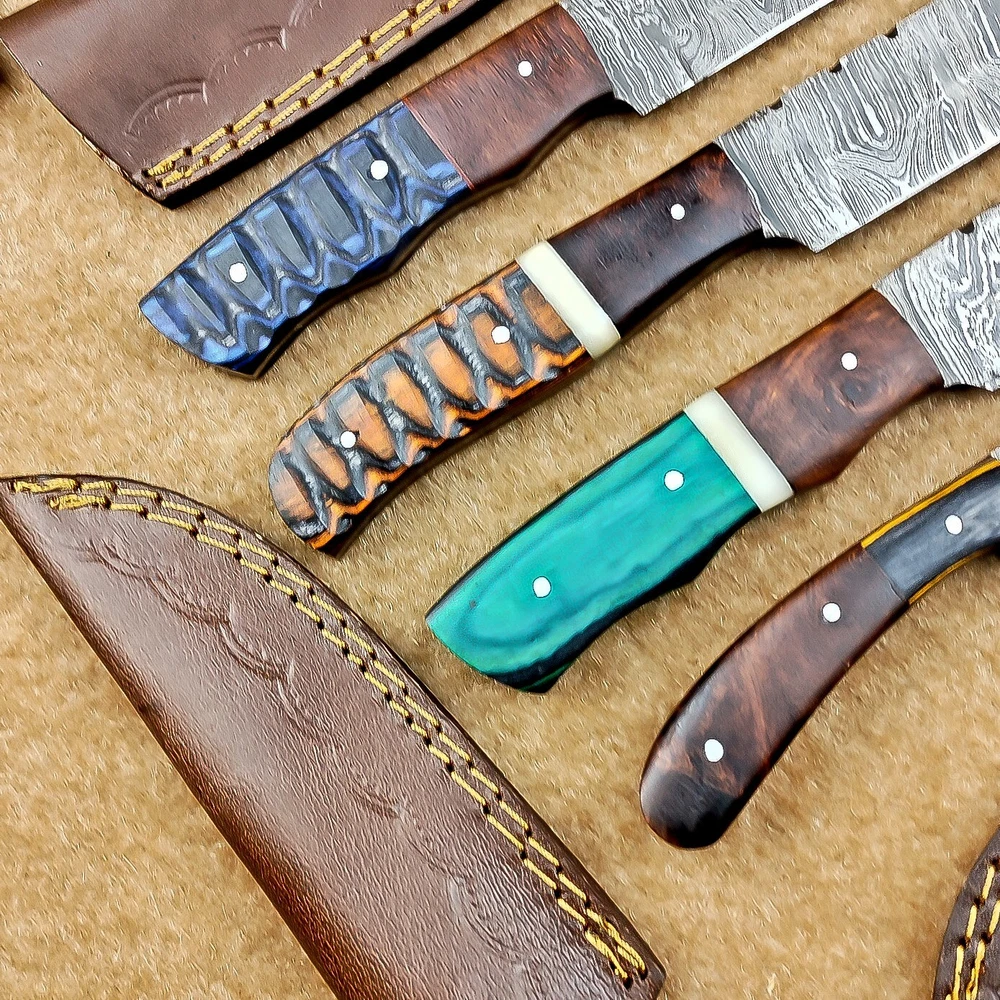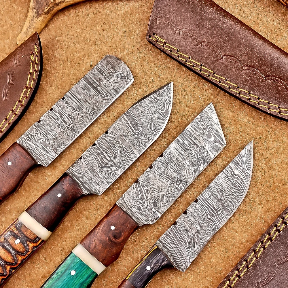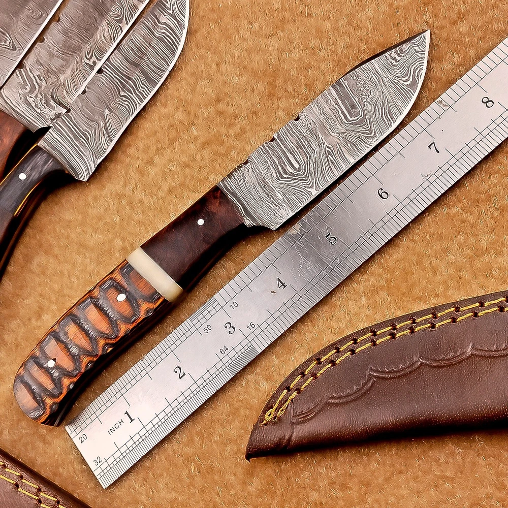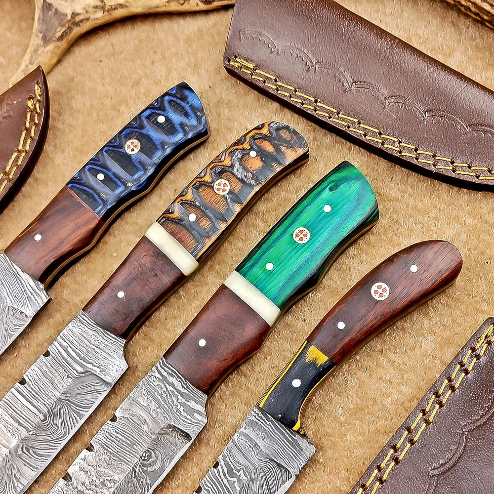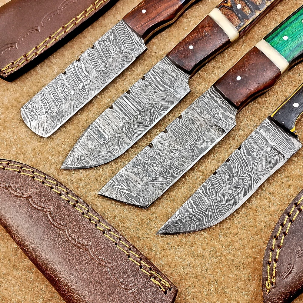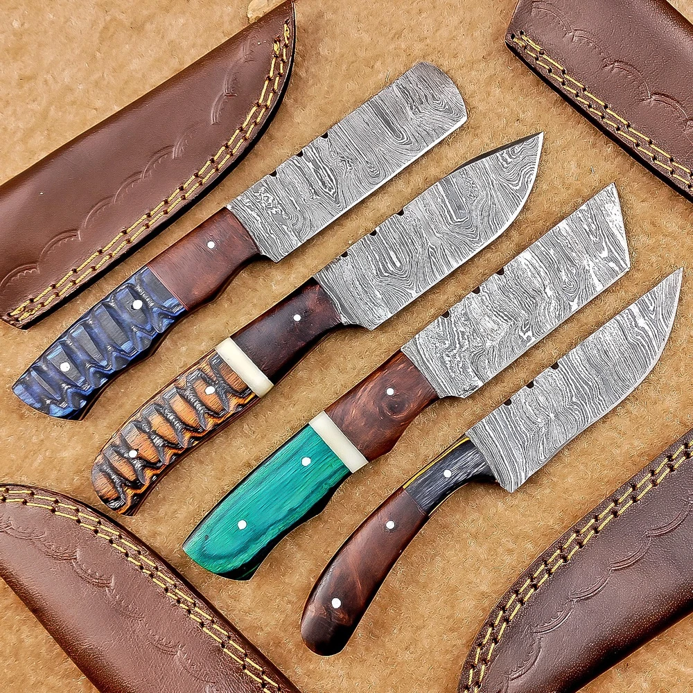 LOT OF 4 PCS! Handmade Damascus Hunting Knives , Skinner Knives Specifications: Overall Length: 8.0" Blade Thickness: ~4 mm Blade Material: Damascus Steel Handle Material: Hard wood with brass pins mosaic pin Includes: Leather sheaths Blade Craftsmanship: Blades are made from 1095 & 15N20 High Carbon Tool Steel with over 256 layers and a hardness of 58-60 HRC for durability and sharpness. Spine of the blade tang has excellent fire work. Care Instructions: Sharpen with a Diamond Wet Stone at a 20-degree angle. Clean with soap and water, dry thoroughly, and apply gun oil. Store away from the sheath to prevent rust. Important Notes for Buyers: Verify your country’s import regulations before purchase. Customs duties, if any, are the buyer’s responsibility. Shipping & Returns: Free shipping included. 14-day return policy applies. Contact Us: Message us anytime. We respond within 24 hours.