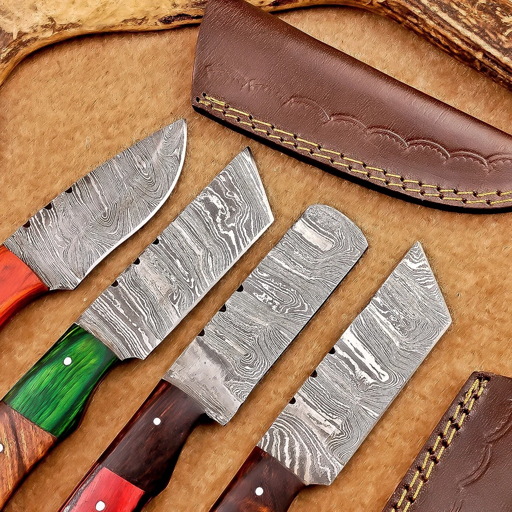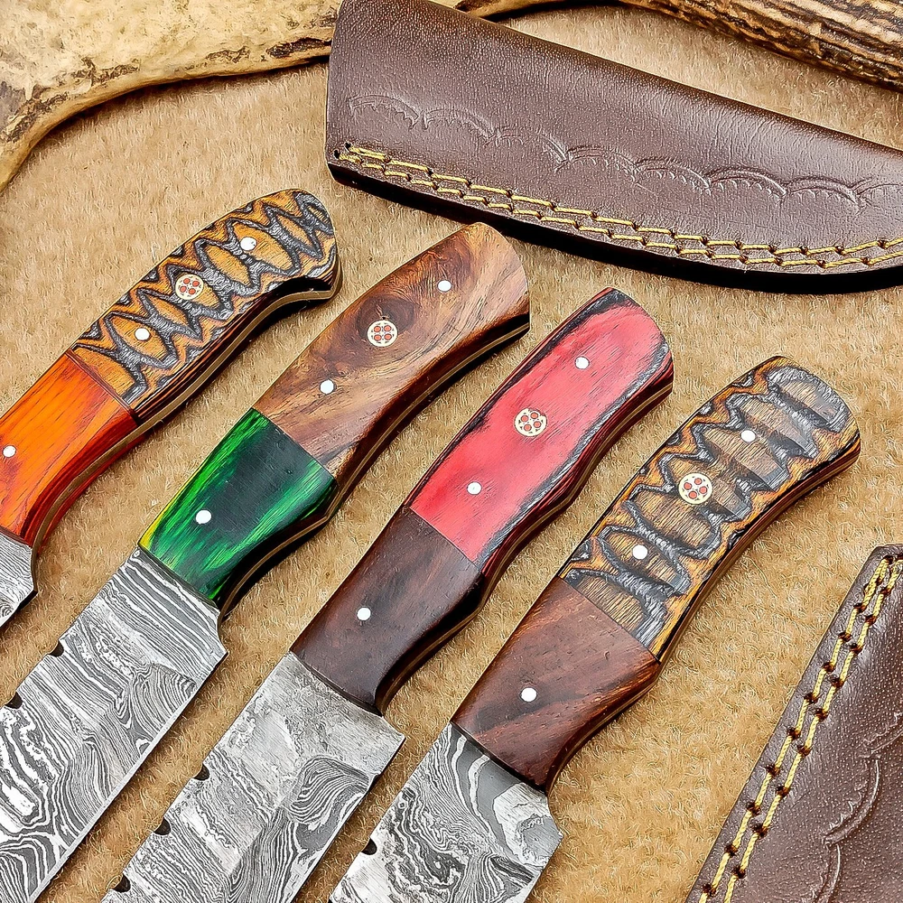 LOT OF 4 PCS! Handmade Damascus Hunting Knives , Skinner Knives Specifications: Overall Length: 8.0" Blade Thickness: ~4 mm Blade Material: Damascus Steel Handle Material: Hard wood with brass pins mosaic pin Includes: Leather sheaths Blade Craftsmanship: Blades are made from 1095 & 15N20 High Carbon Tool Steel with over 256 layers and a hardness of 58-60 HRC for durability and sharpness. Spine of the blade tang has excellent fire work. Care Instructions: Sharpen with a Diamond Wet Stone at a 20-degree angle. Clean with soap and water, dry thoroughly, and apply gun oil. Store away from the sheath to prevent rust. Important Notes for Buyers: Verify your country’s import regulations before purchase. Customs duties, if any, are the buyer’s responsibility. Shipping & Returns: Free shipping included. 14-day return policy applies. Contact Us: Message us anytime. We respond within 24 hours.