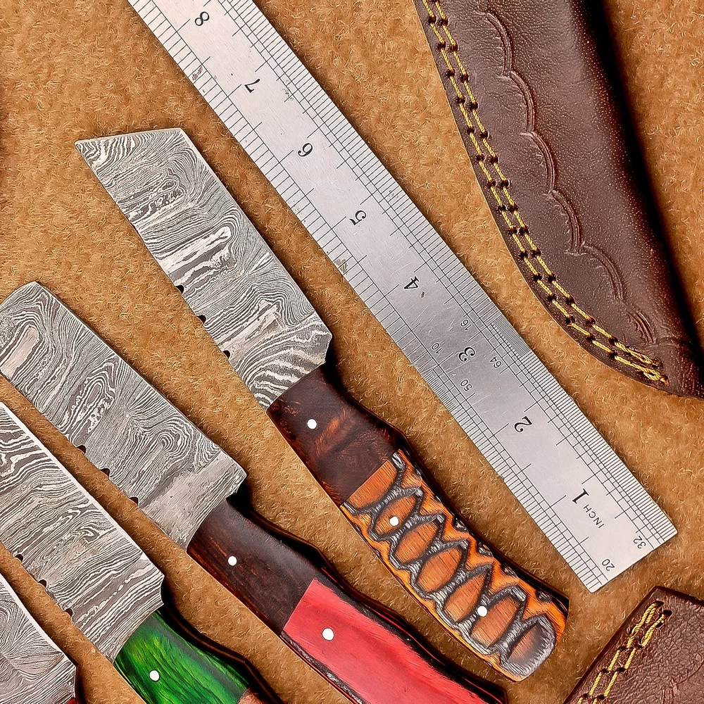 4 Pcs Damascus Blade Skinner Knives Set | 8" | Hard Wood, Leather Sheath IT-911