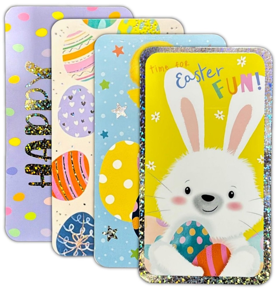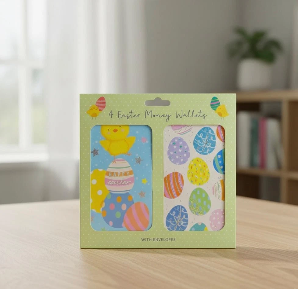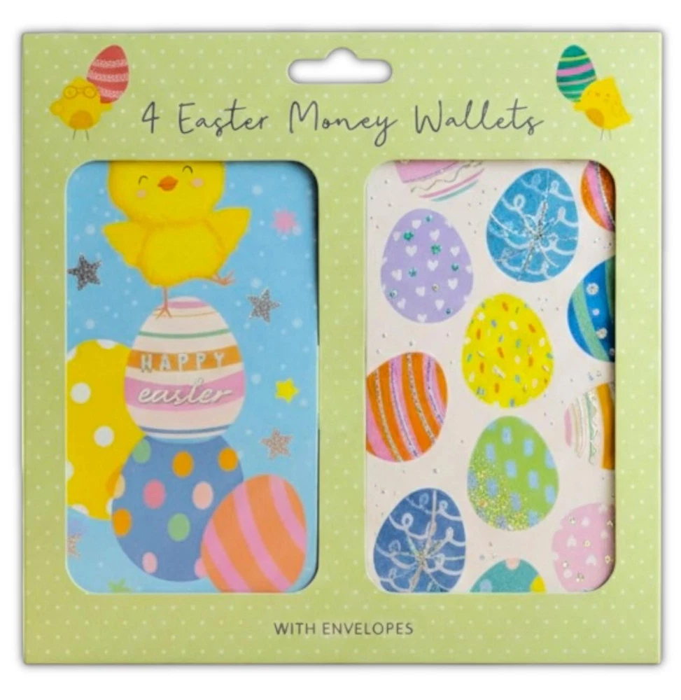 4 QUALITY EASTER MONEY GIFT WALLET Cards + Envelope bunny chick 4 designs The Size is 17.5cm x 27cm Unfolded ( Folded Money Wallet 17.5cm x 9cm Folded Size ) Easter Money Wallet: Present your Easter gifts with style using our charming money wallet. Four Assorted Designs: Each wallet includes four delightful designs Great For Gifting Vouchers Or Money This Easter: This wallet is the perfect choice for presenting vouchers or money gifts during the Easter season. Super Cute Designs: Our wallets feature super cute designs that add a touch of sweetness to your Easter gifts.