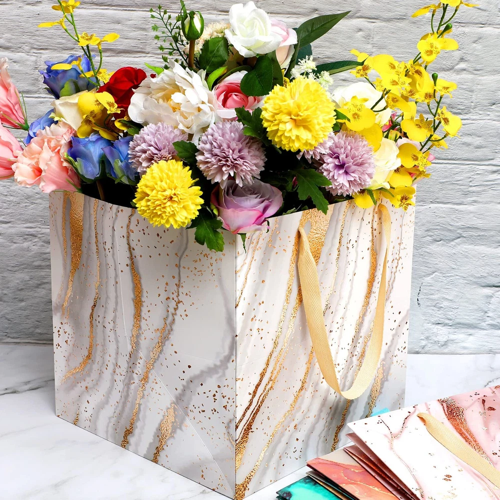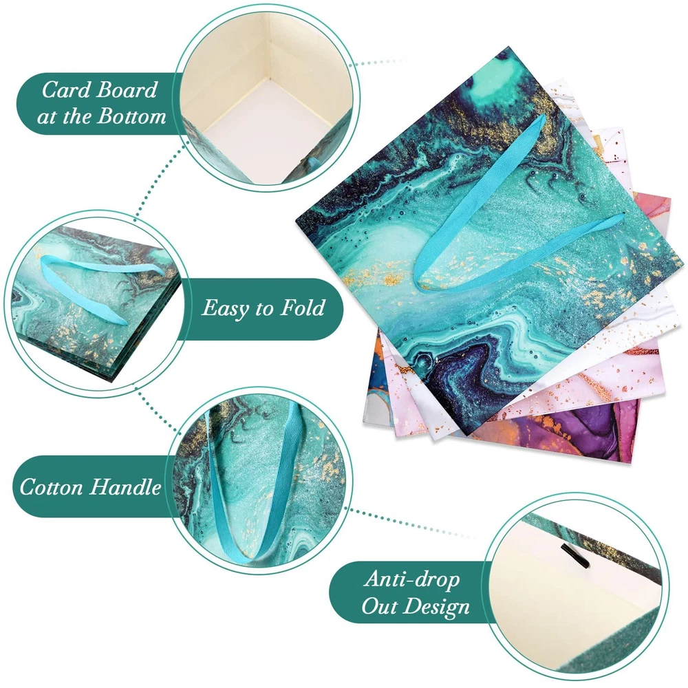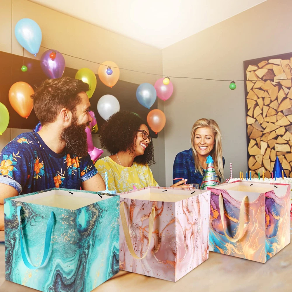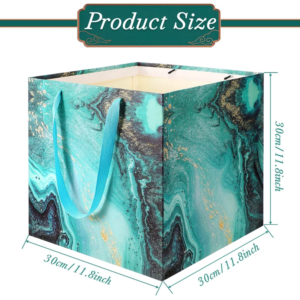 Features: These large square gift bags have art marble printing design with gold thread ornament which are classic and beautiful, while square shape and cotton handle make bags more comfortable and reusable. Ideal gift package: No matter if you are a worker, woman or man, you can use the marble gift bags to hold your gifts and carry them to attend wedding, party, holiday activity, anniversary, which can make your gift look more beautiful and delicate. Specifications: Material: white cardboard Color: as pictures show Size: about 30 x 30 30 cm/ 11.8 x 11.8 x 11.8 inch Quantity: 4 pieces Package includes: 4 x Colorful different large gift bags Notes: Manual measurement, please allow slight errors on size. The color may exist a slight difference due to different screen displays. What You Will Get: this package contains 4 pieces jumbo gift bag, measuring about 30 x 30 30 cm/ 11.8 x 11.8 x 11.8 inch; These big gift bags can various stuffs, and they have sufficient quantity for you to use and replace in daily life or important events Sturdy and Serviceable: the wedding gift bag is made from white cardboard which is thick, solid and safe, not easily faded or worn, hard wearing and reusable; These square cute gift bags have special design with cotton handles, and provide a soft texture and comfortable experience to your finger Marble Pattern: the beautiful giant gift bags have colorful gilt marble print designs, gorgeous, mysterious and charming; Your gift can have a sense of art and charm by being packed with this kind of huge birthday bags, which are classic, simple, elegant and stylish Easily : this anniversary gift bag can be fully folded when you are not using it, minimizing the storage space; They have enough room to various kinds of things, you can fold them in your drawers and cupboards or hang on the wall and door Applicable Occasion: really big gift bag with marble design can hold large gifts, flowers, household items, large clothing, plush animals or stylish dolls; The bag can be applied on many occasions like bridal shower, baby shower, birthday party, anniversary celebration, wedding, holiday party, annual party and more important occasions, adding a fun and elegant atmosphere