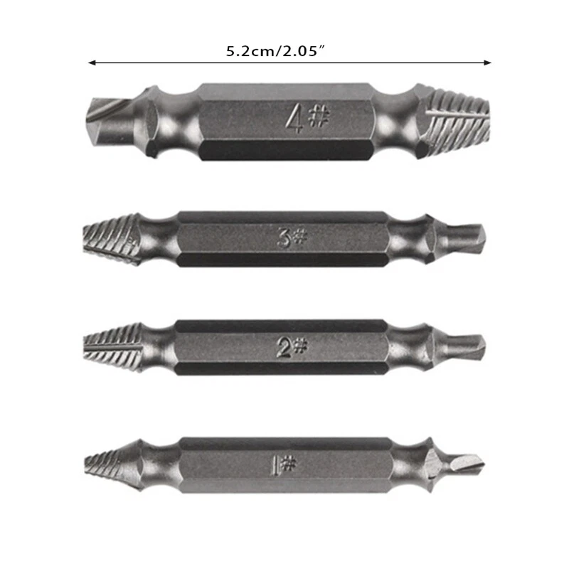 Features: brand new and high quality 4 pieces screw extractors work with any drill and all the screw size or These extractor tools are used to reverse the damaged screw counterclockwise until it is released. Striped screw extractor removes even the most stubborn stripped, damaged, embedded, rusted and painted-over screws and bolts. Use a suitable size screw remover to drill a hole with cutting size and it’s easy to extract the screw or using extractor tool. hardness material and is more durable than most screw extractors in market, the hardness and the durability are better. It is best to use electric hand drill, can not be used the hammer drill Specifications: Material:HSS Length:5.2cm/2.05inches Color:Silver Package Includes: 4 Pieces Damaged Screw Extractors/Set note: Due to the light and screen setting difference, the item's color may be slightly different from the pictures. Please allow slight dimension difference due to different manual measurement.