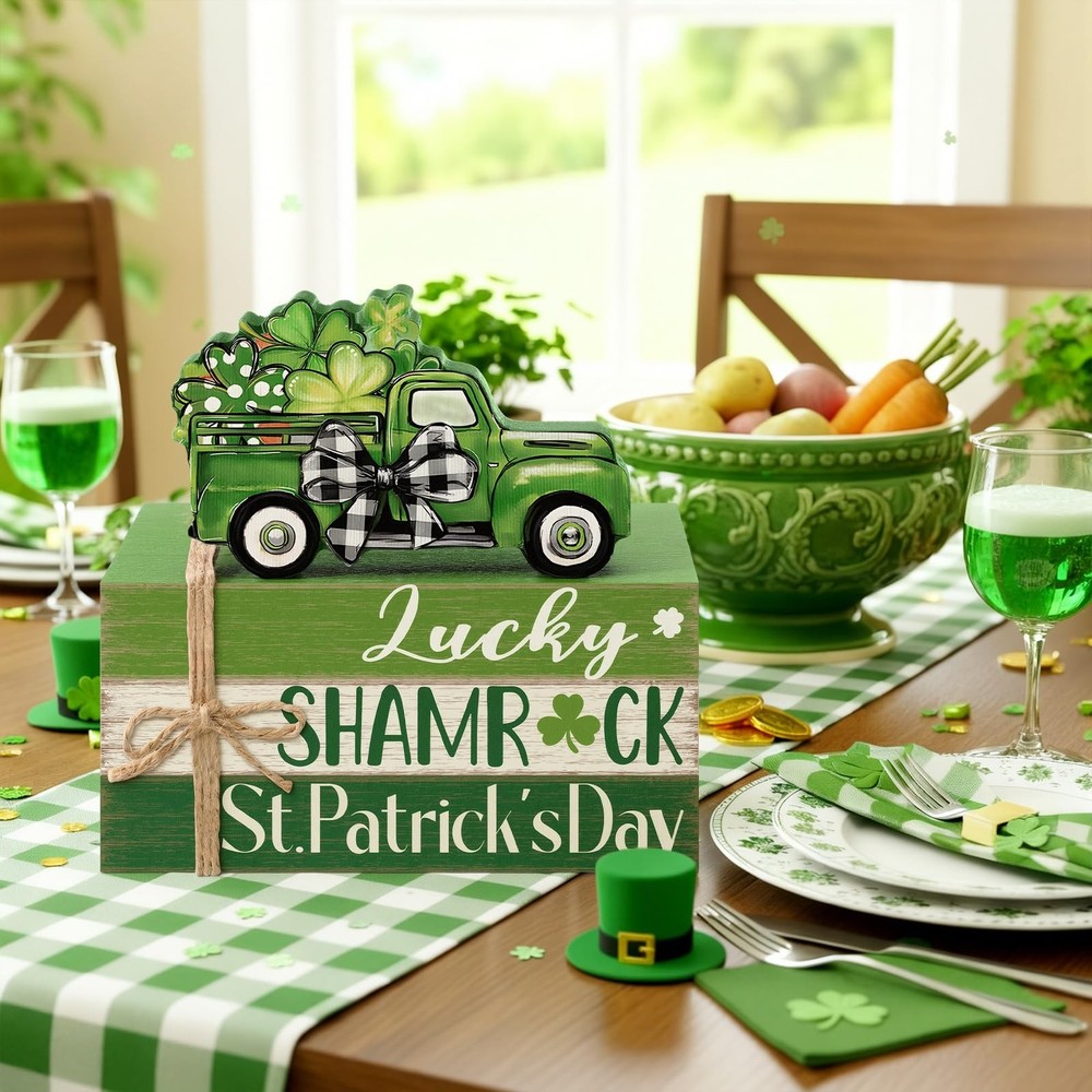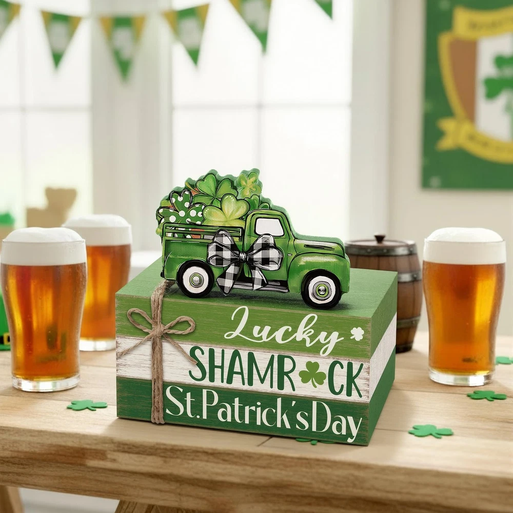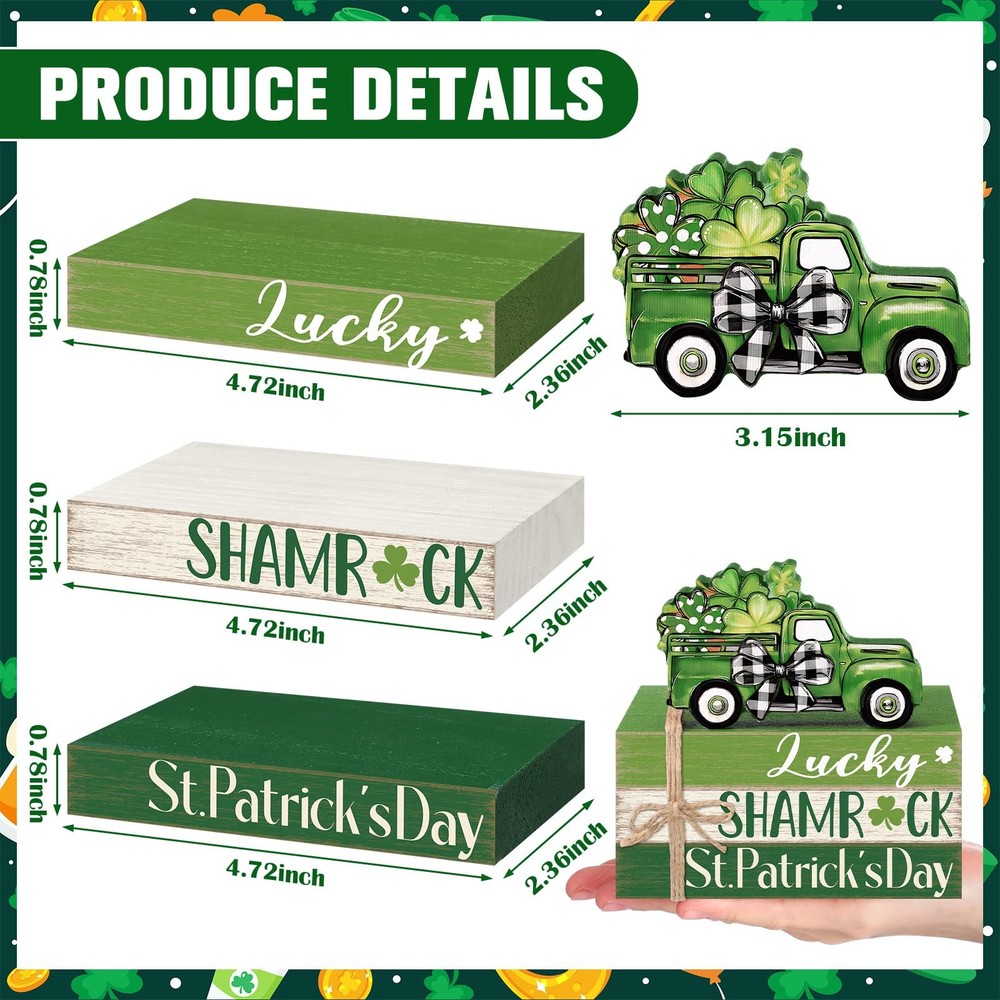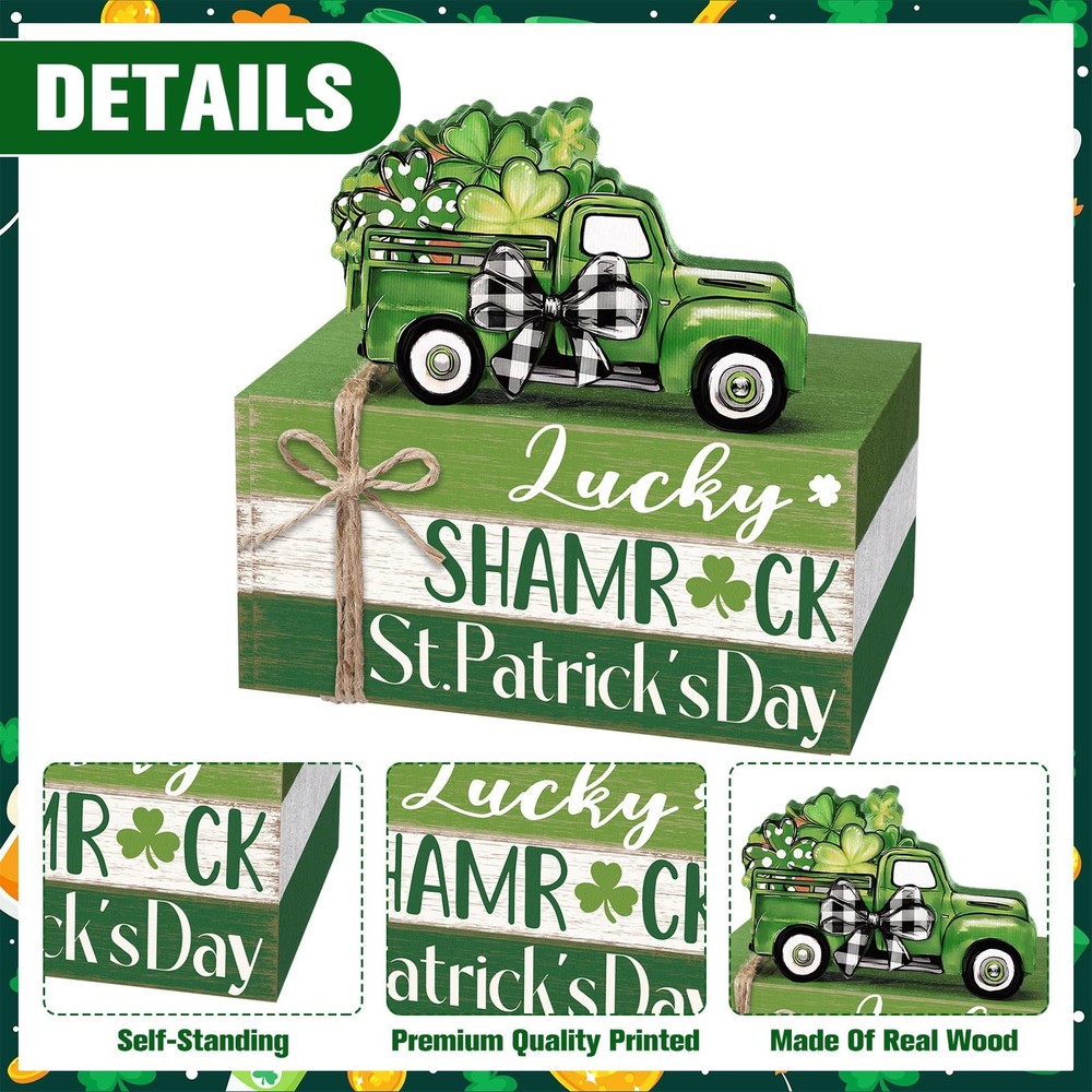 Features: Celebrate the charm of St. Patrick's Day with this 4-piece wooden book stack set designed to brighten your home with Irish holiday cheer. Featuring a classic green pickup truck filled with shamrocks and layered wooden blocks in festive green and white tones, this decor set adds warmth and personality to your seasonal displays. Compact and easy to style, these decorative blocks fit seamlessly into many areas of your home. They pair well with tiered trays, greenery, candles, and other farmhouse holiday pieces. Whether placed in the kitchen, living room, or office, this St. Patrick's Day set creates a welcoming and spirited atmosphere for guests and family alike. Specifications: Material: wood Color: multicolor Size: approx. 4.72 x 2.95 x 2.36 inches/ 12 x 7.5 x 6 cm Package includes: 1 Set of stacked books decor Notes: Manual measurement, please allow slight errors on size. The color may exist a slight difference due to different screen displays Irish-themed St. Patrick's Day Set of 4: this wooden book stack decoration includes 4 coordinated pieces featuring “Lucky, ” “Shamrock, ” and “St. Patrick's Day, ” topped with a green truck filled with clovers; Perfect for bringing cheerful Irish holiday spirit to your seasonal home decor Durable Wood with Rustic Finish: crafted from sturdy solid wood with distressed green and white tones that resist fading and cracking; The farmhouse texture complements St. Patrick's Day decor, making it ideal for yearly seasonal display Festive St. Patrick's Day Design: includes iconic Irish elements—green vintage truck, shamrocks, buffalo plaid bow, and holiday lettering; Its vibrant green color palette instantly enhances your spring holiday atmosphere Versatile Display for Any Space: works beautifully on tiered trays, mantels, bookshelves, desks, coffee tables, kitchen counters, entryways, and office spaces; Complements farmhouse, country, rustic, and St. Patrick's Day party decor Great Irish Holiday Gift: a thoughtful seasonal gift for friends, family, coworkers, teachers, and holiday hosts; Perfect for St. Patrick's Day celebrations, spring gatherings, party decor, and festive home styling