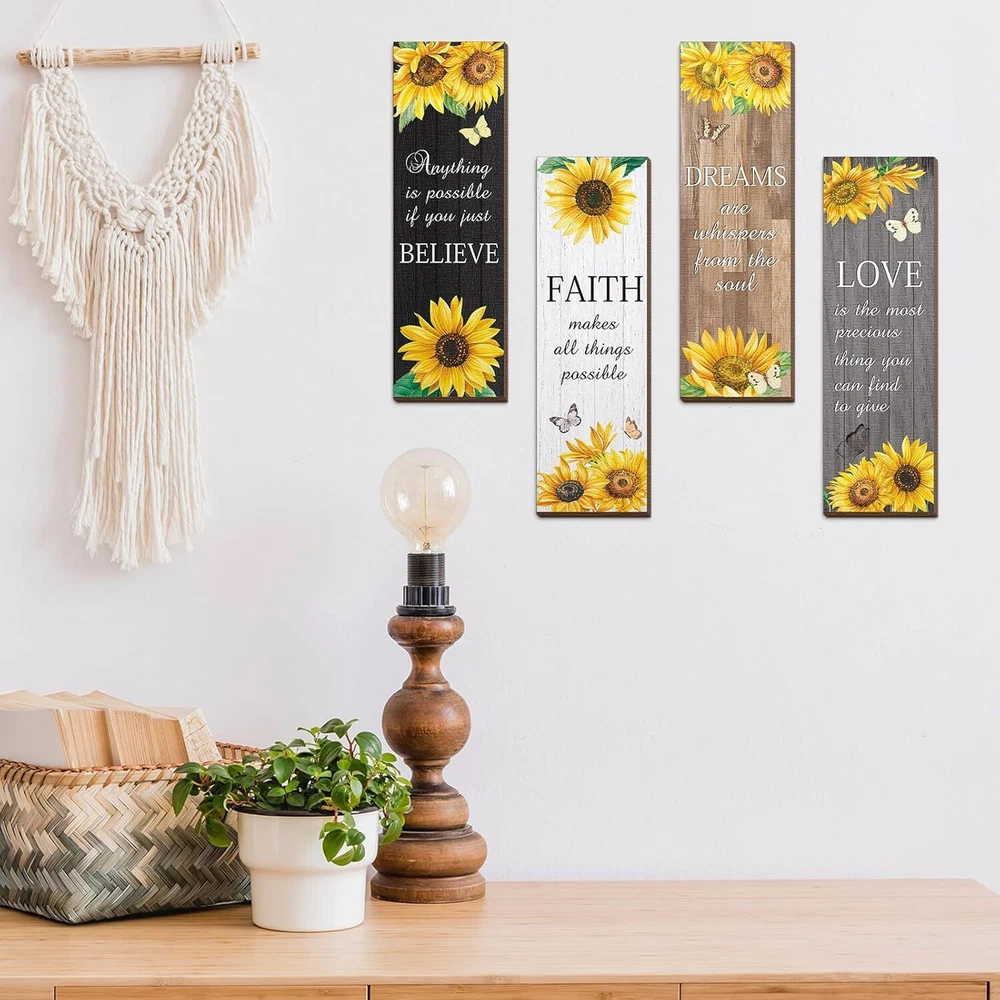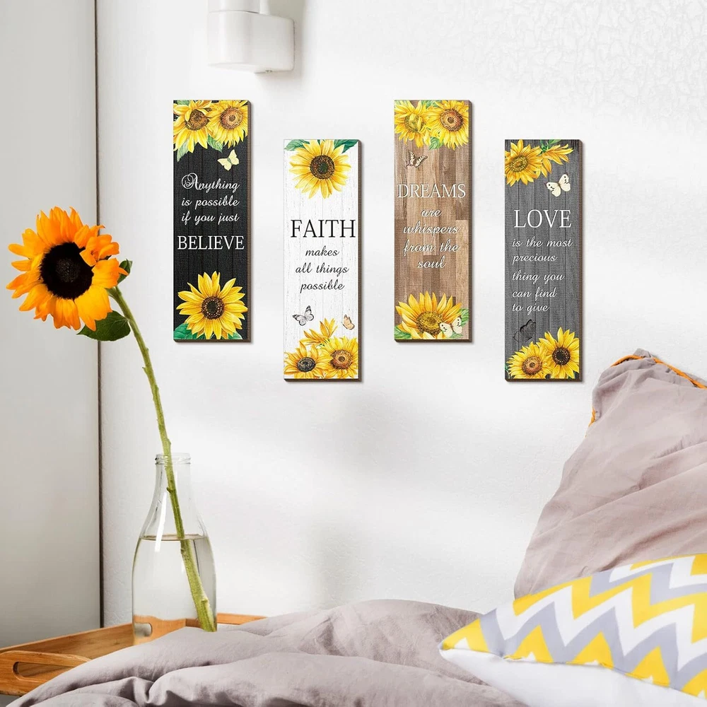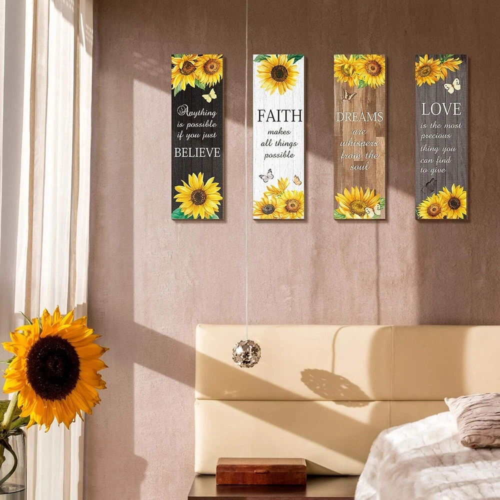 4 Pcs Sunflower Wall Decor Inspirational Kitchen Decors Multicolor Product Details Product Dimensions: 3.5 x 11.4 x 0.2 inches Item Weight: 9.1 ounces Manufacturer: Qunclay Country of Origin: China Item model number: WV-Qunclay-5246 Number of pieces: 4 Batteries required: No Valuable Package: there are 4 pieces of sunflower decorations for home in 4 different styles, 1 piece in each style, the adequate amounts and various styles can easily meet your daily use and replacement demands Inspirational Sunflower Themed Design: the sunflower wall decor is designed with yellow sunflowers, flying butterflies, inspirational words, and so on, vivid and lifelike, bright and delicate, and the words of [love], [faith], [believe], [dream] and more, can remind you to keep positive attitude to life Appropriate Size: the sunflower living room decor measures approx. 29 x 9 x 0.5 cm/ 11.4 x 3.5 x 0.2 inches, proper for use or storage, without taking up too much space, but can make your home look more colorful and energetic Quality Material for Long Time Use: the inspirational sunflower home decor is made of quality wood material, with clear and bright printings, sturdy and serviceable, which are reliable and reusable and not easy to fade, deform or break, offering you a long time decorating service Convenient to Hang: the sunflower kitchen decor with the matching hooks behind, can be hung, a good decoration for bathroom, bedroom, hallway, living room and dining room, without any requirement of auxiliary tool, pretty simple and easy to apply, creating retro and traditional atmosphere for your house