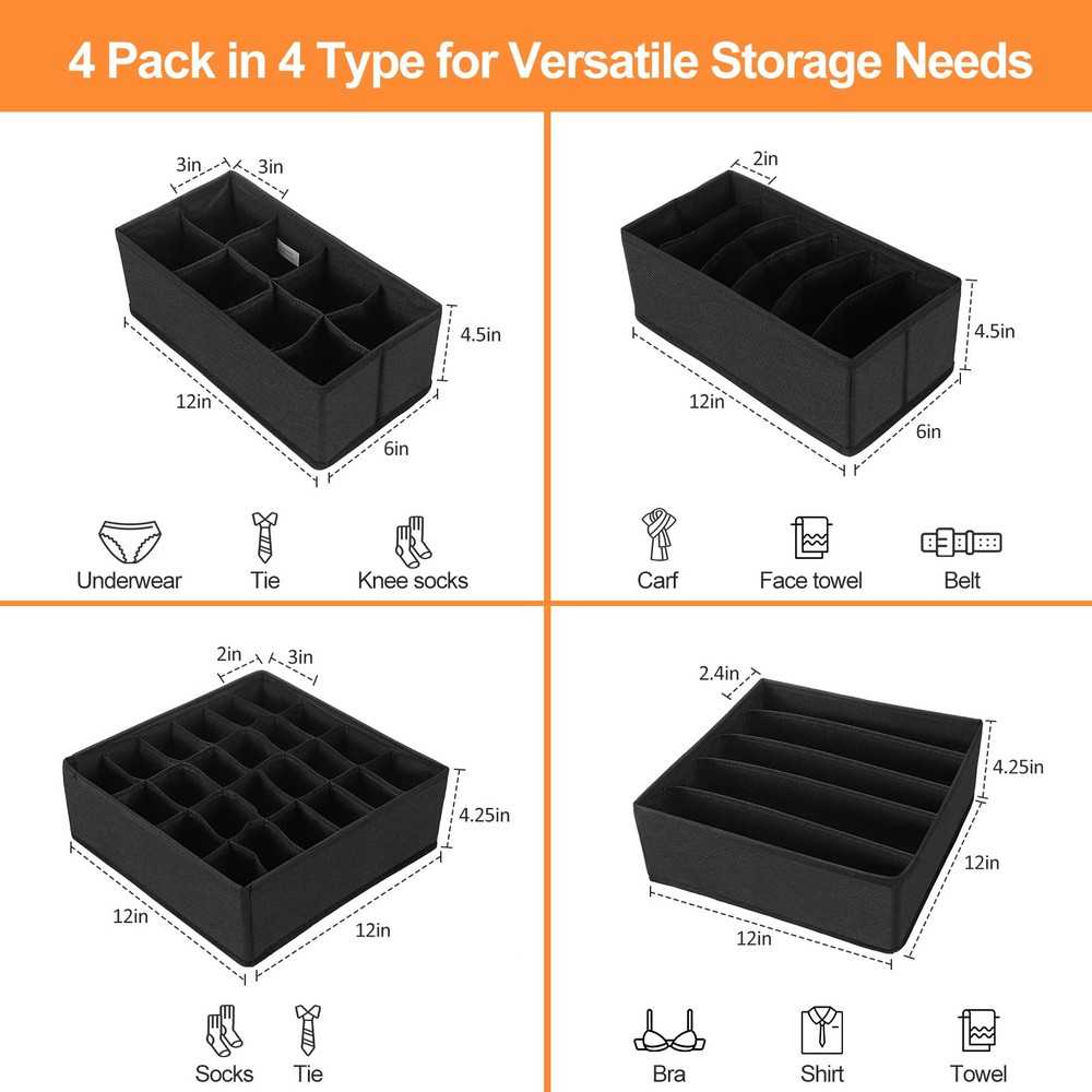Time Save Organizers: With this underwear organizer, you will not be bothered through messy drawers or wardrobes for panty or bra while in a rush to get ready. Our Collapsible drawer organizer includes 4 bins: 6 cell( for scarves, ties,makeup brush), 8 cell(for underwear, briefs, ties), 5 custom large cell(ideal for bras up to 38D), 24 cell(perfect for socks),Great for store your items, you can even use them to store stationery. Premium Material: drawer organizers made of strong fabric and meticulous stitching (make it sturdy for repeated use/ long time use.) , keeping your items neat at all times and makes storage look stylish. Space-saving Design: These 4 drawer organizer box can be folded flat to save space when not use. Simply open the zipper and fold flat to store. Great dresser drawer organizer for tidy your closet and room, also a ideal gift for others. You will receive: Set of 4 sock and underwear drawer organizers, our hassle free warranty and 24/7 friendly customer service.