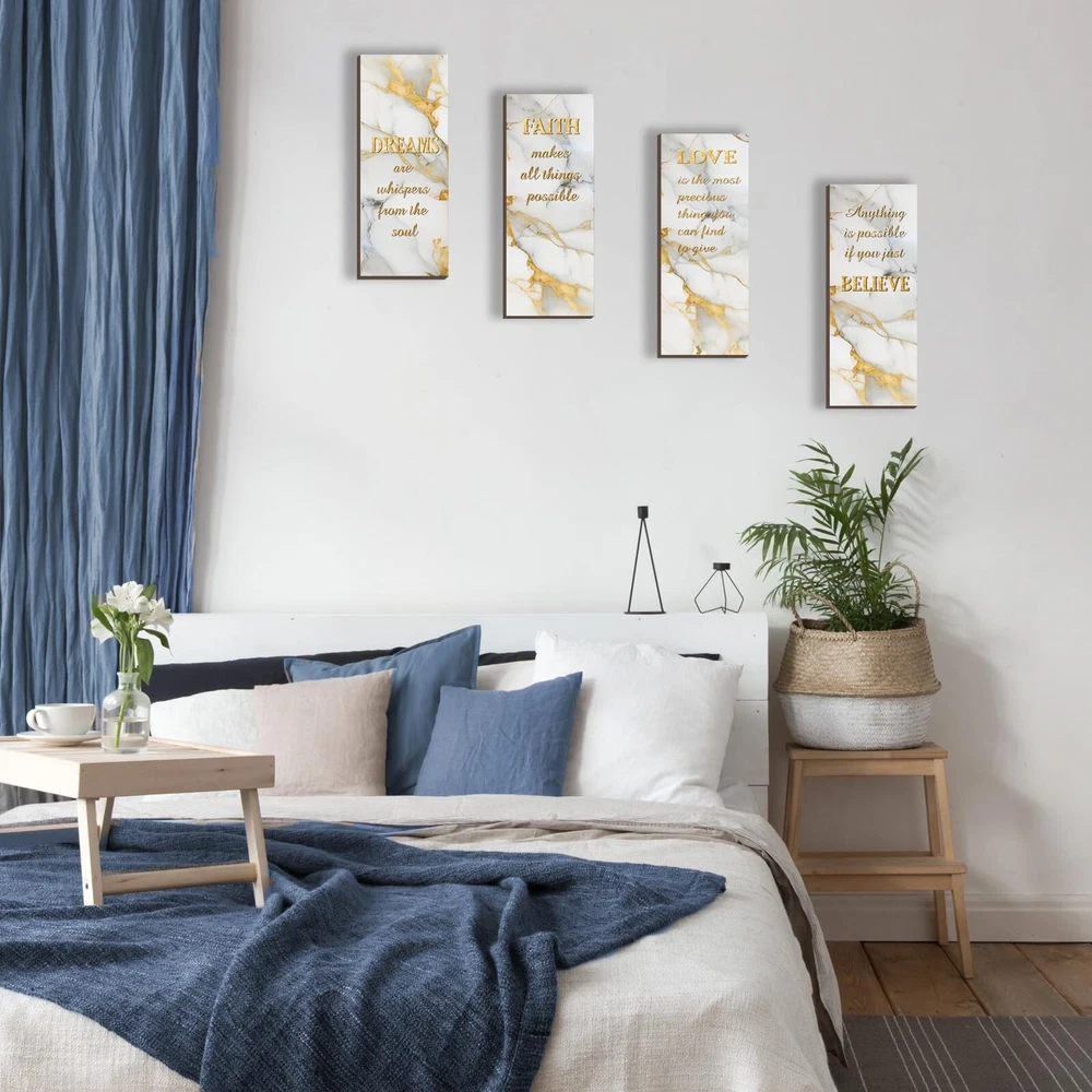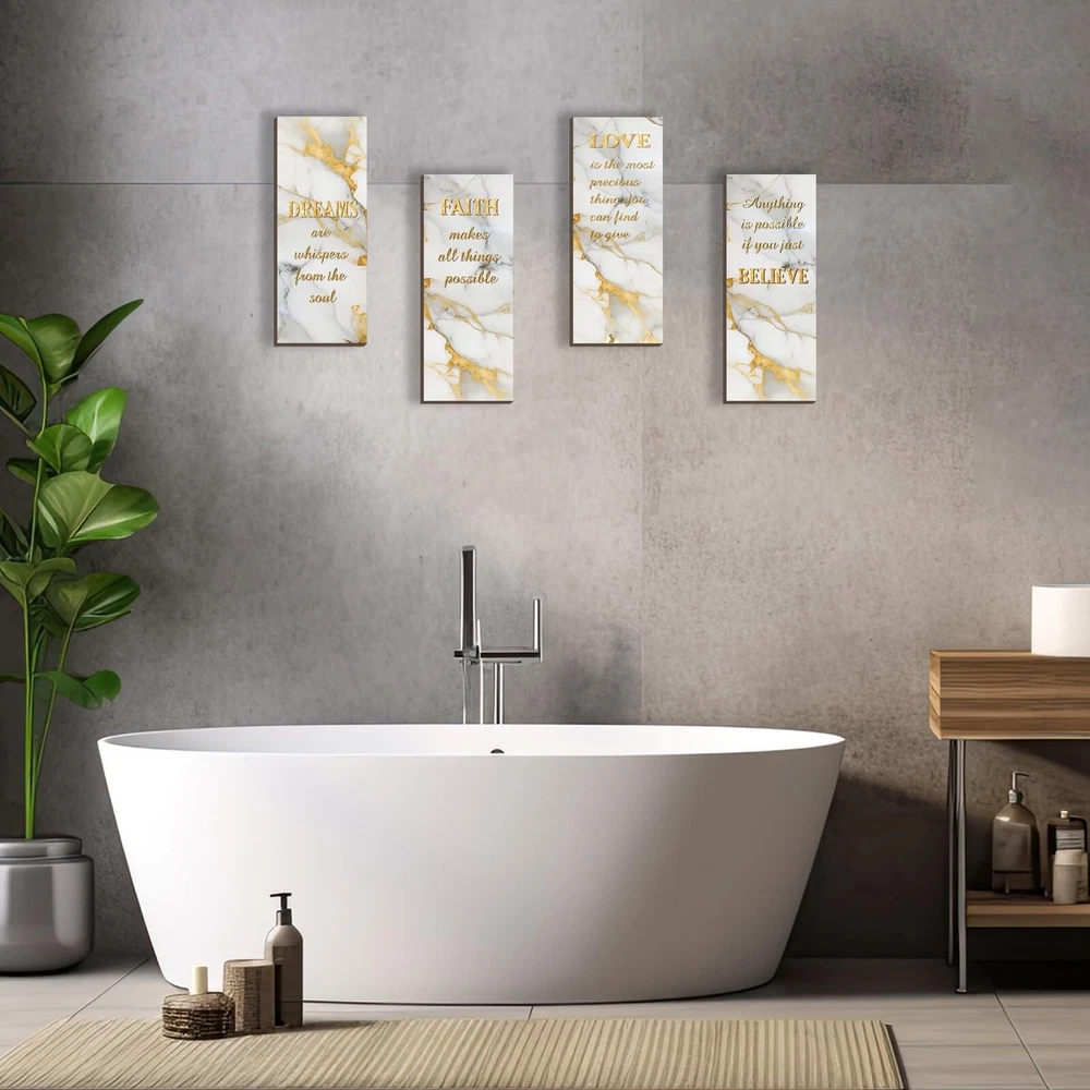 4 Pcs White and Gold Bathroom Decor Gold Wall Decor with Dreams Faith Love Believe Wooden Rustic Marble Style Versatile Bathroom Accessories for Bedroom Living Room Kitchen(White Gold 10X4) Product Details Color: White Gold Brand: ONIZHITY MPN: ON0017WHITE GOLD UPC: Does not apply EAN: Does not apply Color: White Gold Brand: ONIZHITY Finish Type: Polished Mounting Type: Wall Mount Style: Rustic Color: White Gold Brand: ONIZHITY Finish Type: Polished Mounting Type: Wall Mount Style: Rustic Recommended Uses For Product: Decoration Shape: Rectangular Theme: Abstract Included Components: Hanging Hardware Number of Hooks: 4 Package Dimensions: 11.69 x 8.98 x 0.55 inches Item Weight: 8.8 ounces Item model number: ON0017WHITE GOLD Finish types: Polished Batteries required: No Positive Affirmations Set: Elevate your ambiance with our 4 Pcs white and gold bathroom decor. Experience daily doses of positivity with words like [DREAMS], [FAITH], [LOVE], and [BELIEVE]. Four pieces, four reminders turn your space into a haven of optimism. White and Gold Wall Decor Size: Each wooden sign measures 25 x 10 x 0.5 cm (10 x 4 x 0.2 inches), striking the suitable balance between size and impact. Our white and gold wall decor seamlessly fits into any space, delivering a powerful message without overwhelming your surroundings. Crafted Wisdom: White bathroom accessories material is quality wood, intricate printing, and fine polishing united in our Dreams Faith Love Believe Bathroom Wall Art. Craftsmanship meets durability, ensuring these rustic marble-style signs serve as timeless reminders, embodying both style and substance. White Wall Accessories Gift: Searching for a meaningful gift? Our versatile white and gold bathroom accessories, adorned with affirmations, make for thoughtful presents on birthdays, housewarmings, weddings, and holidays. Gift positivity and style a remedy for life's challenges. Versatile Inspiration: Our white and gold bathroom decor infuses elegance into every space. From bedrooms to living rooms, spa rooms to porches, strategically hang these primitive wall arts for a visual feast that adds charm to every nook. Our white and gold bathroom decor brings positivity to any scenario, making it an ideal gift of tranquility.