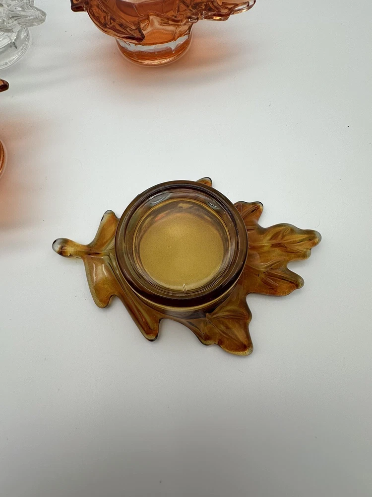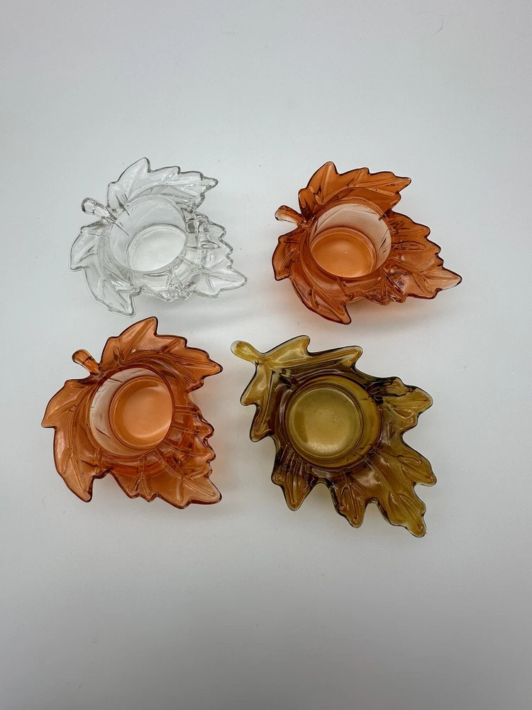 Add a touch of autumnal charm to your home with this set of four glass candle holders, perfect for tea lights. Get ready to elevate your home decor with these stylish and versatile candle holders. Please look at photos for condition. On the clear leaf there is two small flea bites as shown in photos. In good used condition.