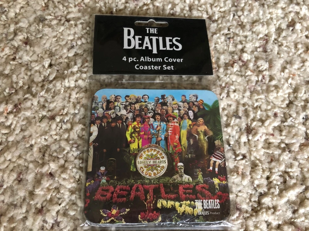 Here are 4 Beatles album cover coasters sealed in package. Each coaster is 3 7/8 X 3 7/8 inches. Has cork back. Thanks for looking.