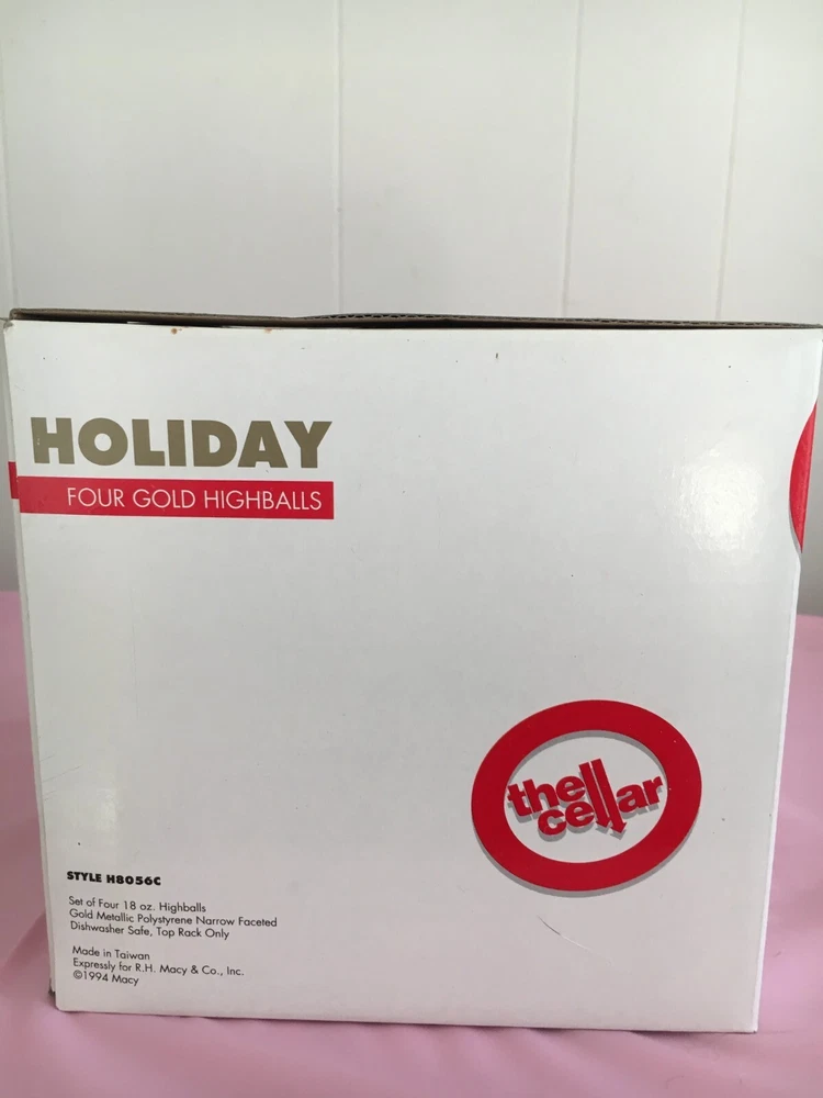 4 Piece Gold Metallic Highball Glass Set. Glasses are stunning gold metallic withdecorative ridges. Each glass is 18 ounces and 6 inches in height.Dishwasher safe. Brand new in box.