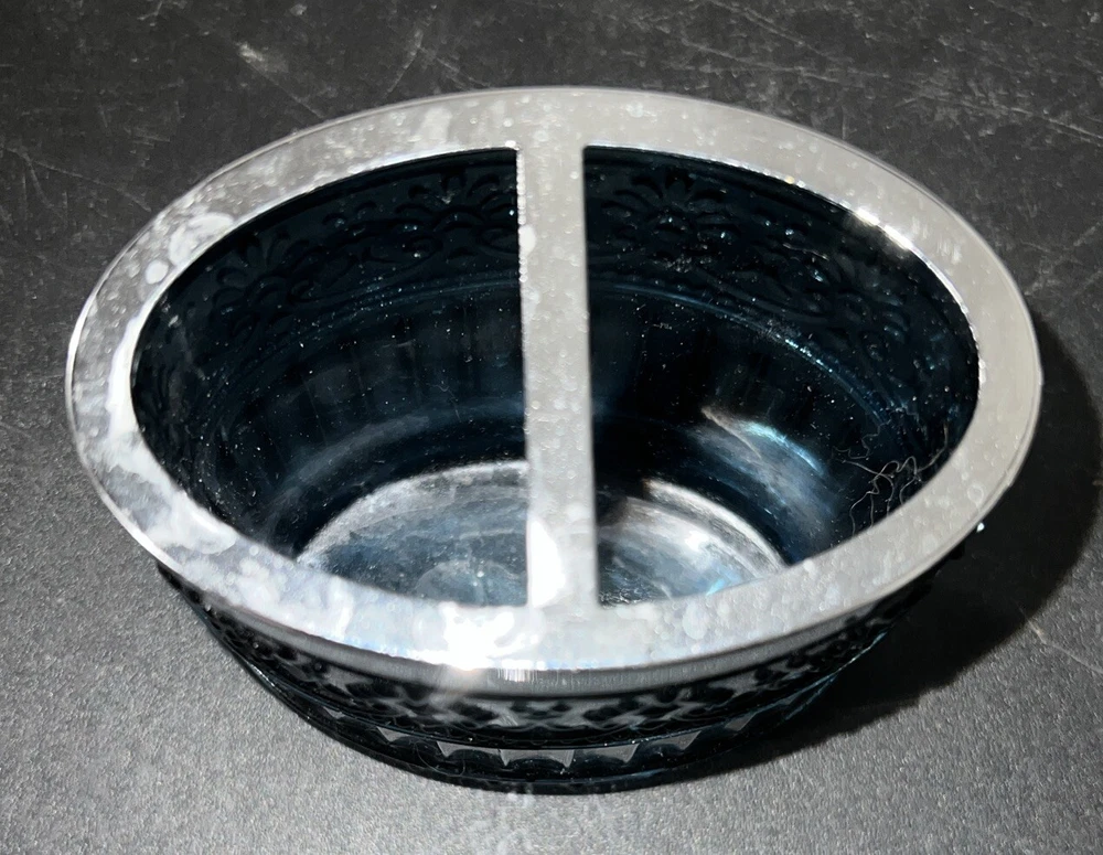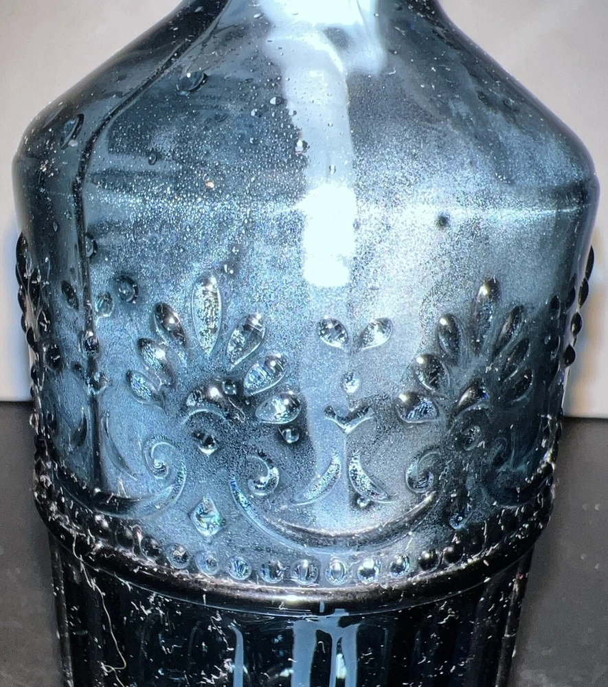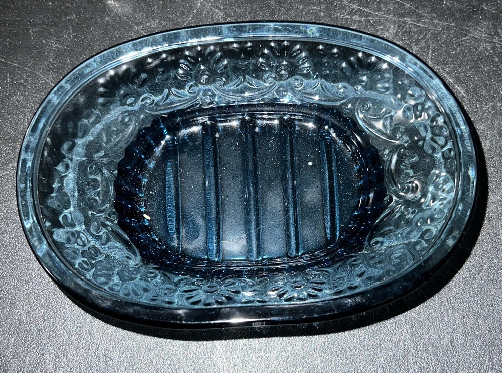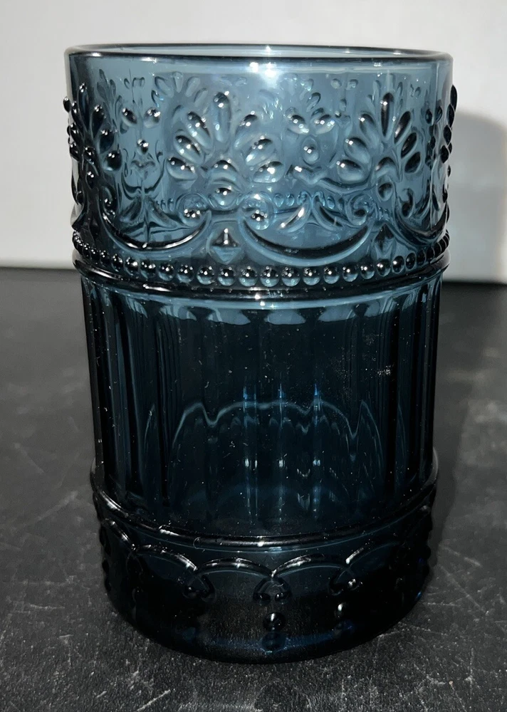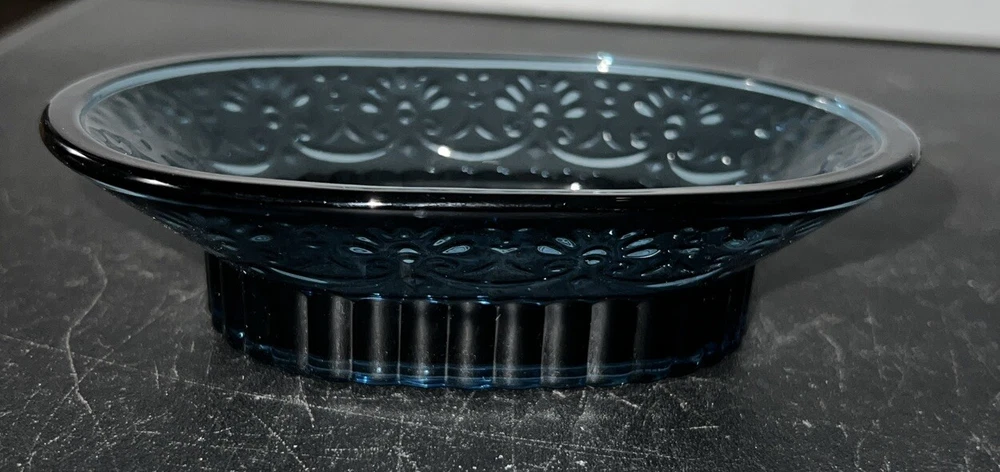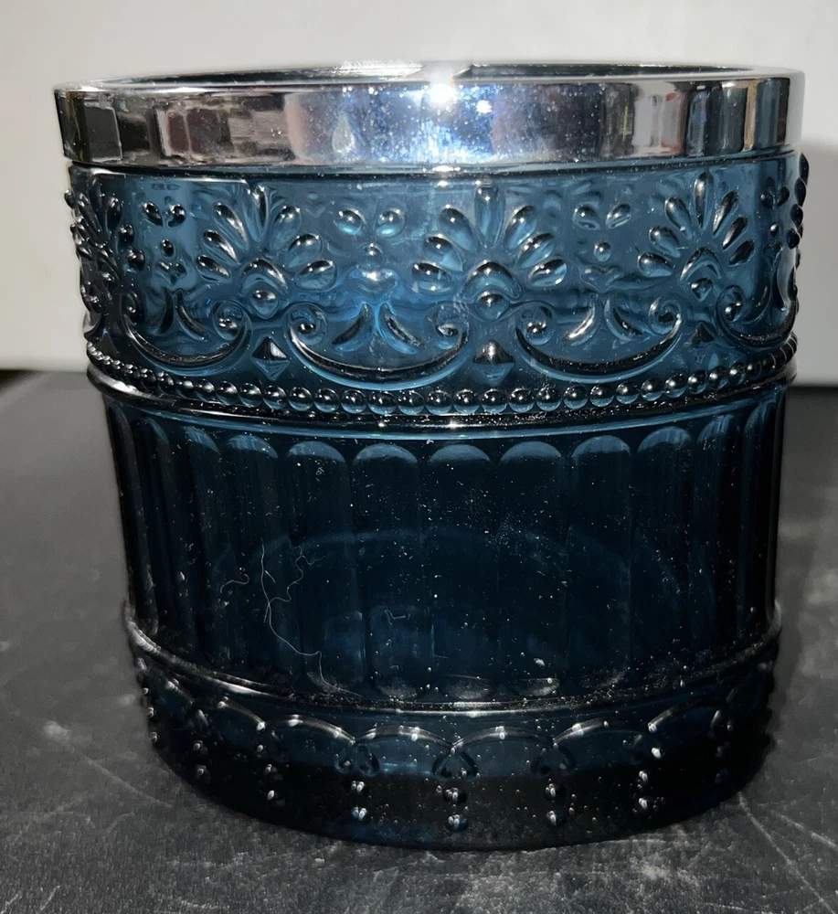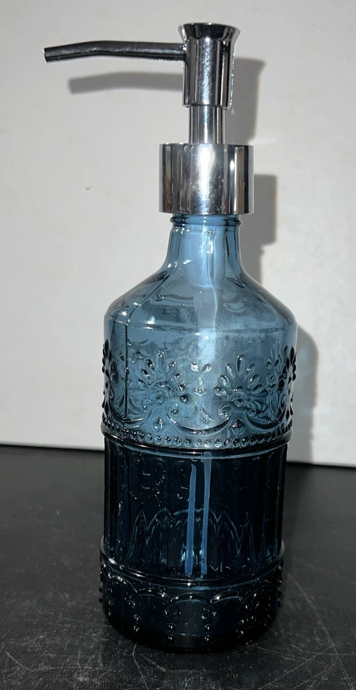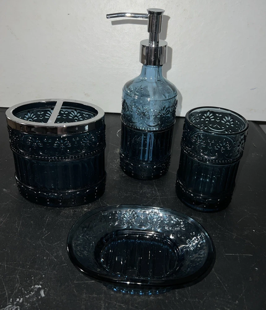 Add a touch of elegance to your bathroom with this 4 piece accessory set. The set includes a cobalt blue tumbler, toothbrush holder, soap dispenser, and soap dish, all made of heavy weight glass. The embossed design on the set adds a unique and sophisticated touch to your bathroom decor. The set is perfect for adults and is an original piece. It is a great addition to any bathroom and is sure to impress your guests. The set is manufactured in an unknown country or region and is ideal for use in the bathroom. This set is unbranded. No cracks or chips.