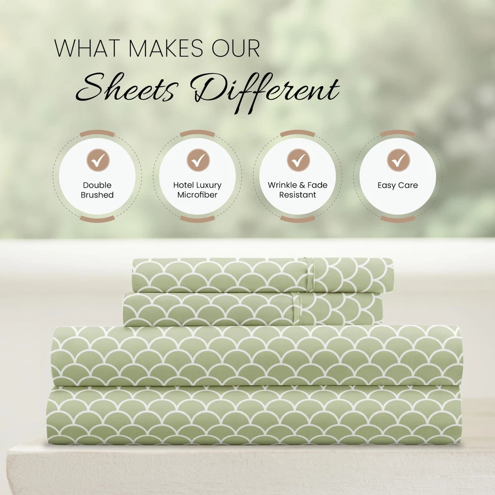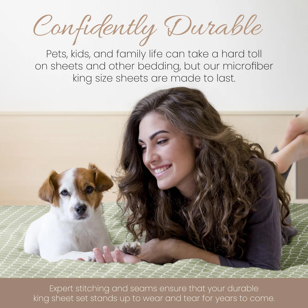 LUXURIOUS SLEEP: Get ready to sleep in cloud-like comfort every night with your new luxurious king sheets. Softer than cotton sheets, cozy and comfortable, they're the perfect way to treat yourself to a sound sleep. WHAT MAKES OUR SHEETS DIFFERENT: Most bed sheet fabrics are only brushed once to soften them up, but to make sure you get the best night’s sleep, we brush our fabric TWICE. Tuck yourself into these cloud-like sheets and soundly drift off to sleep every night. EASY SHEET CHANGES: Changing sheets on deep beds is frustrating, but not with our 16” deep pocket sheets. Our snug-fit design allows for you to easily put your fitted sheets on without the hassle of wrestling down every corner. This set includes a fitted and flat sheet, and pillowcases. CONFIDENTLY DURABLE: Pets, , and family life can take a hard toll on sheets and other bedding, but our microfiber king size sheets are made to last. Expert stitching and seams ensure that your durable king sheet set stands up to wear and tear for years to come. BEAUTIFUL BED SHEETS: Our unique Scallops print is sure to add a touch of elegance and brighten up your bedroom. Check all 19 of our popular color options in all 5 size options to find the perfect match for every bedroom in your home.