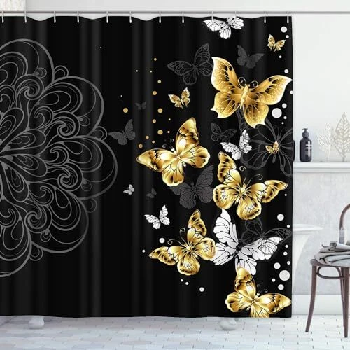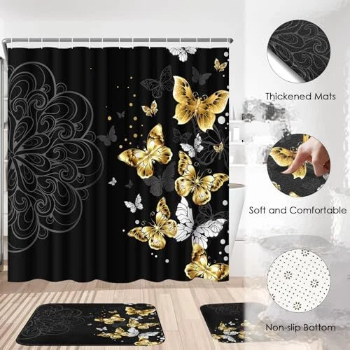 gtin13: Does Not Apply Finish Type: Machine made Brand: Does Not Apply Item Height: 1 Type: Does Not Apply Material Type: Polyester Color: Gold Black Butterfly Material: Does Not Apply Manufacturer: Does Not Apply Item Width: 1 EAN: Does Not Apply Item Length: 1 MPN: Does Not Apply UPC: Does Not Apply Style Name: Modern Included Components: Shower Curtain & Bath Rug