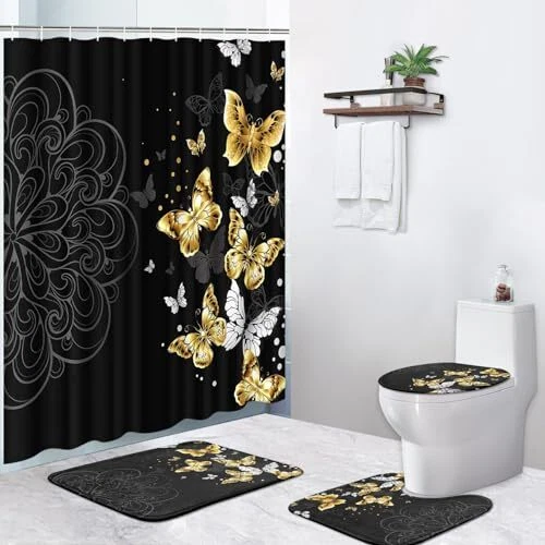 4 Piece Shower Curtain Set, Black Mandala Flowers Gold Black Butterfly