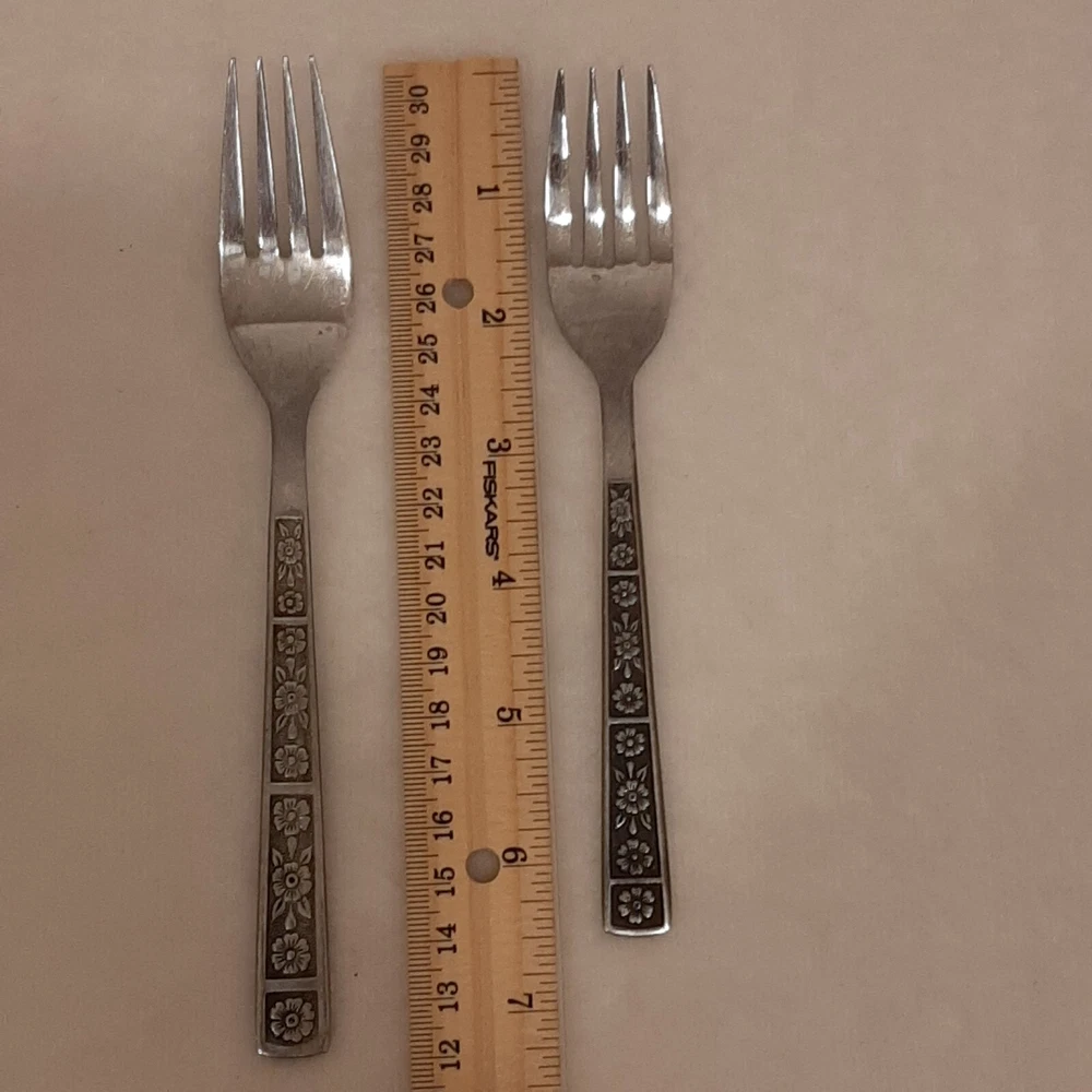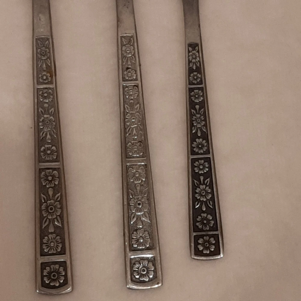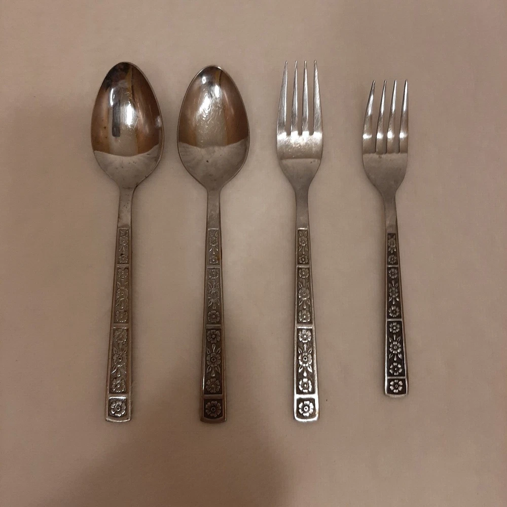 4 Piece TTC Stainless Steel Korea Flatware 2 Spoons & 2 Forks READ DISCRIPTION In good pre-owned condition may show signs of wear from use/handling/storage/display. Please view all pics for condition/details/flaws/issues. SOLD AS IS This set has a few issues the set has surface scratches please see photos 10, 13, & 18-19, there are marks/spots/dirt/debris/rust on set please see photos 7-23, there is color loss to design on both spoons and large fork please see photos 14 & 24, the spokes of forks may have slight bents please view photos 7-10, Please view all photos for details/conditions.