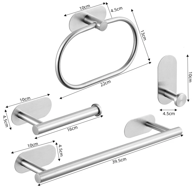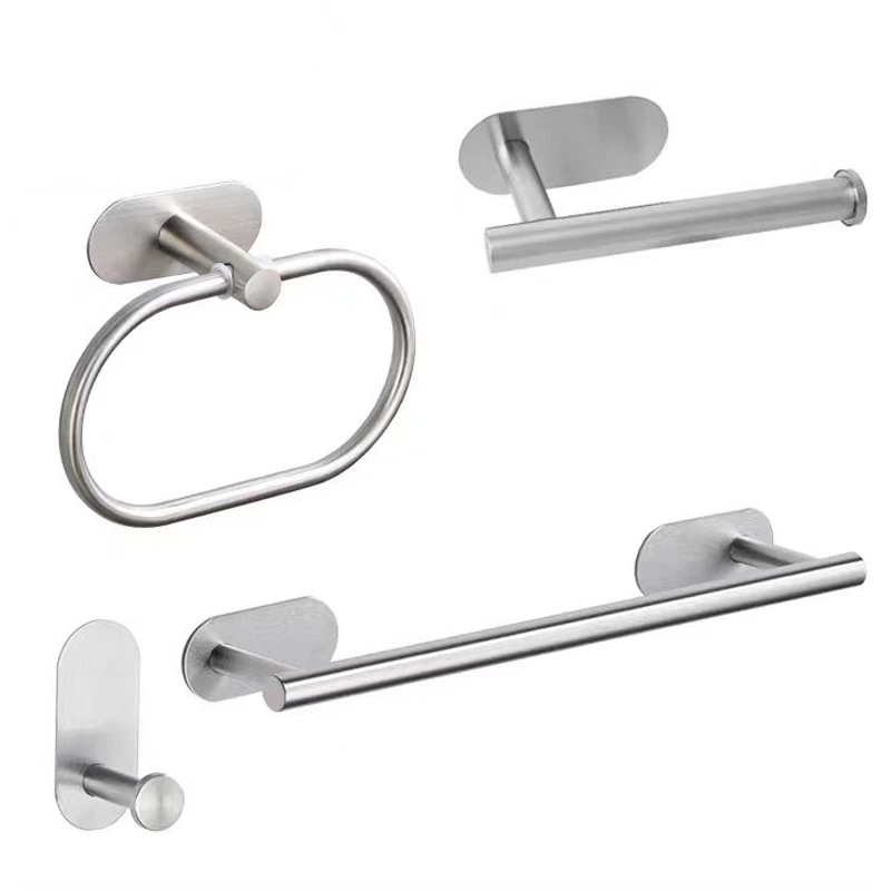 Product Information: Bathroom Accessories Set of Four Material: stainless steel Installation method: No punching installation, no punching required, Color: Brushed Silver, Gold, Black Product quantity: 4 pieces Towel pole X1 Paper towel rod X1 Towel ring X1 Coat hook X1 Due to manual manufacturing, there may be an error of 5mm Bath Hardware Set Finishing:Stainless Steel Surface Finishing:Brushed Main Material:Metal Material:Chrome Steel Type:Bath Hardware Sets