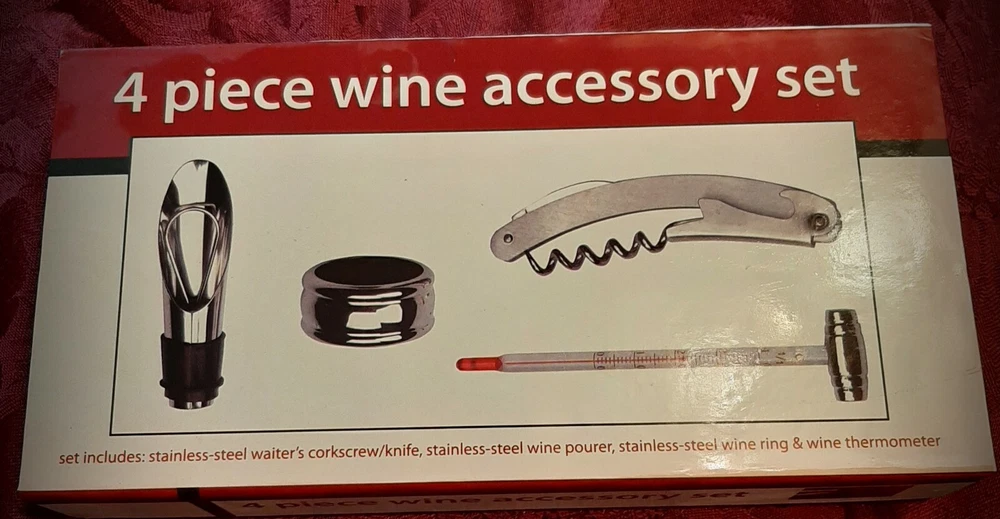 4 Piece Wine Accessory Set From Atico International USA. Stainless Steel. The boxed set includes: *Waiter's Corkscrew/Knife *Wine Pourer *Wine Ring *Wine Thermometer Shipping with USPS Priority Mail