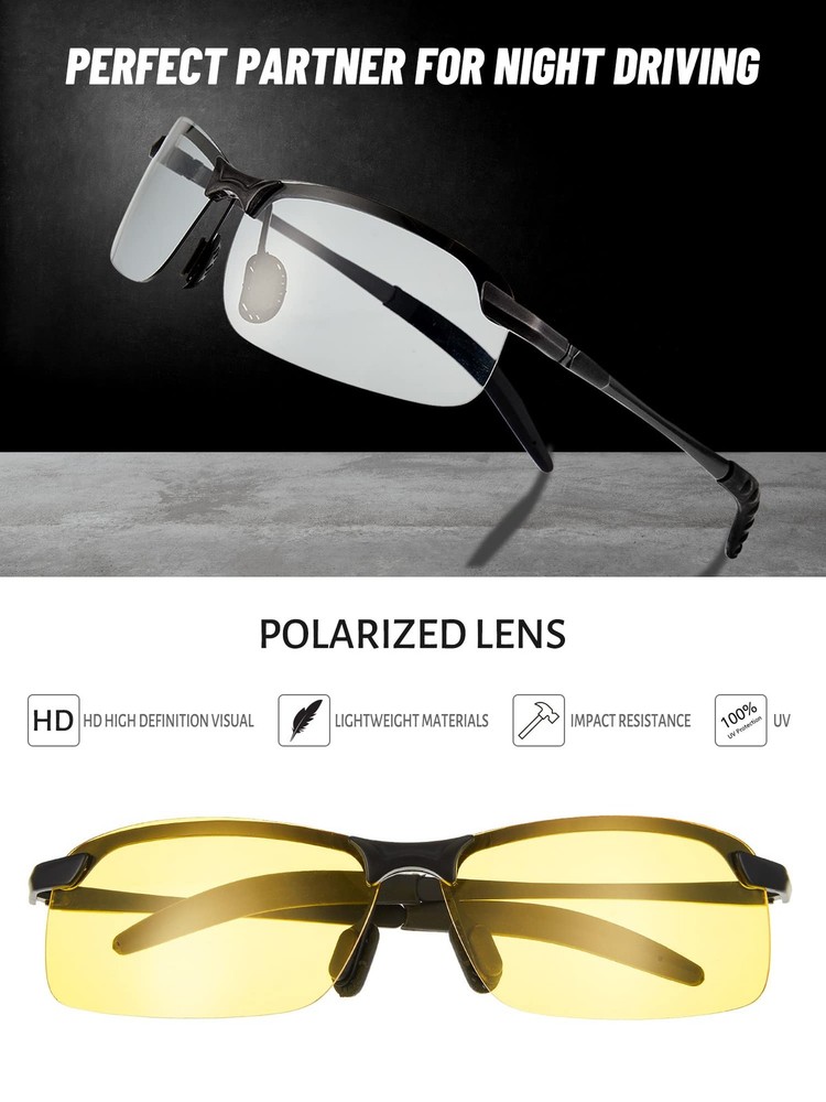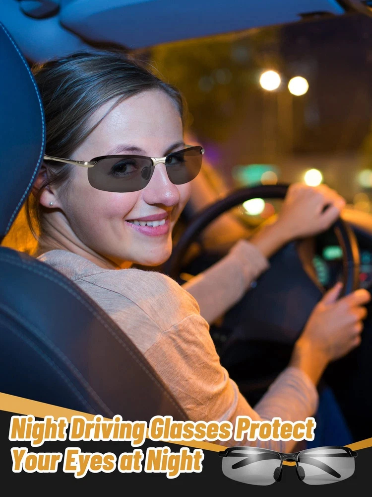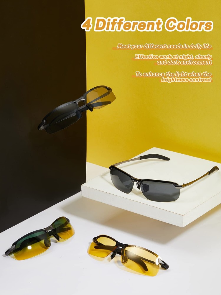 Features: Multiple styles for you: You will receive 4 pieces of driving polarized glasses in different styles, including the color changing film, day and night film, night film and gray film. The sufficient quantity and rich styles can meet your needs for various situations, and you can also share them with your family or surrounding friends. Utility gift supplies: These glasses for driving at night are feasible to be sent as practical gifts to your girlfriend, boyfriend, wife, husband, colleagues, friends, relatives and some others, making them feel your sincere and considerate thoughts, and they will thank you for your useful, warmhearted items as well. Specifications: Color: as pictures shown Frame material: plastic and metal Size: Lens width: approx. 6.5cm/ 2.56 inches Lens height: approx. 4cm/ 1.57 inches Length of glasses: approx. 14.4 cm/ 5.67 inches Width of glasses: approx. 14.1cm/ 5.55 inches Package includes: 4 x Night driving glasses Warm notes: Manual measurement, please allow slight errors on size. The color may exist slight difference due to different screen displays. Functional Lenses for You to Choose: these night driving glasses have diversified lenses for your use under different circumstances, both for day and night; In the daytime, the lens surfaces can reflect sunlight from different angles, and make you see more clearly at night, ideal for some car and truck drivers' night driving Avoid Your Eyes from Direct Sunlight: our nighttime anti glare glasses are featured with UV protection, reducing the harm from the UV rays, protecting your eyes from strong daylight in the process of driving, and making you have a better using experience Ingenious Design: our night driving sunglasses for men adopt an innovative design, can fit your face well, not easy to slip off while you have some movements; Alongside that, the silicone nose pads will relieve some stress from the glasses frames, satisfying your need for a comfortable wearing in daily life Versatile Performances: our polarized sunglasses for night driving can be widely applied to most aspects of your life, such as outdoor sports, driving, riding, cycling, hiking, climbing, traveling, walking, strolling, running and more, making you look more dainty and fascinating, suitable for your wearing all year round Quality Material Selection: the UV driving glasses are mainly made of metal, plastic and lenses, the quality metal material makes your glasses frame more sturdy, not easy to break, bend or twist, serving you for periods of time, besides, the lenses come with fine workmanship, no scrape or scratches, you can use them with confidence