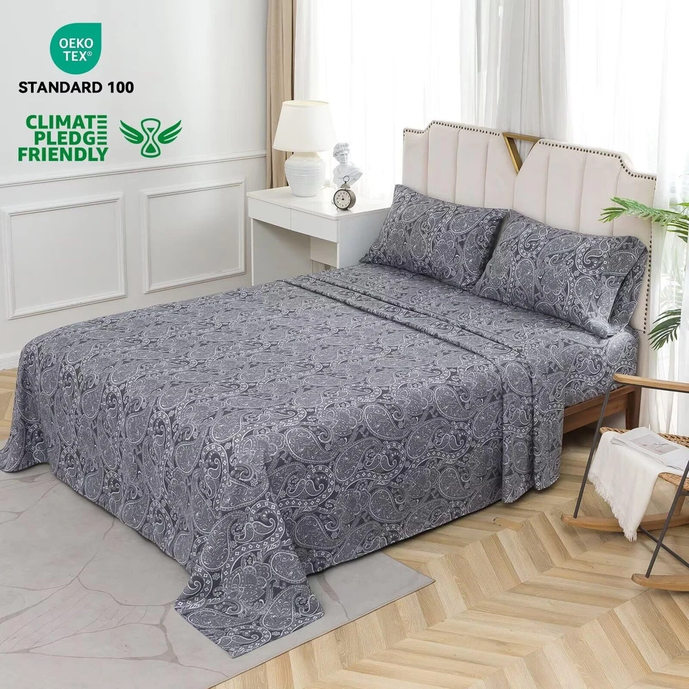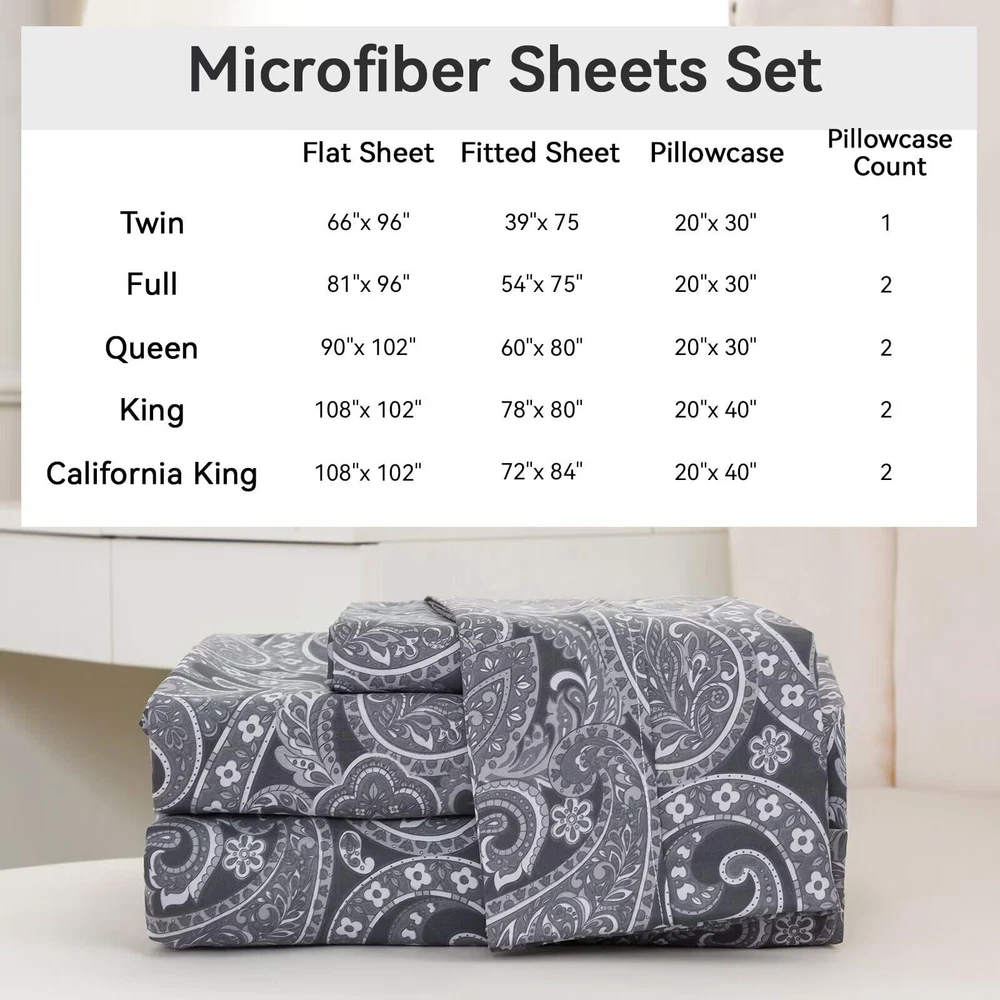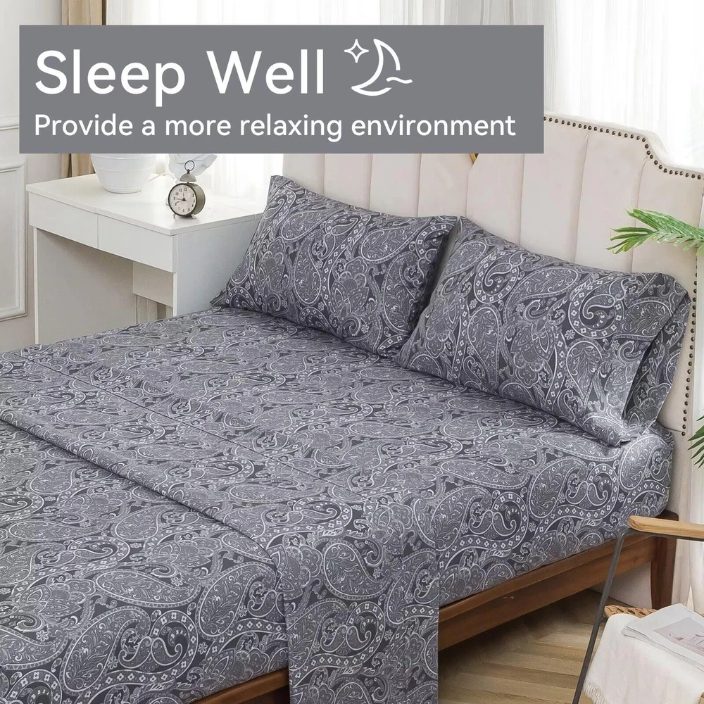 Ultra Soft: The microfiber material is incredibly soft and smooth, providing a luxurious feel against the skin. The gentle, brushed texture adds an extra layer of coziness, making it perfect for evenings. Deep Pockets: The fitted bed sheet features deep pockets and an all-around elastic band to ensure a snug and secure fit on your mattress. This prevents any slipping or bunching, providing a flat and comfortable sleeping surface. Envelope-Style Pillowcases: The pillowcases are designed with an envelope closure, which not only looks elegant but also keeps the pillows firmly in place. This feature helps maintain a neat and tidy bed, reducing the chances of pillows sliding out during the night. Temperature Regulation: Despite being warm and cozy, the fabric allows for good air circulation, helping to regulate body temperature. This means you stay warm without overheating, ensuring a comfortable sleep environment. Easy to Care For: The material is highly durable and maintains its quality even after multiple washes. It comes out of the dryer looking fresh and wrinkle-free, eliminating the need for ironing. The set is machine washable and dries quickly, making it convenient to care for.