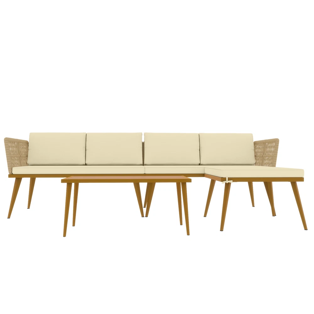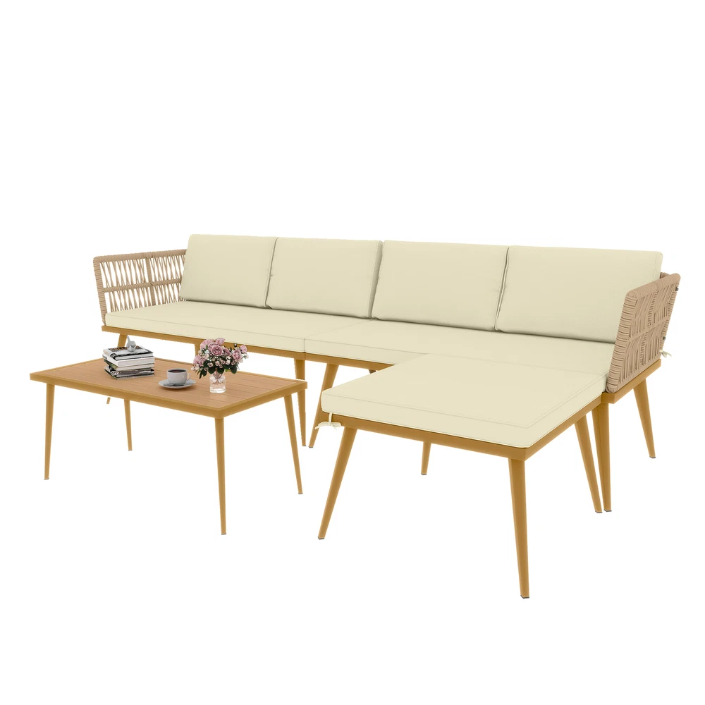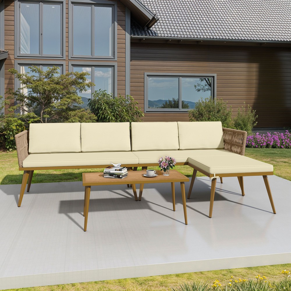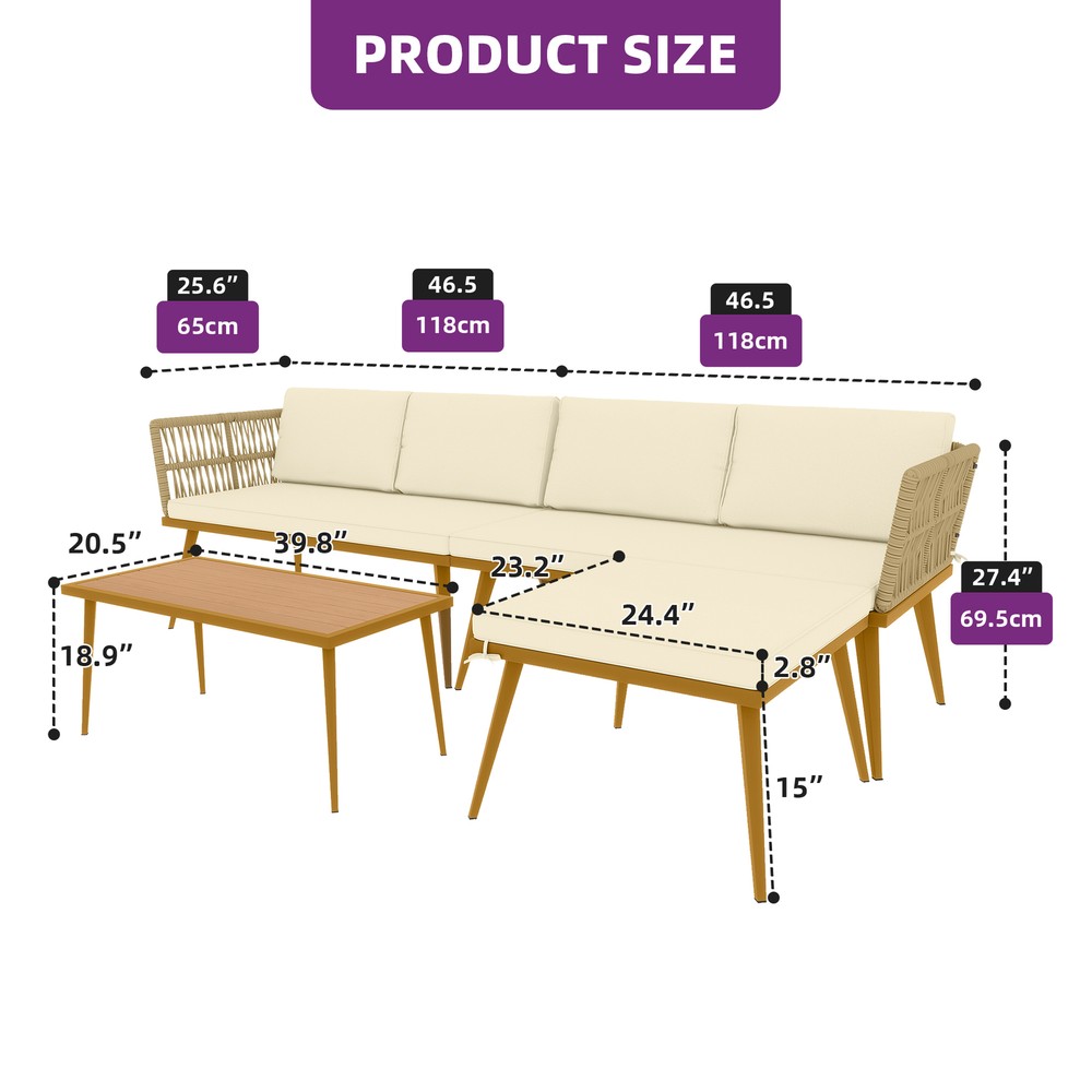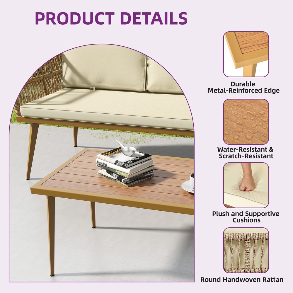 Tabletop Material: Rattan Chair Back Material: Rattan Type: Sofa Set Features: Weather-Resistant Assembly Required: Yes Item Width: 25.6in Department: Adults Manufacturer Warranty: 2 Years Cushions Included: Yes Feature: ESCP Material: Metal, Rattan, Wicker California Prop 65 Warning: This product can expose you to chemicals including dehp, which are known to the State of California to cause cancer and birth defects or other reproductive harm. Table Shape: Rectangle Set Includes: Back Cushion, Cushions Chair Color: Beige Seating Capacity: Up to 3 Style: Mid-Century Modern Brand: TAUS MPN: BEYSHqFGRu Cushion Color: Beige Assembly Status: Assembly Required Item Weight: 265lbs Umbrella Included: No Item Length: 93in Item Height: 27.4in Color: Beige