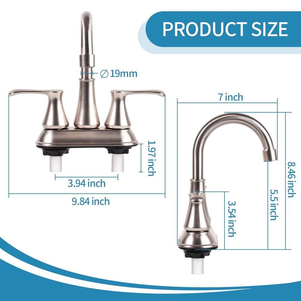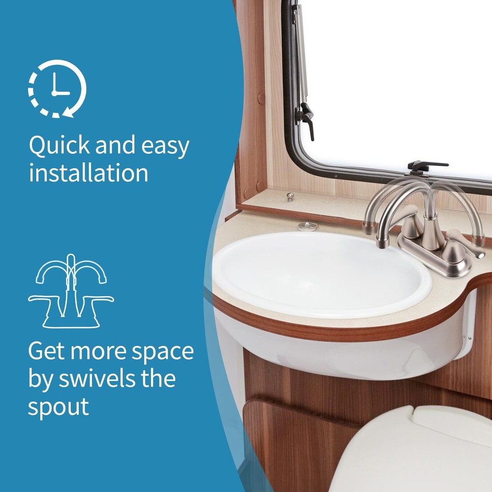 4 inch RV Bathroom Faucet, RV Bathroom Sink Faucet Replacement for Campers, RV, Motorhome, Travel Trailer, Boat (Brushed Nickel) **Cannot be Shipped to California** Design for RV faucet replacement. compat with most US standard rv sink. Easy 2-Holes Installation. No plumber need Brushed Nickel Finish provide a stylish looking and math versatile style. polishing finish can resist strong corrosion,scratch-resistant Premium ABS material made. the material promised the quality for cUPC request. And provide lightweight and durable rv faucet Easy Operation, Two-Handle lever for quarter-turn stops. 360 degree swivels can reach the whole sink Quality test passed life time Drip-free cartridges. Flow rate is 2.2 GPM at 60 PSI, and 8.3 L/MIN at 414 KPA. RV FAUCET, RV BATHROOM FAUCET,RV bathroom faucet replacment Shipping We offer FREE shipping on all orders! We ship within Three business days of payment, usually sooner. We use a selection of shipping services such as UPS, FedEx, USPS etc. We only ship to the lower 48 states, no APO/FPO addresses or PO Boxes allowed. Local pickups and combined shipping options are not provided at this time. Return You can return a product for up to 30 days from the date you purchased it. Any product you return must be in the same condition you received it and in the original packaging. Please keep the receipt. Payment We accept payment by any of the following methods: PayPal Please pay as soon as possible after winning an auction, as that will allow us to post your item to you sooner! Feedback Customer satisfaction is very important to us. If you have any problem with your order, please contact us and we will do our best to make you satisfied. Contact Us If you have any queries, please contact us via ebay. We usually respond within 24 hours on weekdays. Please visit our eBay store to check out other items for sale! Thank you for shopping at our store.
