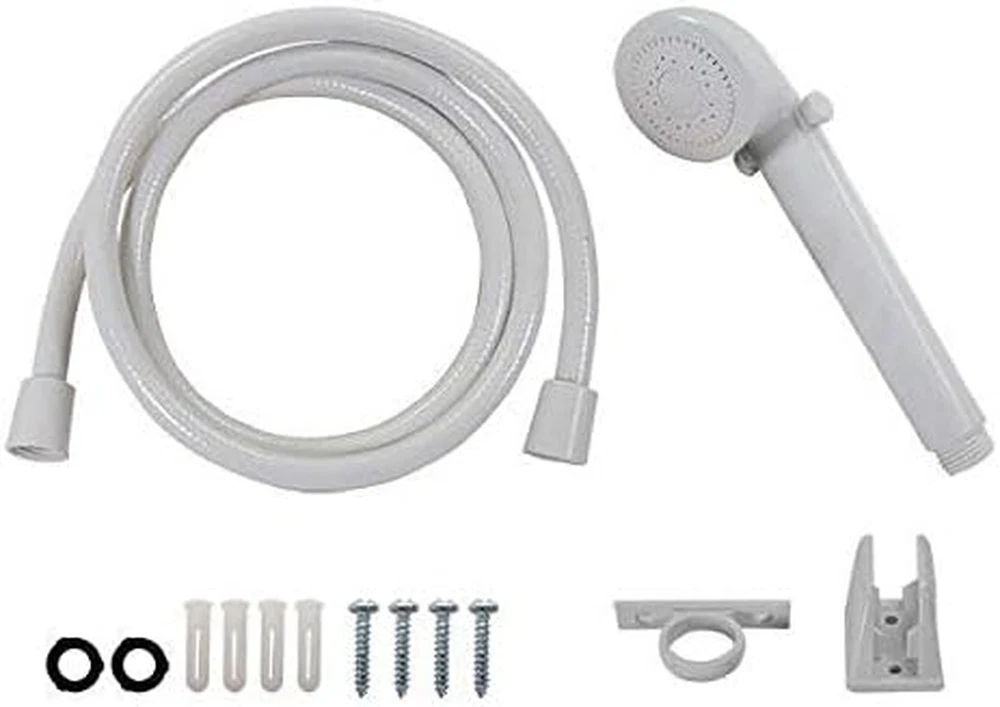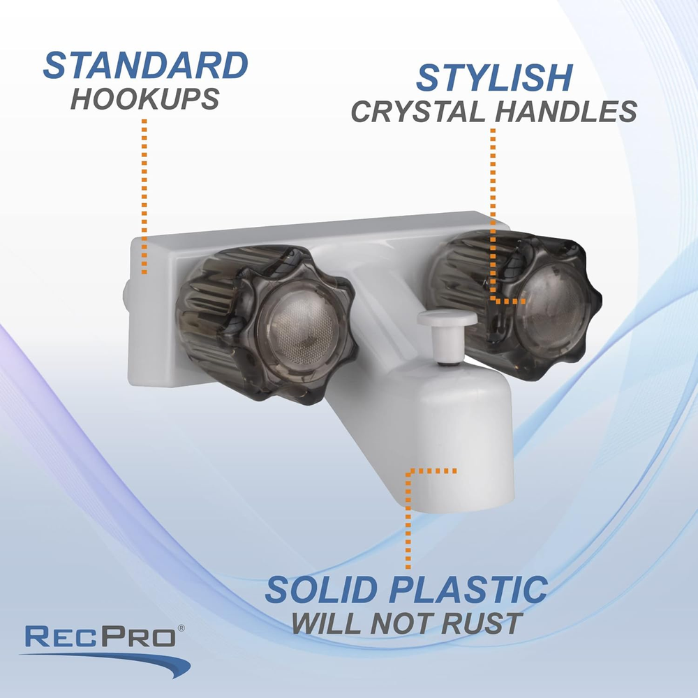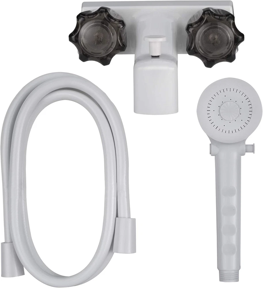 Faucet Dimensions (base) - 6 1/4" W (widest) x 5 7/8" W (tapered) x 2" H Stylized crystal handles Standard hook-ups Solid plastic won't rust Product Description Product Description Diverter Faucet Details: Dimensions (base) - 6 1/4" W (widest) x 5 7/8" W (tapered) x 2" H Dimensions (overall height) 4" H Dimensions (overall depth) - 4" D Stylized crystal handles Standard hook-ups Colors - White/Smoke Front-mounted Plunger handle Solid plastic won't rust Handheld Shower Head Details: Material: Plastic Color: White 2 Washers 4 Screws 4 Anchors Plastic guide ring Plastic bracket