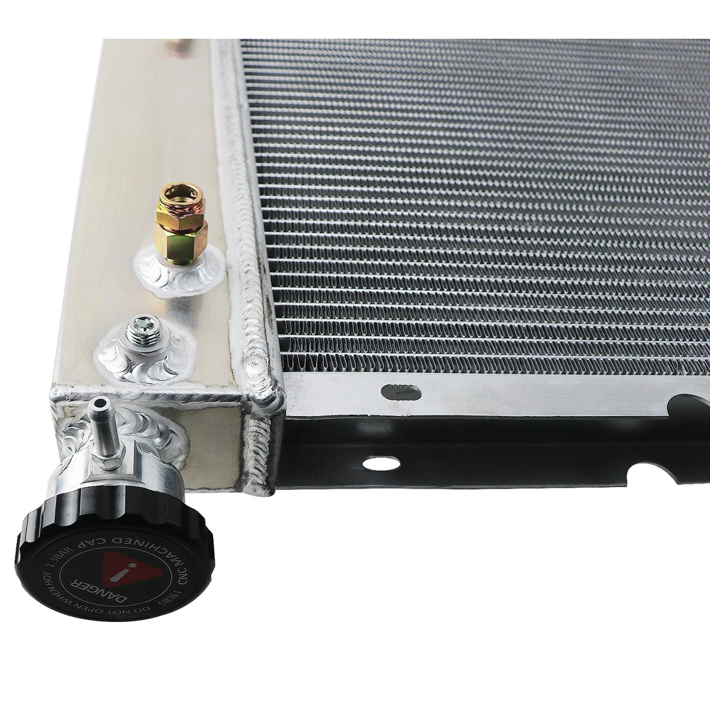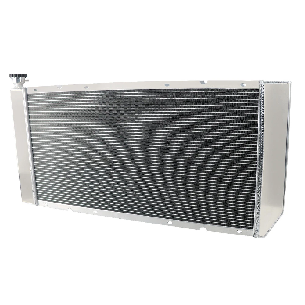 Application: Fits 1988-1999 Chevy C/K Truck 5.7L - 7.4L V8 Engines Fits 2000 Chevy C/K Truck 5.7L V8 Engines Fits 1992-1994 Chevy Suburban/Blazer 5.7L-7.4L V8 Engines Fits 1995-2000 ChevyTahoe/1992-2000 GMC Yukon 5.7L V8 Engines Fits 1999-2000 Cadillac Escalade/Escalade EXT 5.7L V8 Engines This Radiator Size: Material: AA5052 Aluminium High Performance Racing Spec. 4-Row of tubes Core Racing Design Core Dimensions: 34" Wide X 17 1/4" High Overall Dimensions: 40 5/8 " Wide X 20 3/8" High Tank Dimensions: 3 1/4" X 18 1/2" Inlet Hose Connection:1 5/16" Driver Side Outlet Hose Connection:1 9/16" Passenger Side Transmission Cooler: 1/2"-20UNF(Z) Engine Oil Cooler: M20*1.5 Radiator Drain Plug: OEM Style Brass Petcock Drain Radiator Cap: CNC Precision Machined Radiator Cap Please Check the Size Before You Buy! Reasons for choose our AA5052 Aluminum Radiator : 1.Our Radiator is made of AA5052 aircraft aluminum, AA5052 Aluminum major alloying element is magnesium,has a higher strength and greater corrosion resistance (including to salt water). 2.Higher density core: cooling rows are spaced 3/8" apart,giving you 25% more rows within the core than other aluminum radiators sold on eBay. 3.14-16 cooling fins per inch,giving you approximately 1500 more cooling fins than other aluminum radiators. AA5052 aluminum radiator core can be made more efficient by changing the tube spacing and fin count. If the tubes are placed closer together and the fins are packed in tighter a denser core is created that throws off much more heat. A high efficiency core can have tubes on 3/8" centers and fin counts increased to 14 to 16 FPI,That may not seem like a big deal but the surface area is greatly increased. Combined with all the additional fins between the tubes this provides approximately 30% to 45% better cooling than the OEM radiator had. The core of the radiator is welded in vacuum brazing furnace, no epoxy.The Radiator are 100% welded by TIG.Stronger & Higher Capacity for Coolant than OEM units,Made of High Quality Full AA5052 Aluminum Construction.aluminum radiator is designed to provide maximum cooling efficiency to prevent premature engine failure.