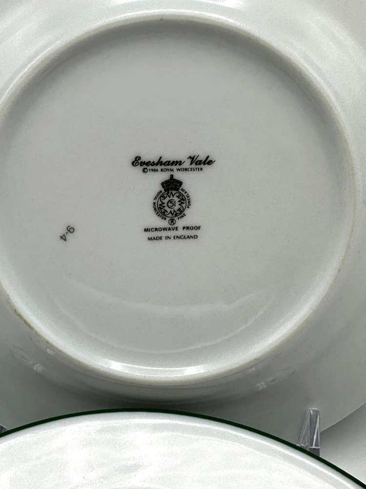 Era: Late 20th Century (1970-1999) Seller Notes: “Pre owned items with very little signs of use. No chips, cracks, or crazing.” Vintage: Yes Care Instructions: Machine Washable up to 140°F Production Technique: Pottery Theme: Fruit Time Period Manufactured: 1980-1989 Year Manufactured: 1986 Type: Bread Plate Features: Microwave Safe Shape: Round Finish: Glossy Antique: No Set Includes: Bread Plate Occasion: All Occasions Handmade: No Production Style: Art Pottery Material: Porcelain Pattern: Evesham Vale Country/Region of Manufacture: United Kingdom Origin: England Number of Items in Set: Four-Piece Department: Adult Color: Multicolor Brand: Royal Worcester Original/Licensed Reproduction: Original Plate Diameter: 6 5/8" Backstamp: Printed