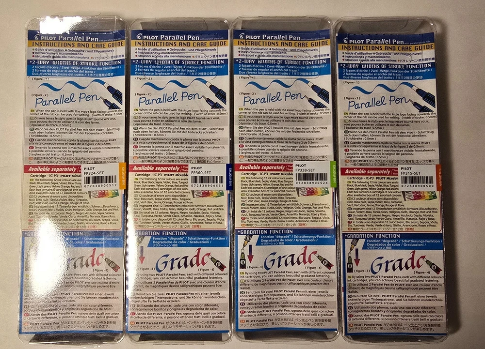Pilot Parallel Calligraphy pen 1.5mm 2.4 3.8 .6.0 The “Parallel" nib consists of two parallel plates, allowing the writer to create much sharper lines than with other calligraphy pens. It can also create gradated colors by transferring ink from one pen nib to another, allowing two different ink colors to then be used from one pen nib. The set of 4 pens includes 1 each of the 1.5 mm, 2.4 mm, 3.8 mm and 6.0 mm nib sizes. Each box contains a Parallel Pen, 2 ink cartridges, converter for cleaning pen unit, nib cleaner, instructions and care guide. Made in Japan. 1 set 4 size :1.5mm .2.4mm .3.8mm .6.0mm pens Made in Japan by Pilot Co. Ltd