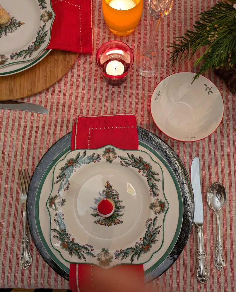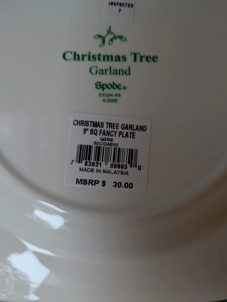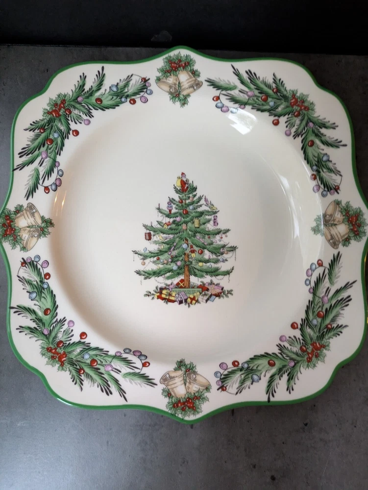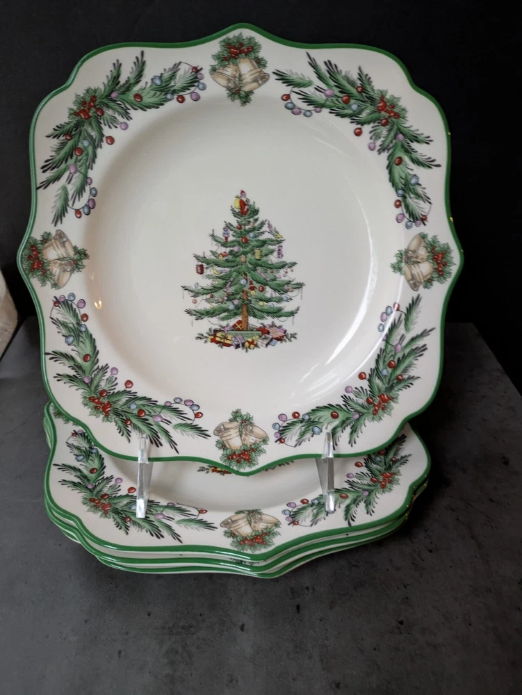 This listing includes four square salad plates in the extra fancy garland and bell motiff for Spode Christmas Tree. These are in perfect condition with the store sticker intact. They make such a lovely table stack and are a nice addition to Spode collectors.