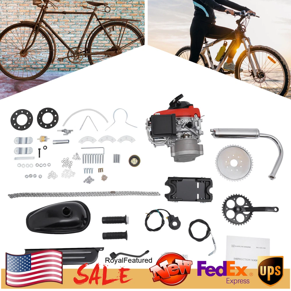 ❤❤❤Welcome to royalfeatured ❤❤❤ 4-stroke 53cc Gasoline Engine, Engine Kit, 4-stroke Engine Kit Description If you are looking forward to modifying your bike to be faster, then try this gasoline-powered 53cc four-stroke engine. The maximum power of this engine is 1.5kw, and the rotating speed is up to 6800rpm. It runs efficiently with low noise, giving you a more comfortable riding experience. Key Features Solid and Stable: This product is connected with high-quality screws, whose fixed effect is very good. And it features a solid base, which can maintain its stability when working. Safe and Efficient: With a maximum power of 1.5kw and a safe TCI ignition system, you can use this product safely. In addition, its working speed can reach 6800rpm, providing you with a fabulous riding experience. Complete Engine Kit: The engine is equipped with all the needed hardware that can upgrade most traditional bicycles into electric bicycles, including an engine, wrench, bolts, chains, etc. You don't need to buy other accessories, which saves you a lot of money. Good Heat Dissipation: This engine has a forced air-cooling system for providing good heat dissipation while working, extending its service life. Large Capacity: The engine's fuel tank can hold 2L/67.6pz of gasoline, allowing you to use it for a longer period of time with a single fill-up. Fast and Smooth: It uses a four-stroke engine, which is more stable, reliable, and quieter than its 2-stroke competitors. And the heavy-duty metal engine adds much durability and stability, allowing for safe and smooth riding. Vibration Damping Design: This engine has the design of vibration damping, which gives you a better user experience. Low Noise: Low noise level for a four-stroke engine will not produce too much noise when riding and creates a good riding environment for you. Easy Operation : The starting system uses a T-shaped hand puller to start, which is convenient to operate and saves time and effort. Customer Service: We aim to provide quality products and services. If you have any problems, please feel free to contact us. We will reply and solve the problem for you as soon as possible. Details Aluminum Body: With an aluminum alloy body of great performance, this engine is strong and durable with a metallic luster. Plastic Housing: The engine's housing is made of strong and durable plastic, covering the main body of the engine and fully protecting it from damage. Application It is suitable for adult bikes, mountain bikes, road bikes, etc., upgrading them to electric bikes. Specification Color: Red Model: 144F(V) Material: Steel, Aluminum Alloy, Plastic Assembly Required: Yes Engine Type: Single Cylinder Stroke Type: Four-stroke Fuel Type: Gasoline ( #92/95) Power: 1.5kw Ignition System: TCI Compression Ratio: 7:4 Governor System: Fuel Gate Speed Control Output Method PTO: Clutch Output Engine Cooling: Forced Air Starting System: Hand-pull Start Fuel Tank Capacity: 2L/67.6oz Fuel Consumption: About 550g/kw Hour Displacement: 53cc Rotational Speed: 6800rpm Max. Torque: 2.0Nm/4500rpm Bore&Stroke: 44*35.8mm/1.7*1.4inch Engine Size (L*W*H): 40*32*35.5cm/15.7*12.6*13.97inch Package Size: 60*30*29cm/23.6*11.8*11.4inch Gross Weight: 14.5kg/31.97lbs Package Included 1* 53cc 4-stroke Engine 1* English Manual Other Accessories for Assembly Notes 1. We recommend that you wear a helmet and do not ride too fast. 2. When starting, please use force evenly along the direction of pulling the rope, and do not pull it diagonally. 3. Please allow the slight color difference caused by the shooting light and 1-3cm error due to manual measurement. Please make sure you do not mind before you order. Payment Delivery details Terms of sales About us Contact us Payment We accept ebay payment 。 Fees such as import duties, taxes are not included in the item price or shipping costs. These charges are the buyer's responsibility. Delivery details Shipping: 2-9 working days to: USA Terms of sales We maintain high standards of excellence and strive for hundred percent customer satisfaction. Feedback is very important to us. We hope that you contact us immediately before you give neutral or negative feedback, so that we can address your concerns. It is impossible to address issues if we do not know about them! About us Your satis faction is our ultimate goal. We work hard to earn your trust and future business. Our certified technicians have tested each item before shipping. The unit comes with 1 year limited warranty on all manufacturing defects. a) If you receive a defective item, you may return it or ask for a discount. Please contact us within 14 days after you receive the package. b) What you returned must be intact and in its original packaging as re? u. Customer is responsible for shipping costs of the returned item. c) We will cover the cost of shipping back t with the shipping rate indicated in the registration page. We will send you a new unit or refund the full payment you paid. Thank you. Contact us Business Hour Business Hour: Monday To Friday: 8:30 AM to 5:00 PM (Beijing China time) Due to time zones, our reply to your questions may not be immediately. But within above working time, we will reply your email within 24 hours. If it's non-workdays, please kindly be patient and wait till Monday. Please contact us with ebay message. Please feel free to contact us if you have any questions. Monday To Friday: 8:30 AM to 5:00 PM (Beijing China time) Due to time zones, our reply to your questions may not be immediately. But within above working time, we will reply your email within 24 hours. If it's non-workdays, please kindly be patient and wait till Monday. Please contact us with ebay message. Please feel free to contact us if you have any questions. Engine Type 4-Stroke, Air-cooled, Single Cylinder, OHV Engine Model 142F Type 53cc 4-Stroke Bicycle Engine Kit Fits For normal 28" V frame bike and 26" ATV bike Features With Double Chain Drive, Stable, Reliable and