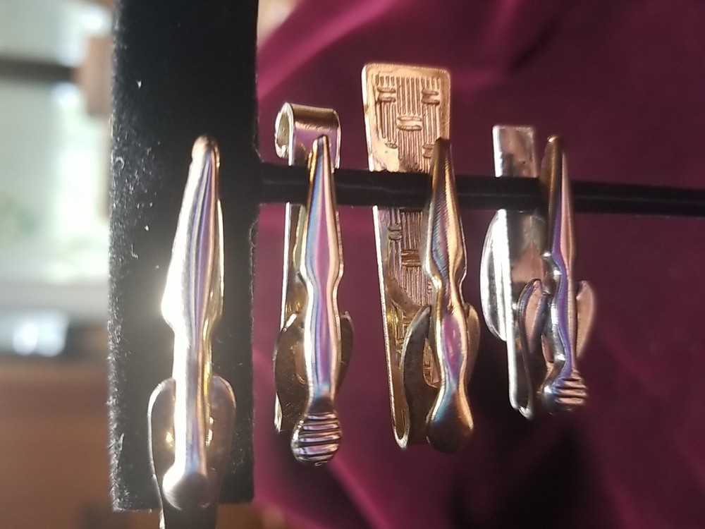 The product is a set of 4 tie bars, with 3 goldtone and 1 silvertone, that are unmarked in terms of brand or maker. These tie bars are designed to hold a necktie in place and add a touch of sophistication to a formal outfit. The goldtone and silvertone colors give them a classic and stylish look, perfect for adding a touch of elegance to a man's ensemble. Ideal for those looking for a versatile and high-quality accessory to elevate their formal attire.