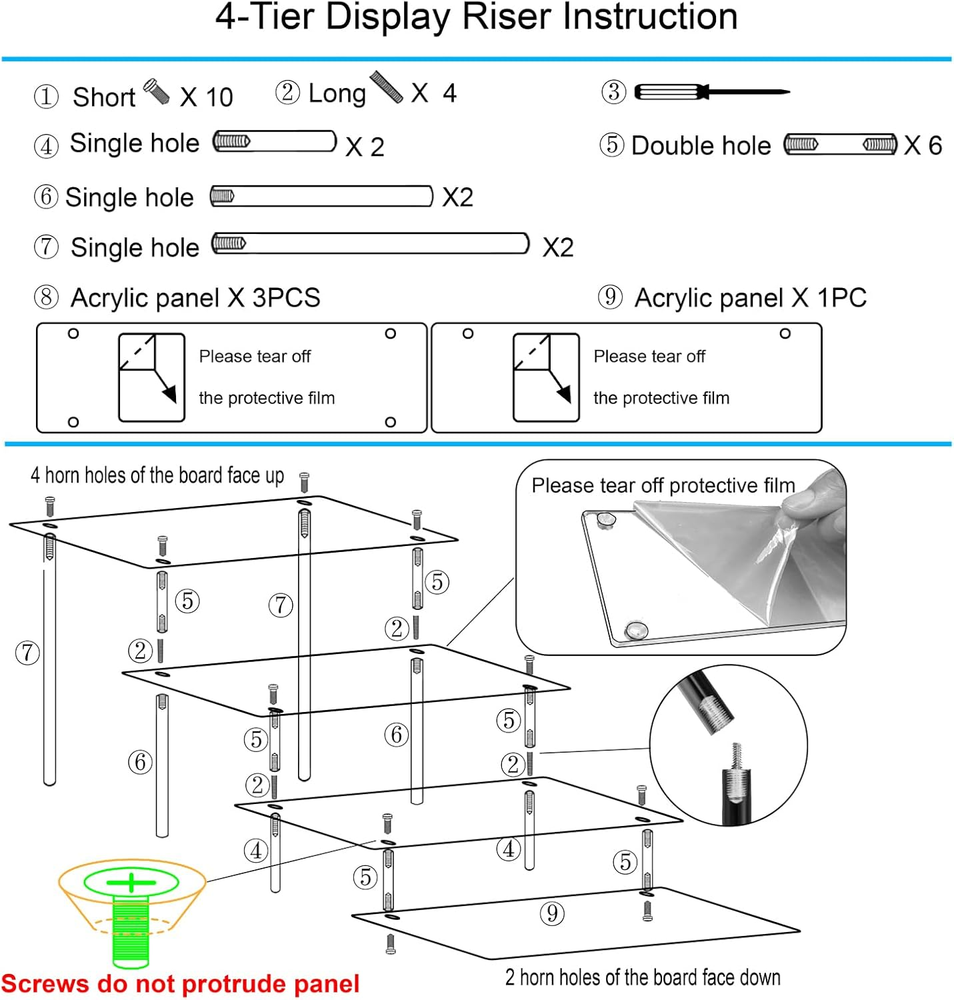 Keep things organized: 4 Tier acrylic display risers can keep your things organized, saves space. You can find them quickly and easily, no more searching messy drawers, all of your things. Acrylic risers for display shelves are easy to place, fit on your dresser, table organization, funko pop display case, and are also suitable for all colors or themes of the room Display More Things: SIZE: Every acrylic panel is 11.6 IN long and 3.0 IN wide, the total height is 5.8 IN. 4 tier cupcake stand is simple design and solid. Acrylic cupcake stand 4 tier features 4 layers that provides enough space to cologne perfume, cosmetic, skincare lotion, Amiibo Funko POP Figure, dessert, cupcake risers, collectibles and etc Ideal Presents Choice: 4 tier acrylic shelf riser is ideal presents for your better half, girlfriend, daughter, mother and friends in many kinds of festivals, such as Valentine's Day, Mother's day, Wedding, Thanksgiving, Birthday, Anniversary, Christmas, New Year and etc Quickly Easy to Assemble: Acrylic perfume stand organizer is clear material, quickly easy to assemble and sturdy in the state of tightening screws. Perfume organizer for dresser also easy to clean, easy to disassemble and store What You Get: 4 tier acrylic stand riser include 1 X 4-tier display stand, 1 X Phillips Screwdriver, 1 X Specification Product Description 4 Tier Perfume Organizer/ POP Figure Display Stand/ Cupcake Stand/ Shot Glasses Display/ Lotion Organizer/ Cologne Organizer/ Spice Rack Organizer About HENABLE 4 Tier Acrylic display risers • HENABLE is a company with many years of design and processing of all kinds of hardware products, and has a solid and experienced design and production team. Our designers have an average of more than 10 years of industry experience. • Its products have been exported to many countries around the world. The primary products sold are a variety of display shelves and related products, with a focus on the display of retail end products of major brands, display cabinets for branded products in need of promotion, risers display and other products. • Clear perfume organizer makes it easier and faster to find the perfume you need, no longer worry about messy desktops. Advantage 4 tier cupcake stand • HENABLE Clear Acrylic Shelf Risers for Display is worth having, it can help you keep your things in order and display, saves you time. The 11.6 x 10.3 X 5.8 IN cupcake stand 4 tier can hold 16 pcs 2.5 IN cupcakes. • Acrylic Perfume Stand is made of acrylic, high clear material with a simple structural design that is not prone to deformations and is solid. • The holes on each plate are bellmouth orifice, which are not higher than the surface of the plate when the screws are locked to prevent the screws from hitting other things Easy to Assemble • In order not to scratch during transportation, Acrylic Shelf Risers are protective films on both sides of the bottom plate of the display frame. Keep the screws below the surface of the plate . • Perfume Stand Organizer size: Every acrylic panel is 11.6 IN long and 3.0 IN wide, the total height is 5.8 IN. • Acrylic stand riser include 1 X 4-tier display stand, 1 X Phillips Screwdriver, 1 X Specification.