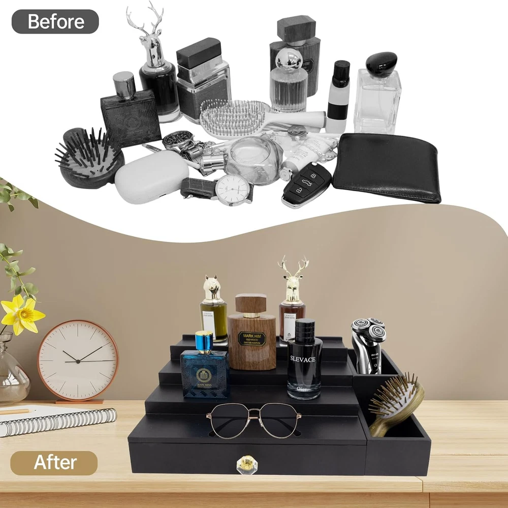 4 Tier Cologne Organizer Stand with Drawer and Hidden Black 4 Product Details Brand: Iswabard Color: Black 4 Tier Material: Wood Product Dimensions: 8"L x 7"W x 4"H Shape: Rectangular Tray Type: Wood Special Feature: solid Style: Casual Finish Type: Painted Recommended Uses For Product: Perfume Number of Items: 1 Occasion: Wedding, Anniversary, Birthday Product Care Instructions: Wipe with Dry Cloth Pattern: Solid Theme: Men's Grooming Is Oven Safe: No Is Dishwasher Safe: No Manufacturer: Iswabard Item Weight: 7.34 pounds Country of Origin: China Item model number: xiang Organizer B Cologne Organizer for Men: This wooden perfume organizer is the best choice for men who love beauty. The four-layer design allows you to store multiple bottles of perfume. Secret Compartment Design: The wooden lid of the top layer of the organizer can be opened, and inside is a hidden storage space where you can store money, watches, and other valuables. Classy-Looking Cologne Organizer: The perfume storage box also has a separate compartment for bathroom items such as razors and toothbrushes. Works for Men and Women: This organizer is simple and generous in design, and can be used by both men and women. Ladies can use it as a cosmetic organizer, lipstick, eye shadow, blush, perfume can be stored. Ideal for Gift Giving: It is the best choice for men. A gift for boyfriend, dad, or grandpa. This wooden cologne stand is perfect as a gift for people who have everything.