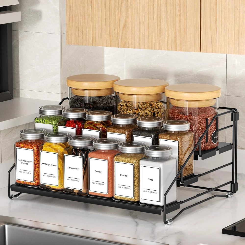 Upgrade your kitchen with this 4-Tier Spice Rack for Cabinet! Featuring an adjustable depth design (2.5–6.5 inches), it maximizes space for multi-size spice jars (holds 24 jars). Sturdy metal construction prevents tipping, while the ladder design ensures easy access. Perfect for cabinets, countertops, or pantries, it’s also versatile for toiletries, cosmetics, or crafts. Easy to assemble (no tools needed) and clean. Adjustable Depth Design, Rationalisation of Space: The spice rack organizer adjustable depth, 4 shelf can be combined to adjust the depth at will. Adjust the depth according to the size of spices you are storing, making efficient use of cupboard space. The perfect storage solution for multi-size spice jars. Note: Jars not included. 4 Tier Spice Rack Increased Cabinet Storage Capacity: 4 Tier spice organization for cabinet with ladder design keeps your spices organised and easy to reach. Holds 24 spice jars capacity, each spice organizer size is: 13 inchx10 inchx6.5inch, depth has: 2.5 inches. Suitable for most items storage for cabinets, countertops, pantries, bedrooms, bathrooms and more. Metal Material Strong & Sturdy: Seasoning organizer is made of high-quality metal, the each tier has a sheet metal base design. making the spice bottles more stable to place and less likely to tip over. With cabinet spice rack, you can nicely organized your spice bottles in your cabinet in leveled tiers. Easy to Assemble & Cleaning: Spice rack for countertop with folding design, easy to assemble, no screws required, with simple instructions. Get a cabinet countertop spice rack organizer in a breeze. Simply wipe with a rag and the spice rack is ready, brand new, caring for your spice cabinet organizer has never been easier. Multiple Item Storage: Countertop spice rack, more than just a spice organizer for your cabinet, it can also be used to store toiletries or nail polish bottles, cosmetics and medicines, or arts and crafts supplies. You can arrange and display them in an orderly manner on the desired countertop, in the cabinet, or in the corner!