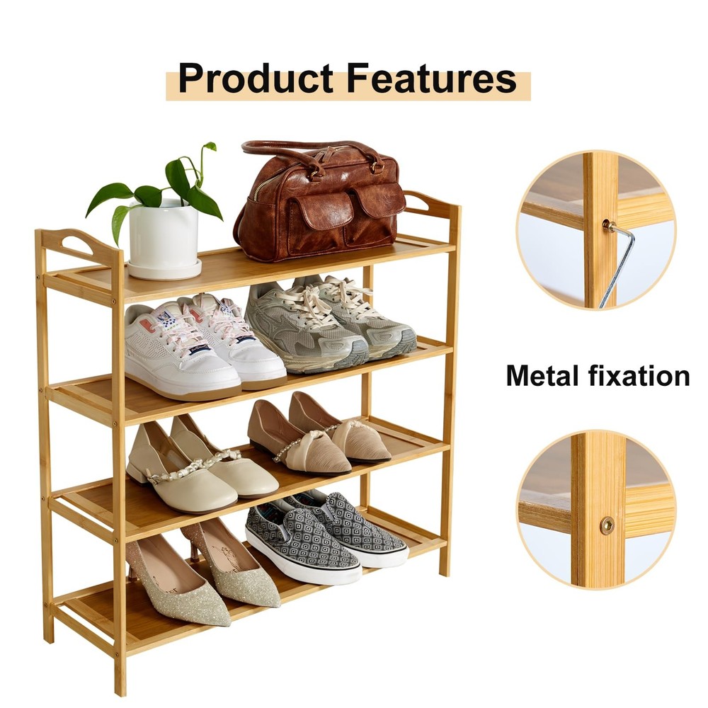 Bamboo Shoe Rack,Free Standing Wood Shoe Shelf, Multifunctional Bamboo Rack, Free Standing Shoe Shelf, Stackable Shoe Organizer for Hallway Closet, for Indoor & Outdoor Features: 【Space-saving storage】 The shoe rack for entryway is exquisitely designed, takes up little space, but has a large capacity, makes full use of space, effectively solves the problem of shoe storage, and can be easily placed even in a small space. 【Floor-standing design】 The Bamboo Wood Shoe Rack is stable and reliable, without worrying about tipping over. At the same time, there is space at the bottom for easy cleaning, keeping the floor clean and sanitary, making your home environment more tidy and comfortable. 【Multi-purpose use】 The X Tier Bamboo Shoe Rack can not only be used to store shoes, but also to place other items. The wooden shoe rack is very suitable for apartments, dormitories, bedrooms, living rooms, entrances, corridors, foyers, etc. Specifications: Product Name:Free Standing Wood Shoe Shelf Material: Natural Bamboo Color: Wood Color Structure: FiveLayers High-quality After-sales Service: We are committed to making every product well and creating high-quality products with heart. If you have any questions when buying our wooden shoe rack, please contact us in time. We will reply you online 24 hours a day and provide you with the best solution! Spacious X Tier Design:The free standing shoe racks features a X tier design offering ample space for all footwear. Impeccable for sneakers, high heels, or slippers, this entryway shoe rack keeps shoes organized and accessible. Premium Bamboo Material: This wooden shoe rack is durably and stylish. The smooth, polished surface adds elegance to your home, while the bamboo fragrance enhances your entryway or closet. Easy Assembly:The shoe rack for entryway features an easy assembly process. With included tools and clear instructions, you can set up this shoe shelf in minutes, enjoying a neatly organized shoe holder without hassle Sturdy and Durably:The sturdy construction of this shoe rack for closet wood supports multiple pairs of shoes without bending or breaking. Designed for long-term use, shoe organizer for entryway remains reliable in your entryway, hallway, or closet. Versatile and Stylish:Designed to complement any decor, the shoe rack for closet floor is versatile and stylish. Its sleek, modern design fits seamlessly into any entryway, hallway, or closet, enhancing the aesthetic appeal of your space.