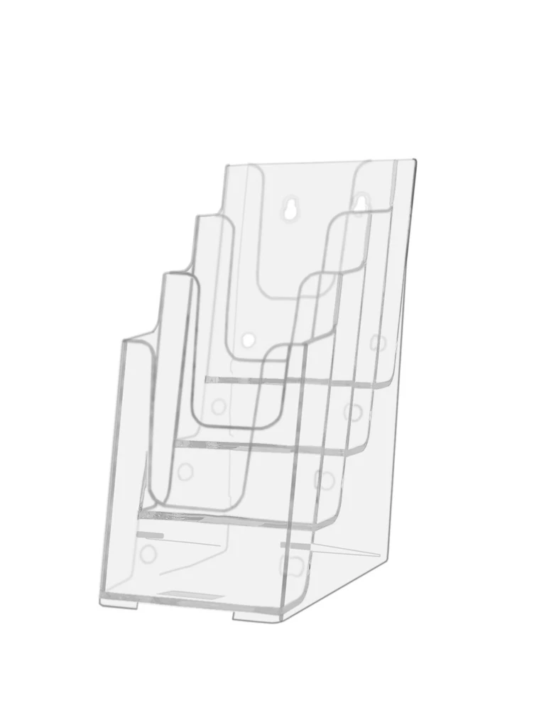 Trifold Holder for 4"W Brochures Tiered Multi Pocket Display Rack Product Features: Holds 4"W literature Brochure Pocket Dimensions: 4.25"W x 1.25"D Overall Dimensions: 4.5”W x 6.5”D x 10”H 4 pocket tiered countertop or hanging display stand for trifold brochures, pamphlets, takeout menus and flyers. Proudly made with premium high quality materials Marketing Holders multi pocket literature holder provides a simple yet effective tabletop or hanging display for pamphlets, brochures, rack cards and flyers. Use these holders to inform your customers or clients about hours of operation, today's specials or general informational notices. Our heavy duty advertising stands can be used on flat surfaces such as tops of a table, counter or desk near entrances and exits or reception areas so customers are prompted to take one when visiting your business. This versatile holder comes with 2 pre-drilled keyholes and is designed to easily hang on smooth surfaces. Elegantly showcase attraction brochures while saving space and keeping areas looking professional, clutter free and organized. The organizers are made of durable clear plastic such as acrylic, plexiglass, lucite and PETG polycarbonate materials. The brochure holder features a clear see-through pocket that offers a view of your printed media. These display holders are ideal for placement in doctor offices, hotels, amusement parks, government and business buildings, community centers, welcome centers or travel agencies. This stand is durable for use at colleges and universities, convention centers, restaurants, sports stadiums across the USA. *All sizes are approximate *Hanging Hardware Included *Under no circumstances is Marketing Holders responsible for any actions involving hanging products using self purchased or provided hardware. It is up to the purchaser to make sure they are using the hanging hardware correctly. We will also not be responsible for the product if it cracks during the hanging process or if it falls and breaks. Return Policy 30 Day Return Policy: By purchasing our product you are agreeing to our return policy, so please read! Perfect returns (NO used merchandise) on stock items are accepted within 30 days of delivery. Any visual appearance that the product is used will result in 00 refund. All returns are subject to a 20% inspection, re-boxing and restocking fee. All returns must be repacked and returned in their original packaging for protection. (MUST return on pallet if received on Pallet) Packages being returned should be insured by you for your protection No credits are issued on shipping costs. Absolutely no returns accepted on custom order displays, including orders with custom text, imprinting or graphics Return Policy 30 Day Return Policy: By purchasing our product you are agreeing to our return policy, so please read! Perfect returns (NO used merchandise) on stock items are accepted within 30 days of delivery. Any visual appearance that the product is used will result in 00 refund. All returns are subject to a 20% inspection, re-boxing and restocking fee. All returns must be repacked and returned in their original packaging for protection. (MUST return on pallet if received on Pallet) Packages being returned should be insured by you for your protection No credits are issued on shipping costs. Absolutely no returns accepted on custom order displays, including orders with custom text, imprinting or graphics