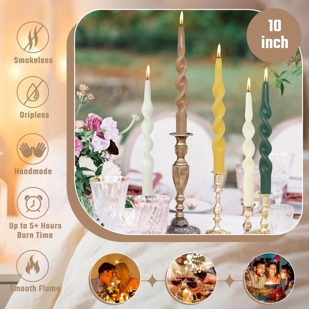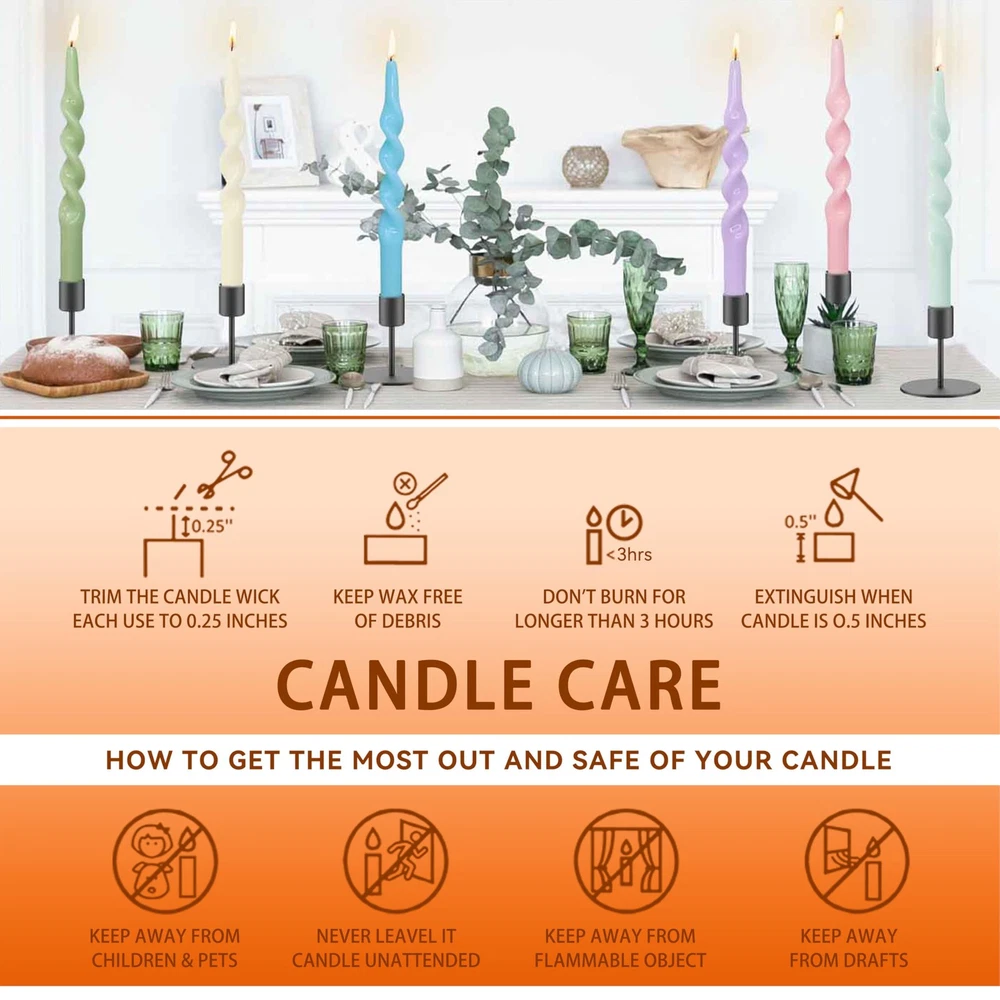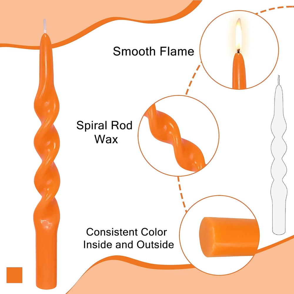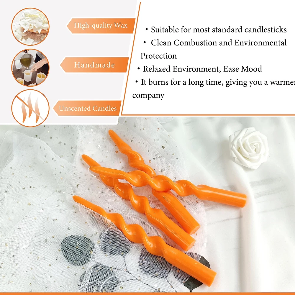 4 PCS Orange Taper Candle 10 inch Twisted Candles Unscented for Christmas Halloween Dinner Wedding Home Decor, Relaxation & All Occasions 【4 PCS Orange Spiral Taper Candle】This orange spiral candles is made of high-quality paraffin, twisted shape, very beautiful, can create a unique decorative effect, make your room more elegant, warm and romantic, make your home become more beautiful. 【Unscented Taper Candle Orange】In order to give you the best experience, our cute taper candle orange is unscented, so you can use it in front of people with allergies. Unscented orange taper candlesticks won't distract you or spoil your mood with strong, unpleasant smells. 【Handmade Spiral Candle Orange】This orange twisted tapered candle uses 100% cotton wick, which is not only environmentally friendly, safe and healthy, but also has less smoke when burning, so that you can enjoy the beauty of candlelight more at ease and comfortably. When you light this orange twisted candles, it will emit soft light and warm atmosphere, bring more warmth and romance to your room and life, and make your life more interesting and colorful. 【Pure Orange Candles】Each orange candle has the same color from the inside to the outside, full of romantic colors, which can meet your various needs in daily life and parties, and can also be shared with family and friends. Orange taper candles are very suitable for placing on the dining table, window sill, shelf, bedside table, floor, etc., adding warmth and romance to your study, bedroom, living room, etc. 【10 INCH Taper Candlesticks】These purple candles sticks candles are versatile and work well with any standard candle holder. Their classic shape complements almost any decor. Purple candles to meet your needs; perfect for christmas, weddings, romantic dinners, churches, meditation, blackouts, baptisms, ceremonies, Sabbath, home use, holidays, etc.