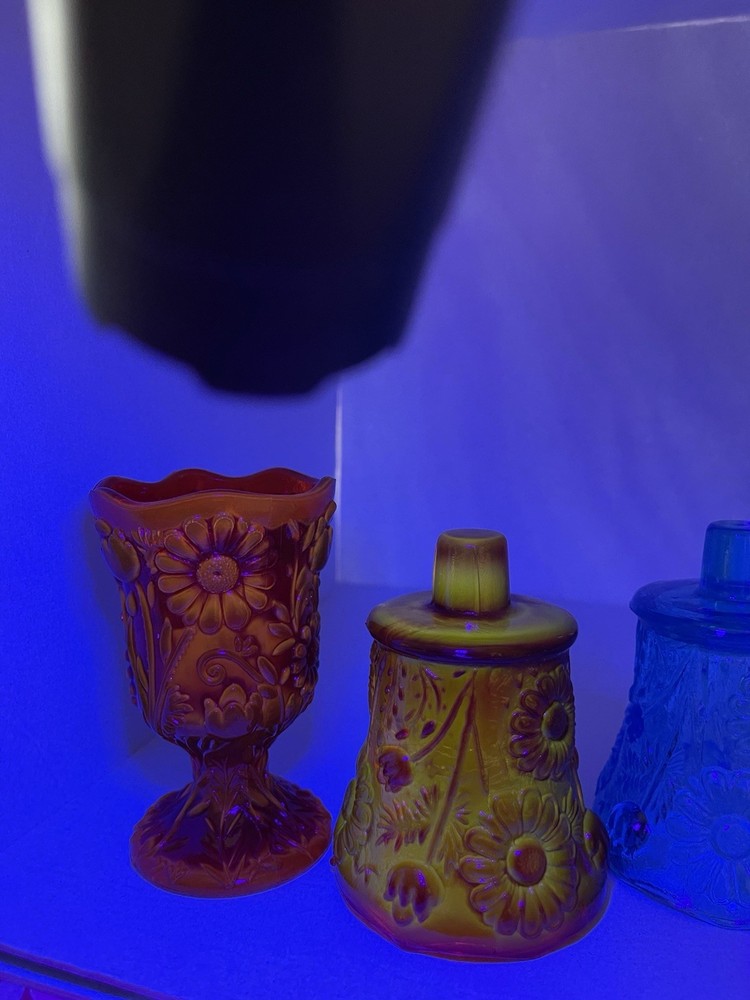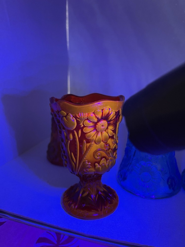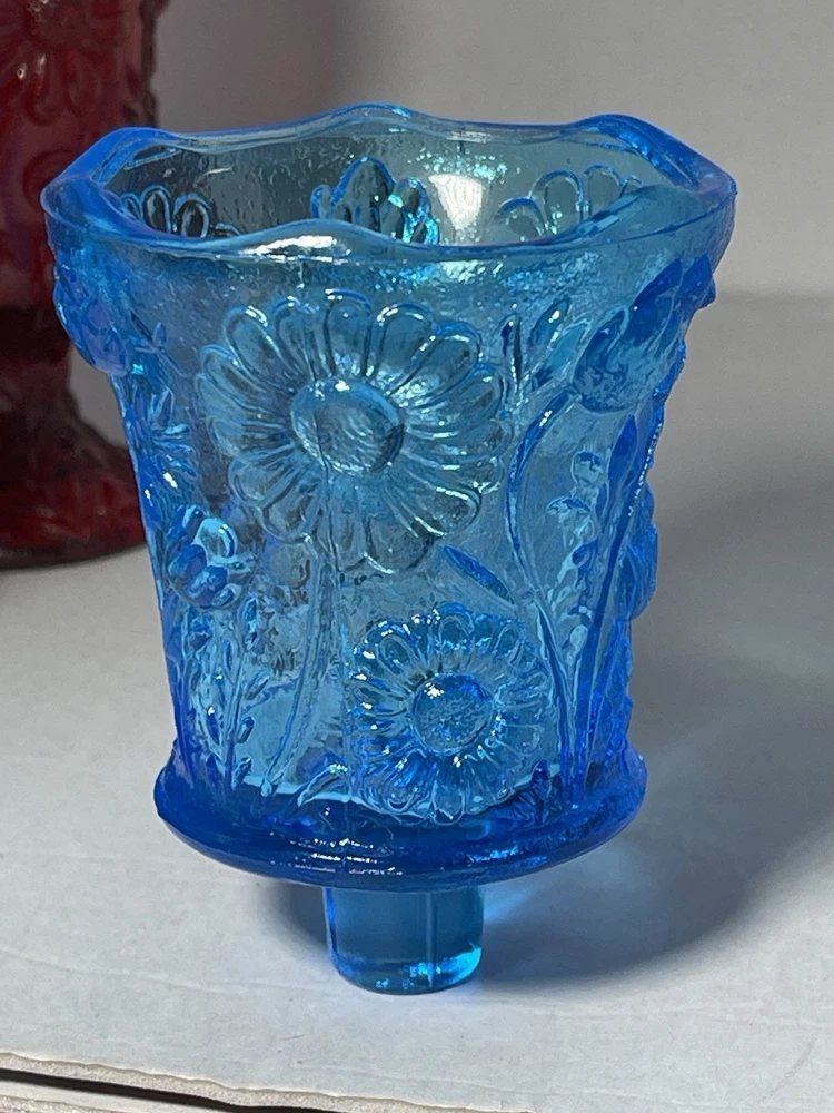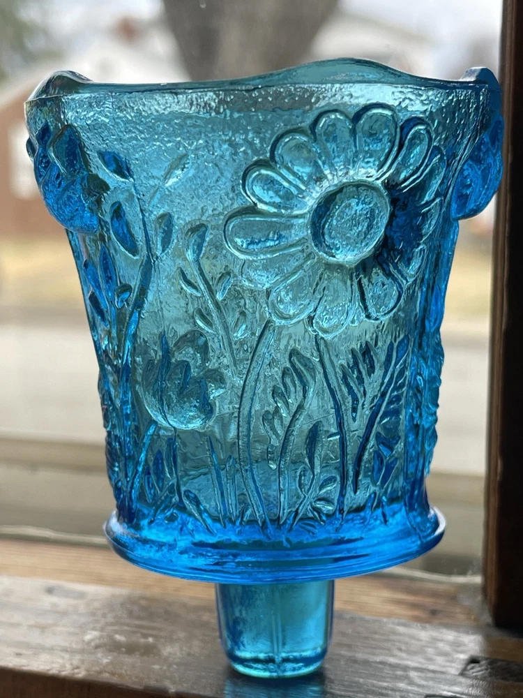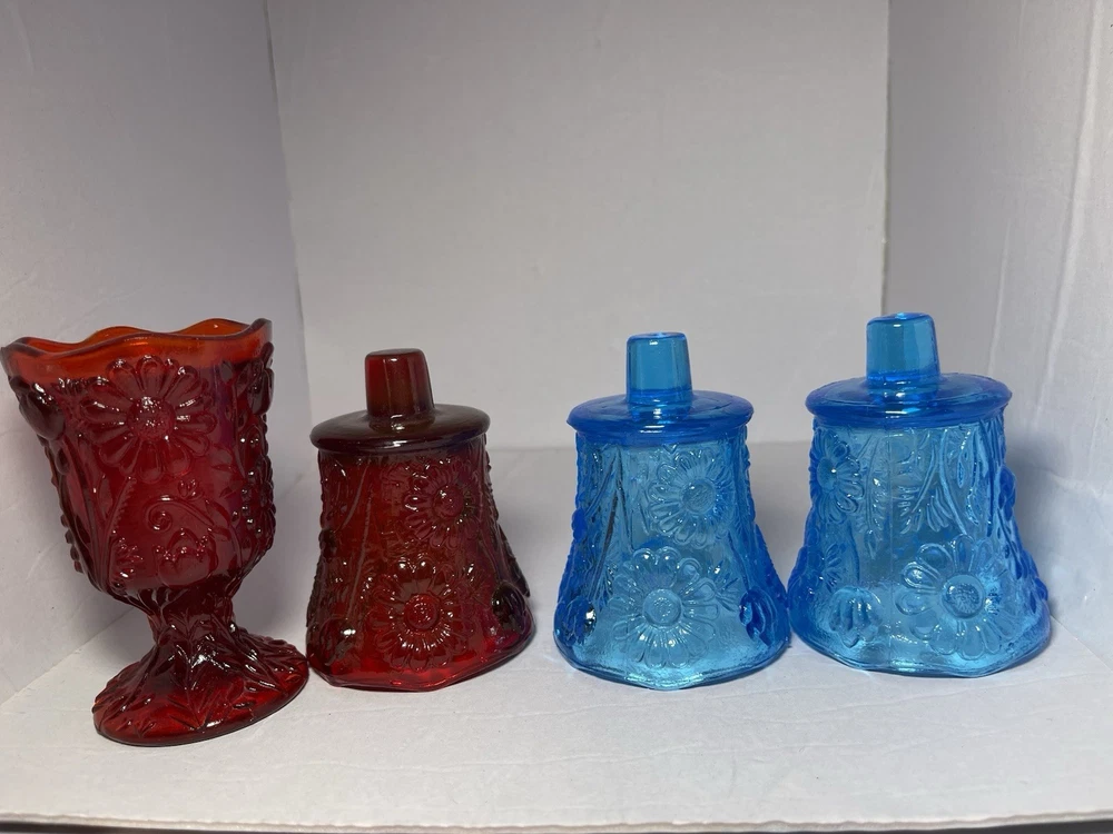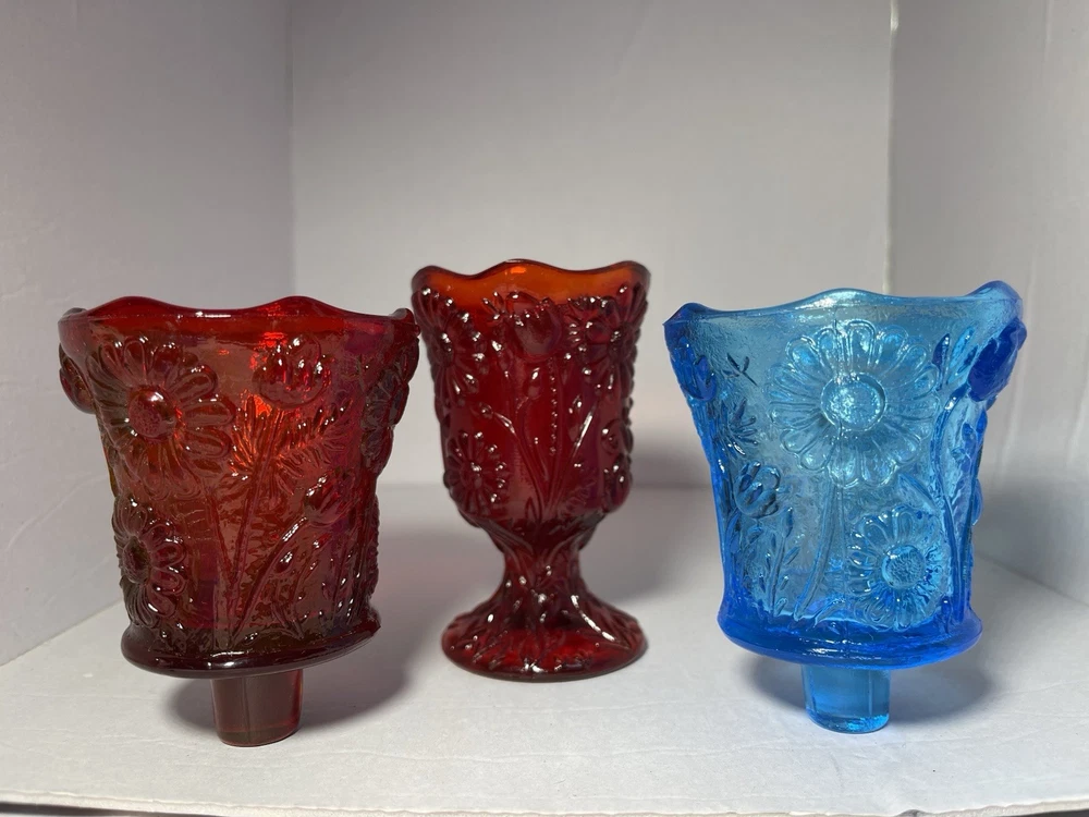This product is a set of 4 vintage Homco blue and red daisy sunflower glass peg votive candle holders. Each holder is small in size, made of glass, and suitable for mini candles, tealights, and votives. The bright red color and daisy pattern make them perfect for any room and all occasions. These original candle holders are a charming addition to any collection and are a unique decorative piece for any home.Made in the United States, these peg votive cups add a touch of vintage flair to any space. 1 red daisy candle holder with pedestal. 1 red daisy candle holder with peg, knob for wall sconces or candle holders. 2 blue daisy candle holders with peg, knob. No chips or cracks. Excellent condition! Safe shipping! Thank you!
