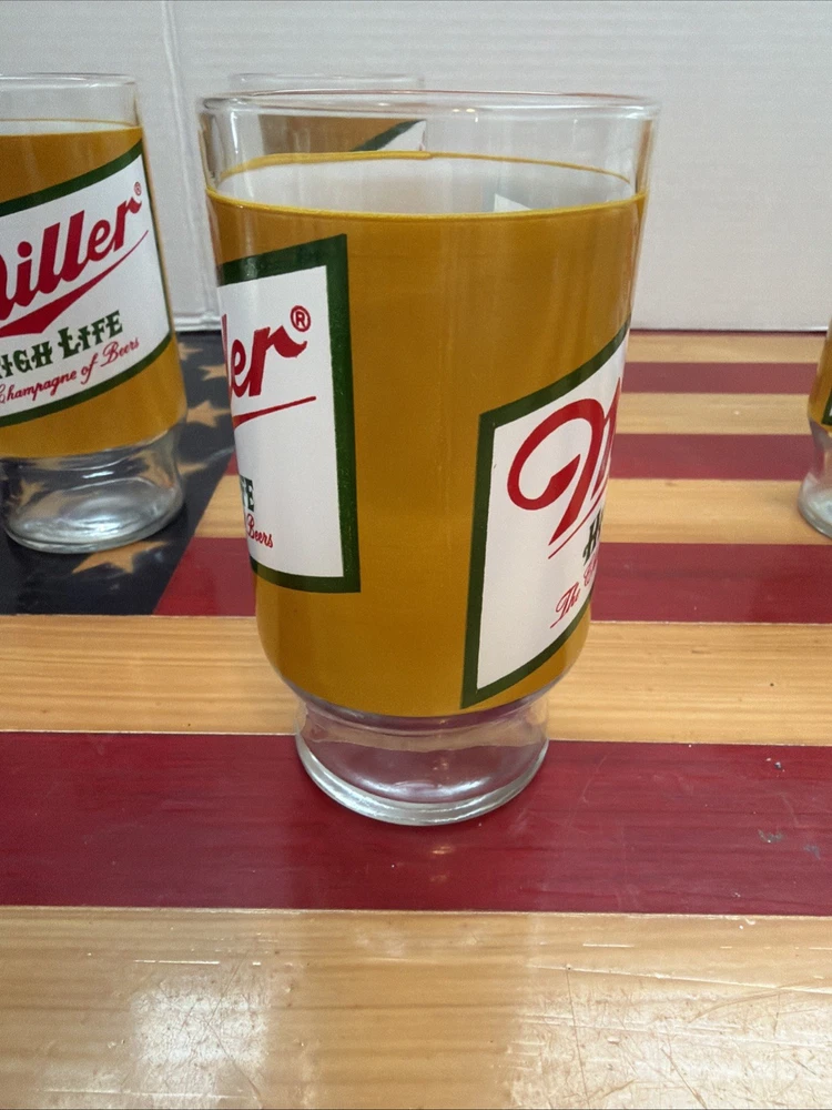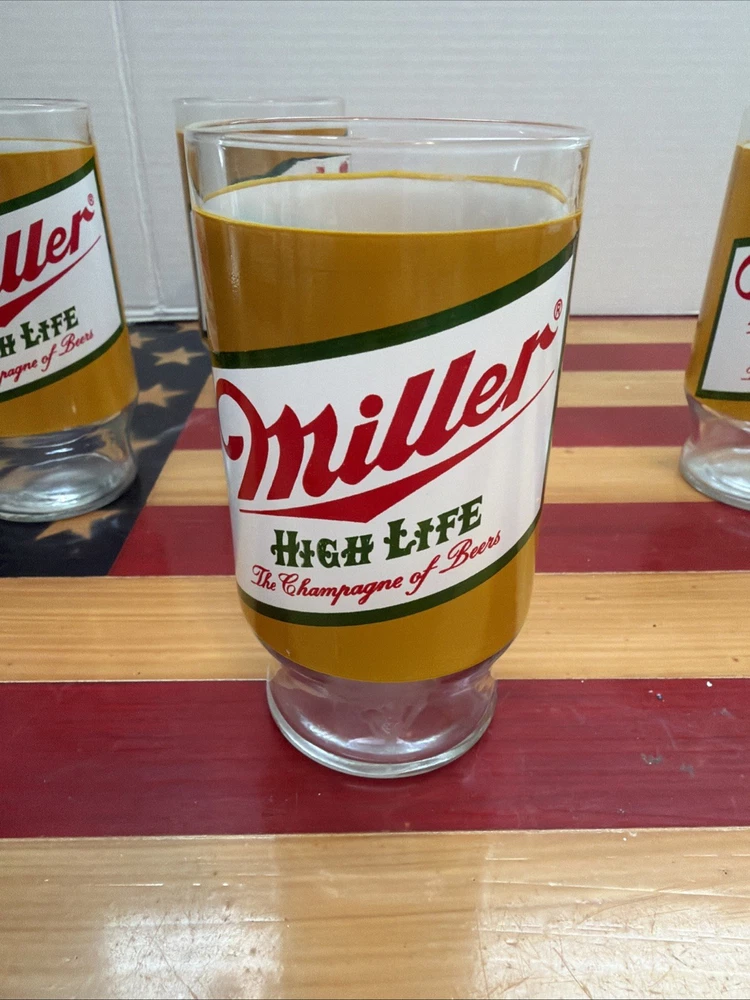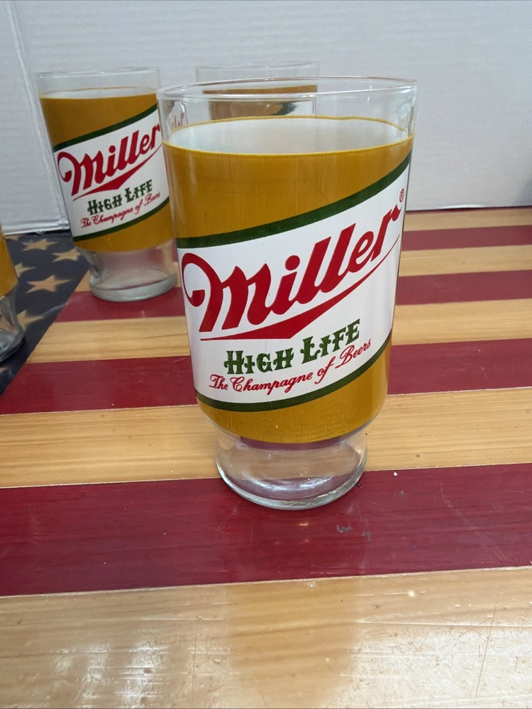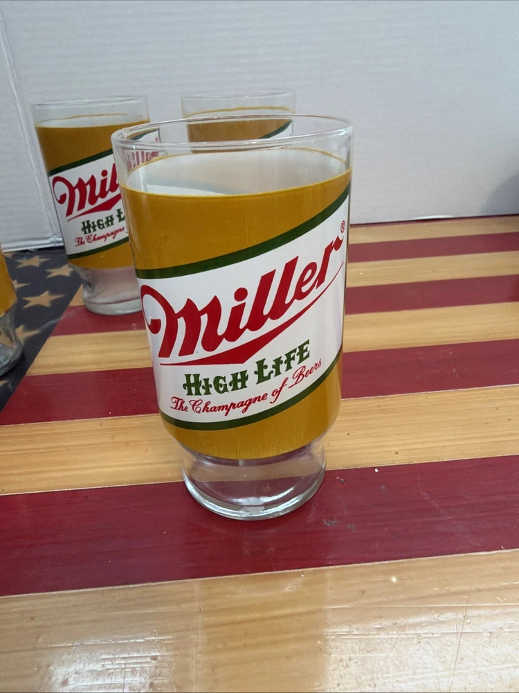The product is a set of four vintage 1980's Miller High Life beer glasses, featuring the brand's signature slogan "The Champagne of Beers." These collectible glasses are perfect for beer enthusiasts or collectors of breweriana items. The retro design and brand association make them a desirable addition to any beer memorabilia collection. Cheers to enjoying a classic beer in style with these iconic Miller High Life glasses. Small chip noted on one glass rim as depicted in picture. Two small areas on yellow area on one glass as wear as depicted in picture. Please refer to pictures for an accurate description. Thank you for looking!