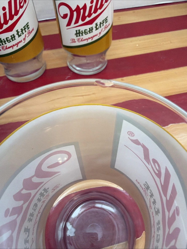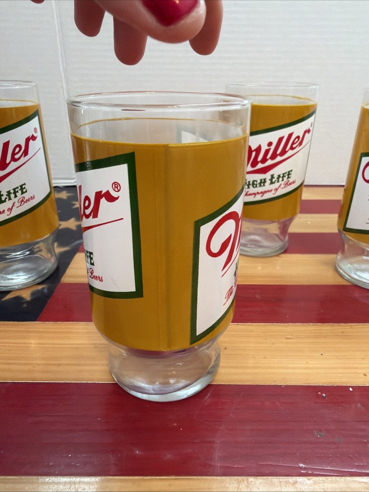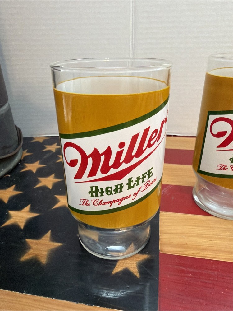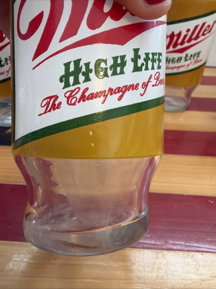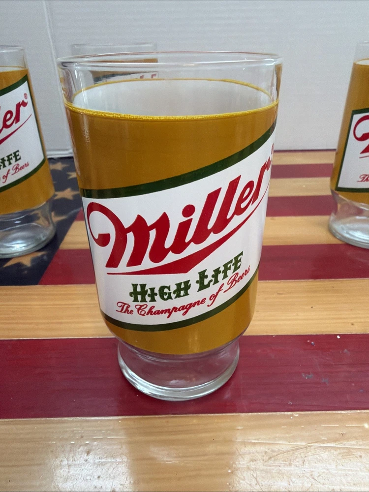The product is a set of four vintage 1980's Miller High Life beer glasses, featuring the brand's signature slogan "The Champagne of Beers." These collectible glasses are perfect for beer enthusiasts or collectors of breweriana items. The retro design and brand association make them a desirable addition to any beer memorabilia collection. Cheers to enjoying a classic beer in style with these iconic Miller High Life glasses. Small chip noted on one glass rim as depicted in picture. Two small areas on yellow area on one glass as wear as depicted in picture. Please refer to pictures for an accurate description. Thank you for looking!