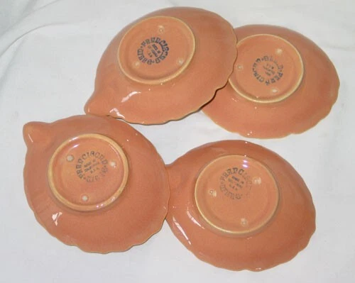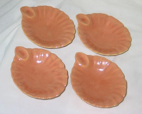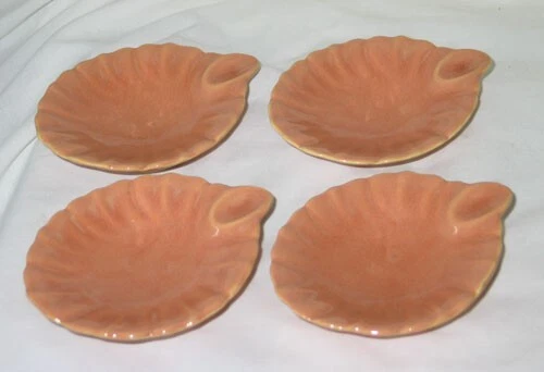Rare set of four Coronado pattern ashtrays that can also be used as butter pats, tea bag rests, or spoon holders. All are marked and all are in excellent condition without chips, cracks, flakes, or stains. Each ashtray measures a little less than 4-1/2" across. Coral color, high gloss finish.