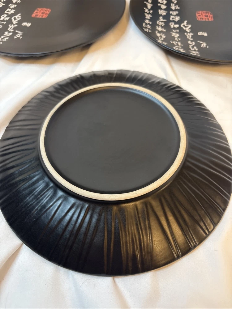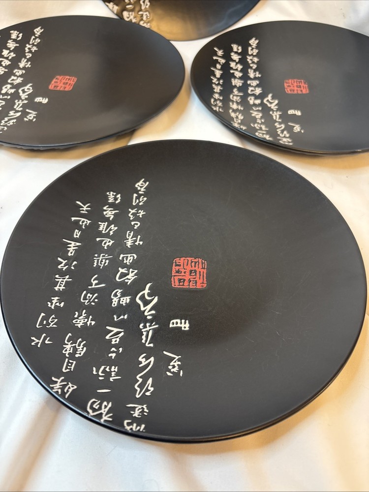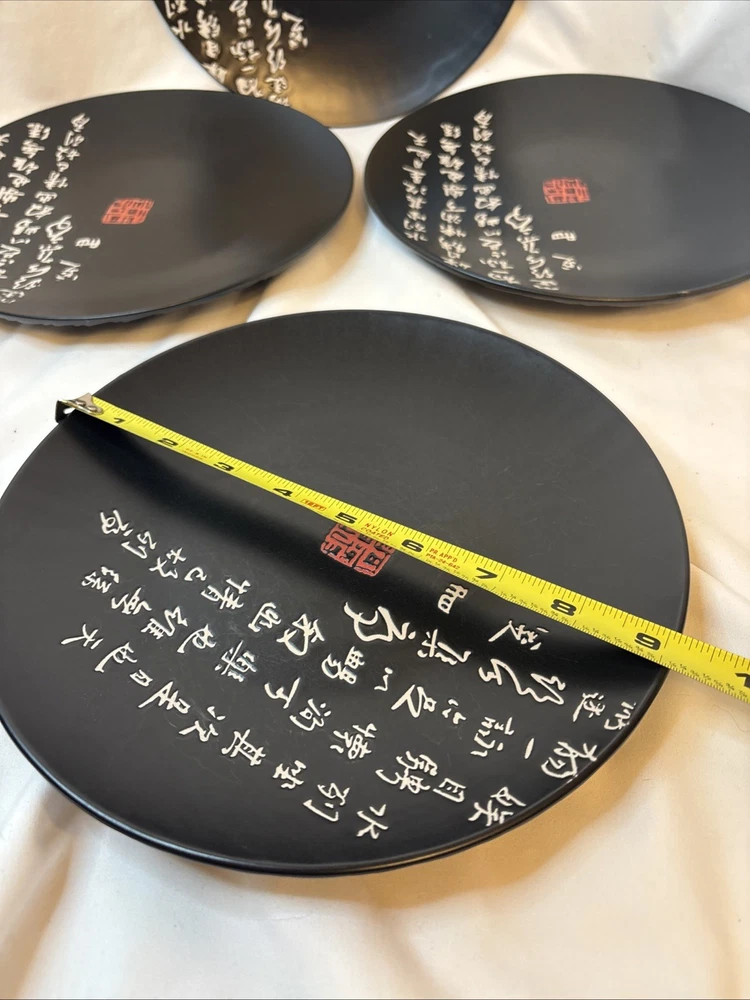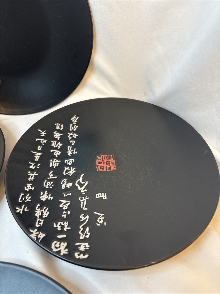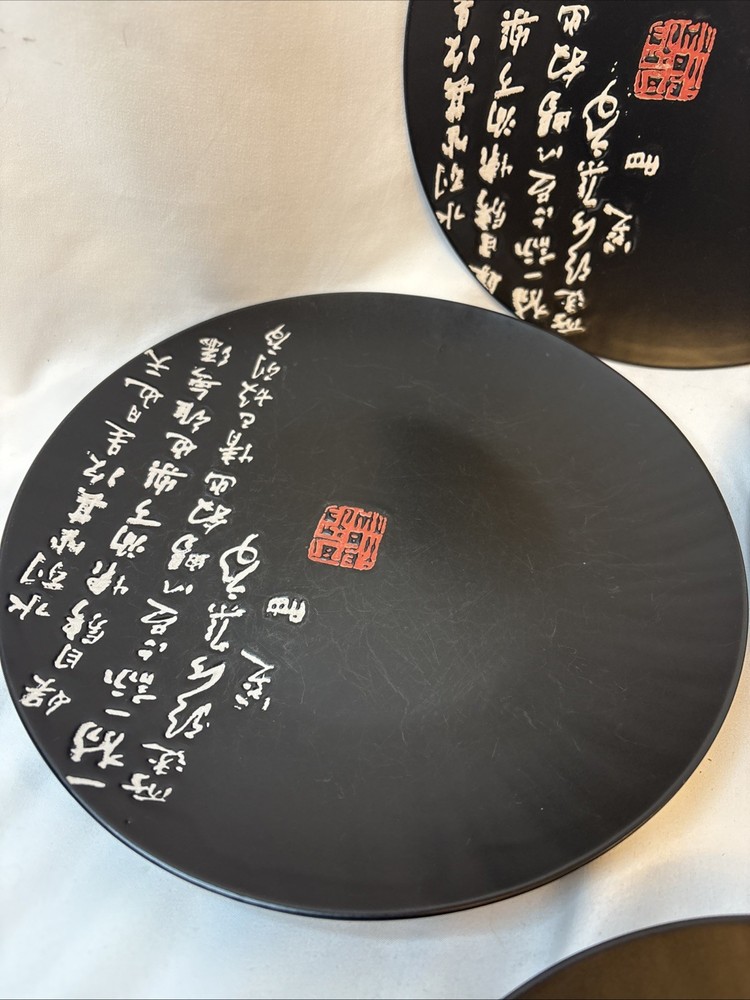 4 Vintage Kafuh Japanese Black Porcelain Plates With Inscription & Red Mark 9”. Condition is Used. Shipped with USPS Ground Advantage.